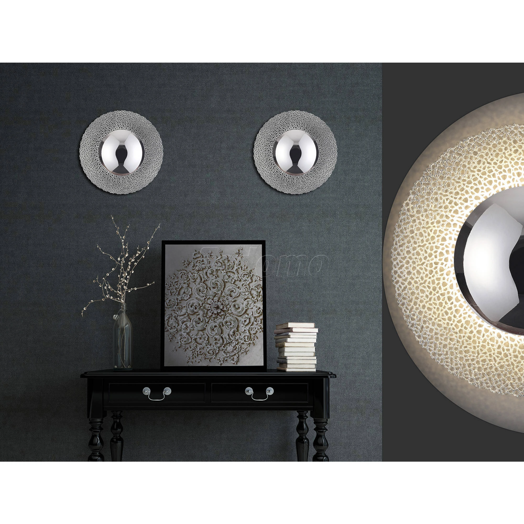 Материалы исполнения арматура, декор: металл. Цвет арматуры серебро. Плафон в цвете: серебро. В наш век технологий мы можем управлять абсолютно всем, но только не природными явлениями.Когда начинается Солнечное и Лунное затмение, многие земляне снаряжаются приборами для его созерцания, потому что оно длится всего несколько секунд! Со светодиодными светильниками Solario и Lunario Вы можете созерцать эти потрясающие явления в вашем собственном доме! Вам больше не нужно никуда спешить, просто наслаждайтесь и удивляйтесь игре светотени сколько угодно! Центральный круг выполнен из металла в золотом фольгировании/полированном хроме и обрамлен тонким металлическим кружевным диском. Цветовая температура - 3000K, что соответствует теплому белому свету. Наименование 3560/24L ODL18 000 серебряное фольгирование Н/п светильник IP20 LED 3000K 24W 1920Лм 220V LUNARIO.