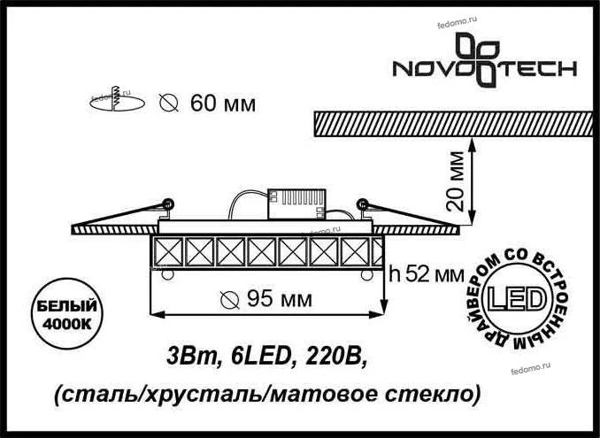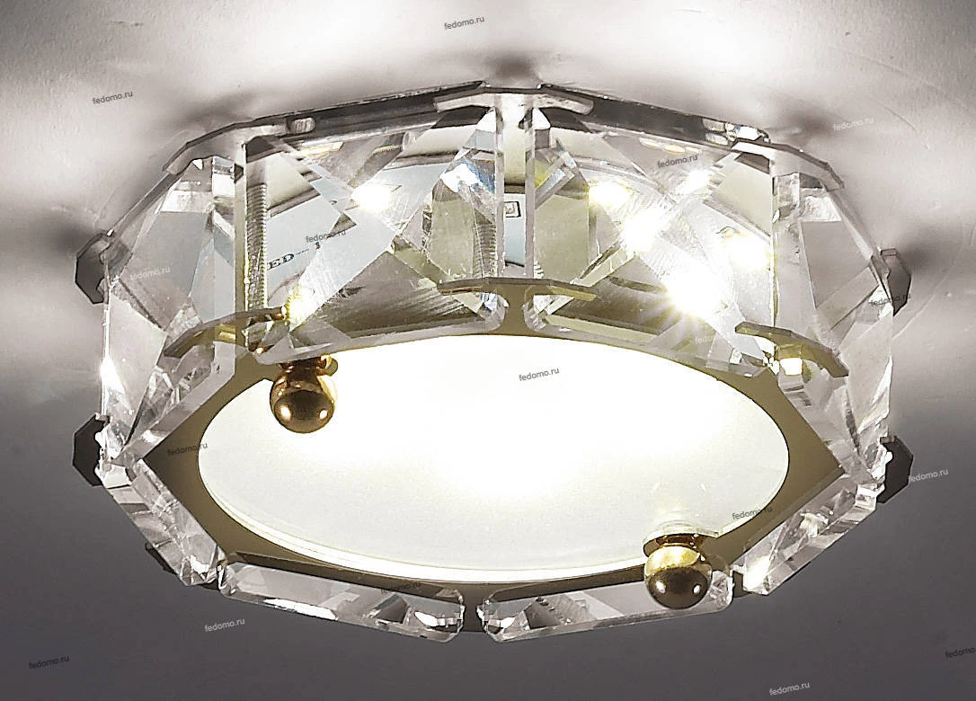 Материалы исполнения сталь/хрусталь/матовое стекло. Цвет арматуры золото. Плафон в цвете: прозрачный. Светильник сделан из стали. Её главным преимуществом является большой период эксплуатации. Сталь по праву можно считать "вечным" материалом. Так же преимуществами являются устойчивость к химическим, атмосферным и механическим воздействиям и эстетичный внешний вид. Благодаря зеркальной полировке, обеспечивается высокая стойкость металла к коррозии. Рассеиветель - матовое стекло. Стекло экологично, не тускнеет и не меняет своего оттенка со временем, не покрывается некрасивым налетом и легко выдерживает перепады температур. Декоративное украшение произведено из хрусталя. Он обладает высоким показателем плотности, прозрачности и блеска. Благодаря содержанию свинца (не менее 30%) и определённому подбору углов, образуемых гранями, изделия из хрусталя отличаются необыкновенно яркой, многоцветной игрой света, чарующей магией красоты, совершенства и роскоши. Наименование 357149 NT15 433 золото Встраиваемый светильник IP20 LED 4000K 3W 220V NEVIERA.