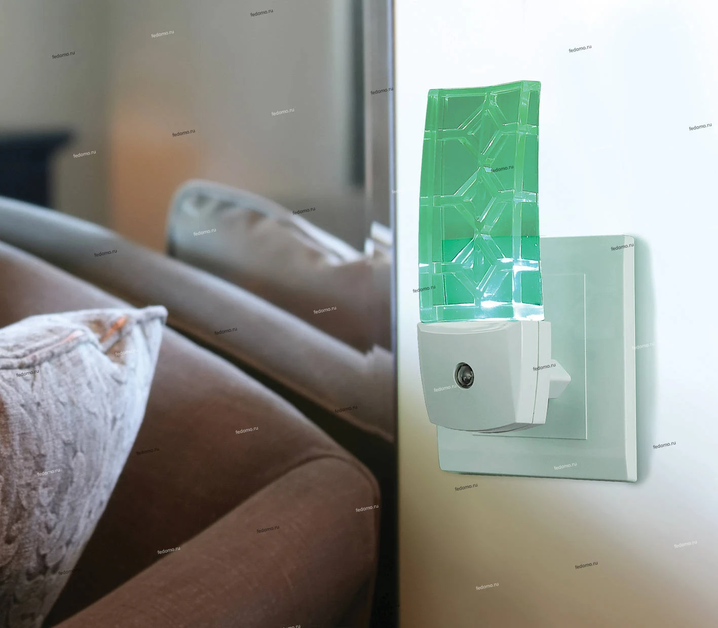 Материалы исполнения пластик поликарбонат. Цвет арматуры белый. Плафон в цвете: зеленый. Корпус светильника сделан из пластика ПК. Преимуществами данного материала являются: 1. Химическая инертность – материал устойчив к воздействию кислот и щелочей, продуктов нефтепереработки; 2. Устойчивость к воздействию влаги; 3. Ударопрочность; 4. Долговечность; 5. Ровная поверхность Датчик света (датчик освещённости) – свет включается при наступлении темноты и недостаточном освещении. Наименование 357330 NT16 207 белый/зел Светильник-ночник (в розетку) с датчиком IP20 LED 9000К 0.5W 220V NIGHT LI.