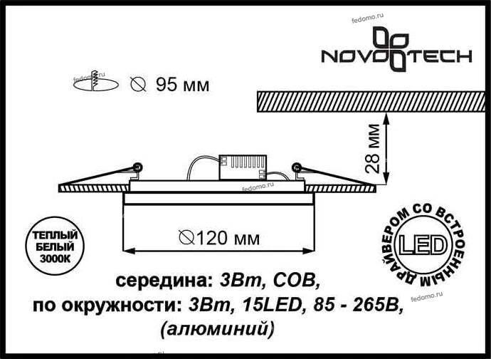 Точечный светильник встроенный 357350 из серии GESSO от компании Novotech удачно впишется в интерьер кафе, кухни, оформленных в стиле минимализм. Светодиодный светильник имеет 1 плафон и 15 светодиодов напряжением 220V, цветовой температурой 3000К и теплое белое свечение. Светильник устанавливается на распорную пружину. Основной цвет и материал арматуры - белый металл. В комплекте лампочки, драйвер. Габариты модели: диаметр - 120 мм. Лучшая цена и условия доставки на Novotech 357350 в интернет-магазине Fedomo.ru.