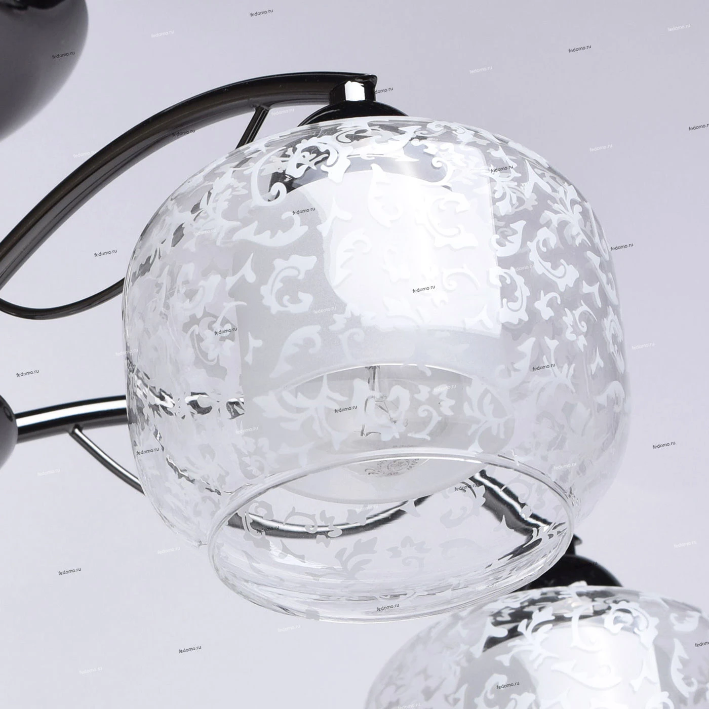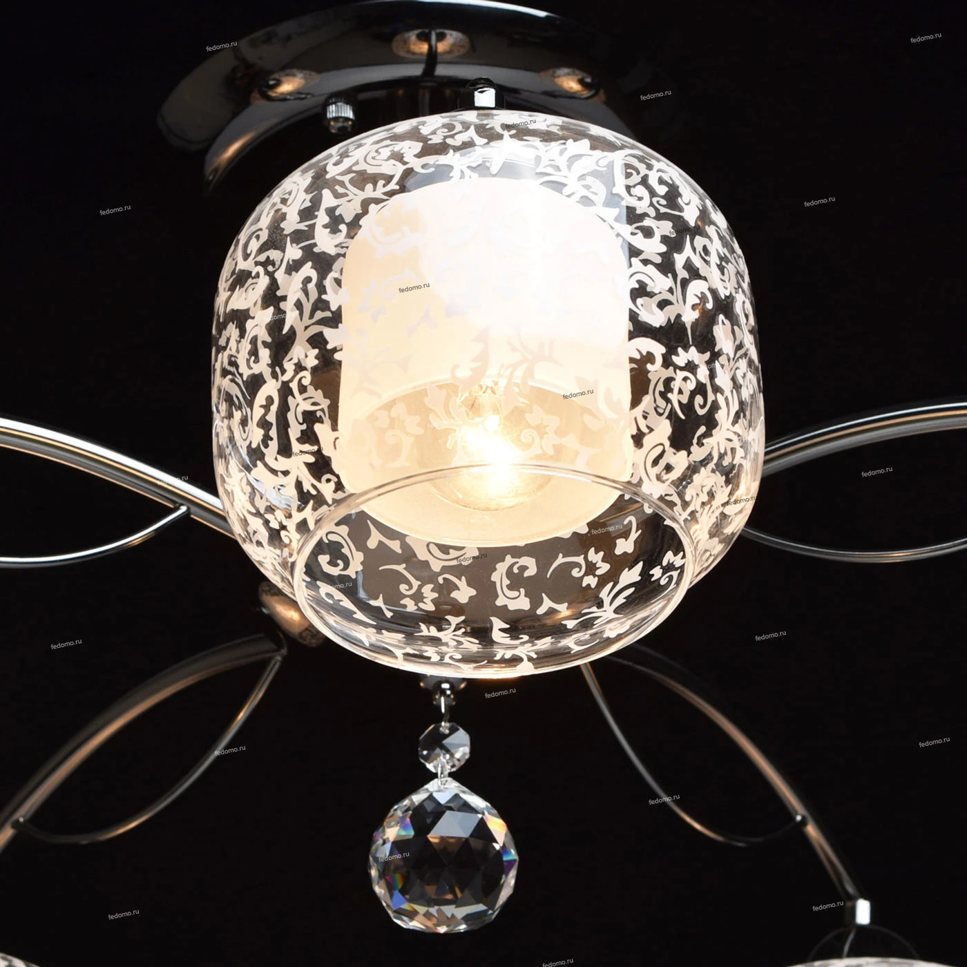 Металлическое основание цвета никель, двойные плафоны из прозрачного стекла с растительным трафаретным рисунком и внутренний матовый плафон, декоративная подвеска из хрусталя