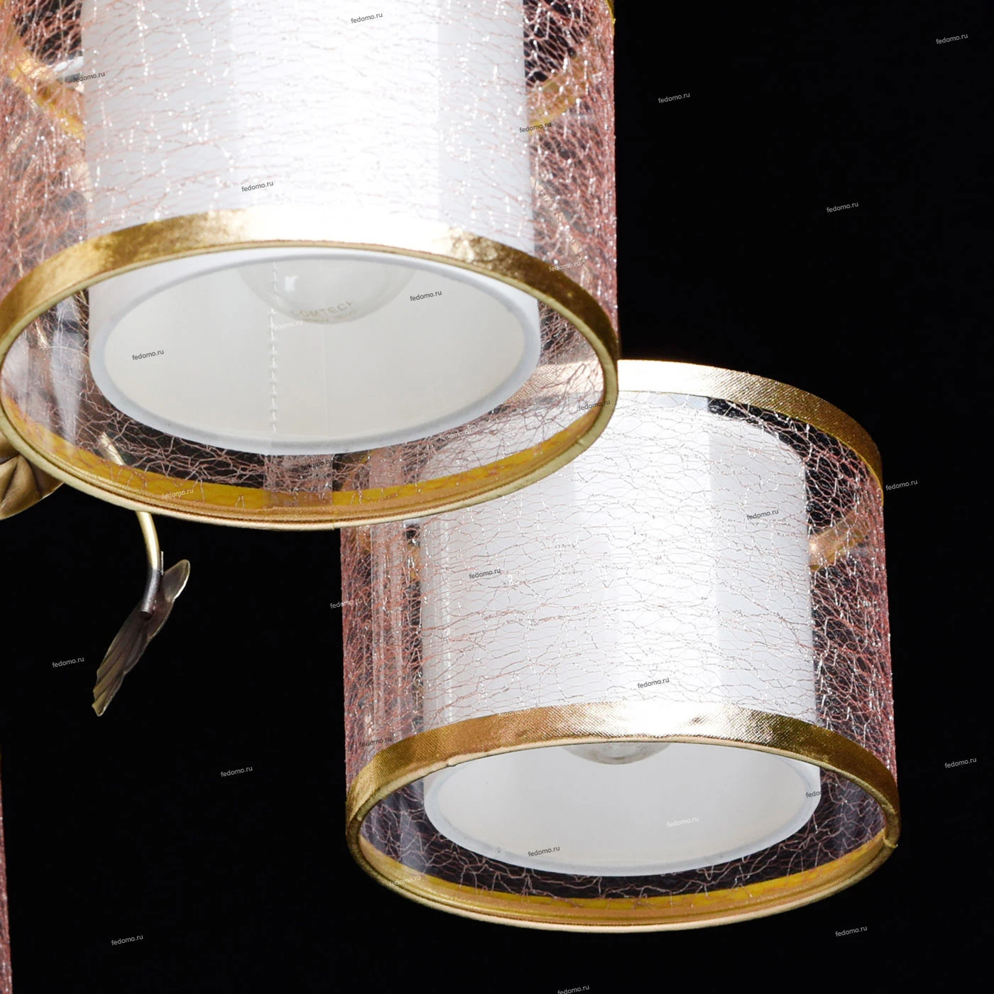 Металлическое основание цвета бронзы, двойные плафоны, из текстиля белого цвета и акрила, декорированный металлизированной нитью и кантом золотистого цвета