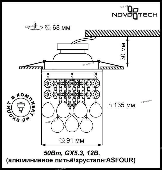 Материалы исполнения алюминиевое литье/хрусталь ASFOUR. Цвет арматуры золото. Плафон в цвете: прозрачный. Основание светильника – алюминиевое литьё. Это сплав, основными достоинствами которого являются — устойчивость к практически всем видам негативного воздействия окружающей среды, коррозии, небольшой вес, по сравнению с другими видами металла и экологическая безопасность материала. Декоративные подвески изготовлены из хрусталя ASFOUR, содержащего не менее 35 % окиси свинца. За исключением алмазов и других драгоценных камней, ни один материал не способен столь эффективно разложить луч света на цвета спектра, как хрусталь ASFOUR. В хрустале ASFOUR отсутствуют дефекты типа прожилок или пузырьков, поэтому он прозрачнее воздуха и воды. Столь высокое качество достигается благодаря использованию тщательно отобранного сырья и оригинальных производственных методик. Блеск хрусталя ASFOUR не потускнеет с течением времени. Каждая грань навсегда останется столь же точной; сам материал никогда не утратит своей чистоты и прозрачности. Благодаря фирменной технологии отделки, применяемой при изготовлении хрусталя ASFOUR,. Наименование 369329 NT09 276 золото/прозрачный Встраиваемый светильник IP20 GX5.3 50W 12V DROP.