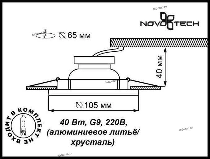 Точечный светильник встроенный 369412 из серии Cosmo от компании Novotech удачно впишется в интерьер кафе, кухни, оформленных в стиле модерн. Светильник имеет 1 плафон и 1 лампочку с цоколем G9 с мощностью 40W, напряжением 220V. Модель поддерживает подключение диммера. Светильник устанавливается на распорную пружину. Основной цвет и материал арматуры - металл цвета хрома, материал плафона - стекло. Лампочки имеются в комплекте. Габариты модели: высота - 80 мм, диаметр - 105 мм. Лучшая цена и условия доставки на Novotech 369412 в интернет-магазине Fedomo.ru.