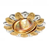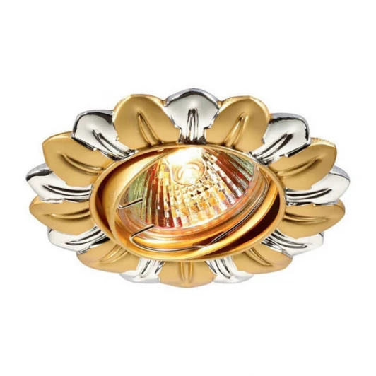 Материалы исполнения алюминиевое литье. Цвет арматуры золото. Плафон в цвете: золото. Угол повората 45 градусов. Светильник сделан из алюминиевого литья. Это сплав, основными достоинствами которого являются — устойчивость к практически всем видам негативного воздействия окружающей среды, коррозии, небольшой вес, по сравнению с другими видами металла и экологическая безопасность материала. Простота монтажа. Экономичность. Надёжность. Большой срок службы. Возможность реализации оригинальных дизайнерских решений за счет гибкости и небольшой толщины. Срок службы светодиодов - 25000 часов. !!!Предупреждение: Ленту запрещается резать, чтобы не нарушать герметичность конструкции. В комплект не входит элемент питания. Наименование 369819 NT12 364 хром/золото Встраиваемый ПВ светильник IP20 GX5.3 50W 12V FLOWER.