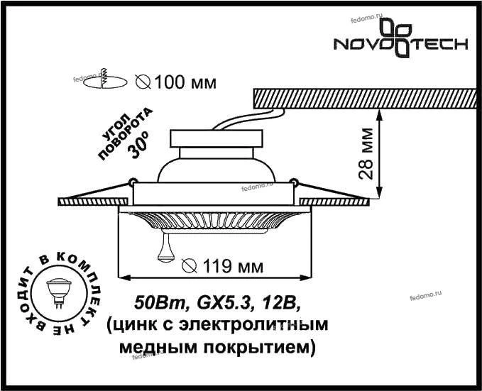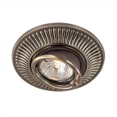 Материалы исполнения цинк с электролитным медным покрытием. Цвет арматуры бронза. Плафон в цвете: бронзовый. Угол повората 30 градусов. Светильник произведен из сплава цинка. Благодаря сравнительно высоким механическим и литейным качествам, изделия, выполненные из сплава цинка, отличаются высокой точностью деталей декора со сложной конфигурацией. Так же он обладает антикоррозийными свойствами. Наименование 369858 NT14 228 бронза Встраиваемый ПВ светильник IP20 GX5.3 50W 12V VINTAGE.