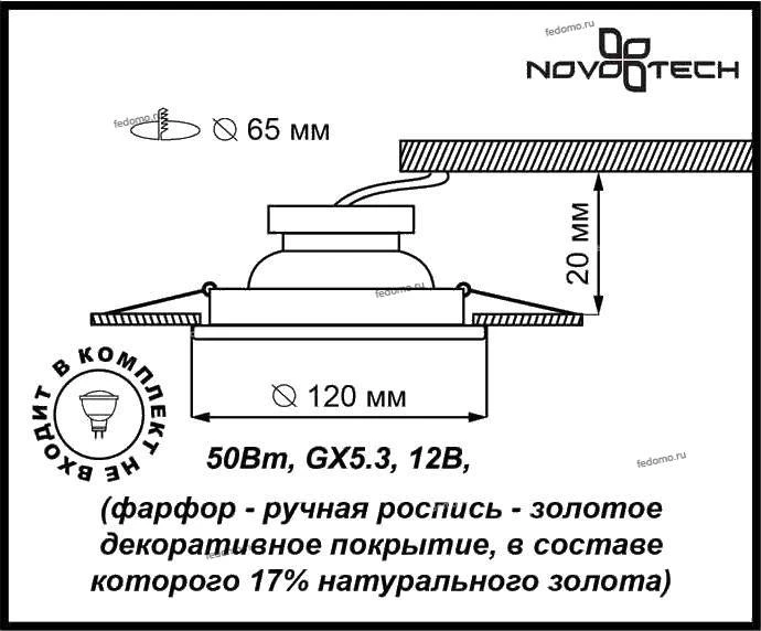 Материалы исполнения фарфор - ручная роспись - золотое декоративное покрытие, в составе которого 17% натурального золота. Цвет арматуры белый. Плафон в цвете: белый. Светильник сделан из фарфора. Основным его преимуществом является то, что со временем он не теряет своих качеств, таких как крепость, плотность, прочность, блеск и полупрозрачность. Не подвластен фарфор и коррозии. Термин «staffage» (от немецкого слова «staffieren», означающего одевать, наряжать, украшать) обозначает искусство украшения фарфора путем ручной росписи или металлической отделки (золотой, серебряной или платиновой). Такие «украшательства» придают светильнику, сделанному из фарфора, неповторимое очарование и романтичность. Наименование 369869 NT14 255 белый/золото Встраиваемый светильник IP20 GX5.3 50W 12V FARFOR.