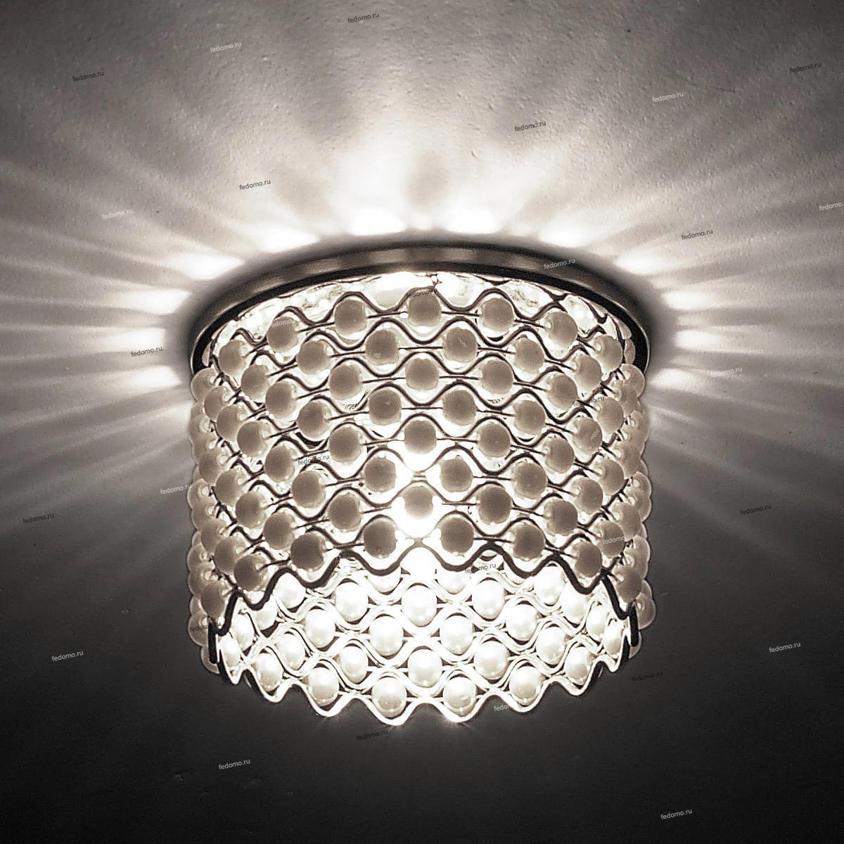 Материалы исполнения металл/искусственный жемчуг. Цвет арматуры хром. Плафон в цвете: хром. Светильник сделан из металла. Это популярный и востребованный материал благодаря ряду качеств. К ним относится: повышенная прочность, износостойкость и долговечность. Декоративная отделка - искусственный жемчуг. Он отличается ярким блеском и идеальной формой бусин, по своей красоте не уступая настоящему и при электрическом освещении дает красивый эффект преломления света. Наименование 369888 NT14 288 хром Встраиваемый светильник IP20 G9 40W 220V PEARL.