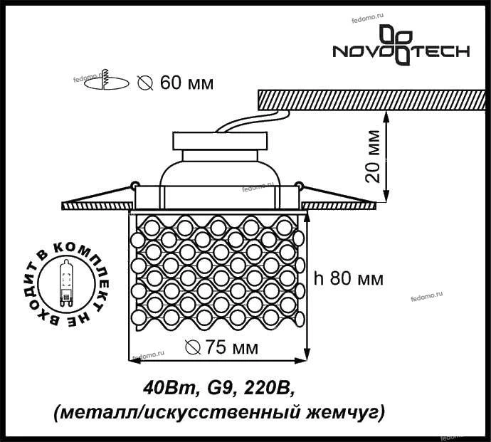 Точечный светильник встроенный 369890 из серии Pearl от компании Novotech удачно впишется в интерьер кафе, кухни, оформленных в стиле модерн. Светильник имеет 1 плафон и 1 лампочку с цоколем G9 с мощностью 40W, напряжением 220V. Модель поддерживает подключение диммера. Светильник устанавливается на распорную пружину. Основной цвет и материал арматуры - белый металл, материал плафона - металл, жемчуг. Лампочки имеются в комплекте. Габариты модели: высота - 80 мм, диаметр - 75 мм. Лучшая цена и условия доставки на Novotech 369890 в интернет-магазине Fedomo.ru.