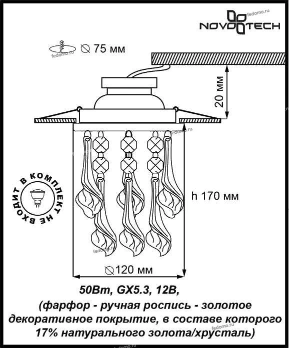 Материалы исполнения фарфор - ручная роспись - золотое декоративное покрытие, в составе которого 17% натурального золота/хрусталь. Цвет арматуры белый. Плафон в цвете: прозрачный. Светильник сделан из фарфора. Основным его преимуществом является то, что современем он нетеряет своих качеств, таких как крепость, плотность, прочность, блеск иполупрозрачность. Неподвластен фарфор икоррозии. Термин «staffage» (отнемецкого слова «staffieren», означающего одевать, наряжать, украшать) обозначает искусство украшения фарфора путем ручной росписи илиметаллической отделки (золотой, серебряной или платиновой). Такие «украшательства» придают светильнику, сделанному из фарфора, неповторимое очарование и романтичность. Декоративные подвески сделаны из хрусталя. Он обладает высоким показателем плотности, прозрачности и блеска. Благодаря содержанию свинца (не менее 30%) и определённому подбору углов, образуемых гранями, изделия из хрусталя отличаются необыкновенно яркой, многоцветной игрой света, чарующей магией красоты, совершенства и роскоши. Наименование 369961 NT15 258 белый зол.декор/прозр.хрусталь Встраиваемый светильник IP20 GX5.3 50W 12V PENDANT.