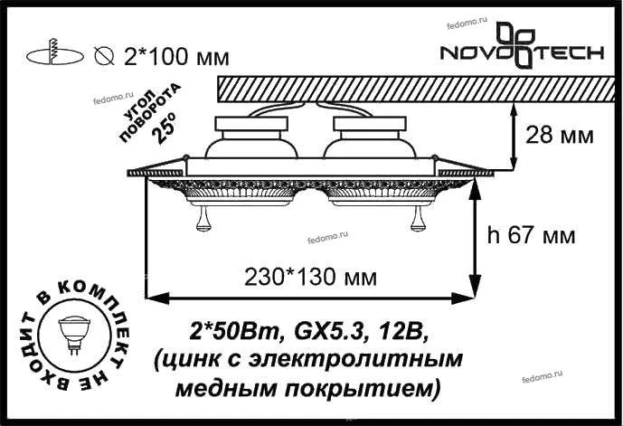 Материалы исполнения корпус - цинк с электролитным медным покрытием. Цвет арматуры коричневый. Плафон в цвете: коричневый. Угол повората 25 градусов. Светильник сделан из сплава цинка. Благодаря сравнительно высоким механическим и литейным качествам, изделия, выполненные из сплава цинка, отличаются высокой точностью деталей декора со сложной конфигурацией. Так же он обладает антикоррозийными свойствами. Наименование 370014 NT15 459 коричневый/золото Встраиваемый светильник IP20 GX5.3 2*50W 12V VINTAGE.