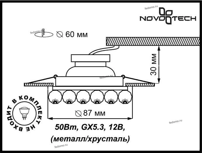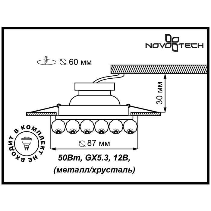 Точечный светильник встроенный 370225 из серии Maliny от компании Novotech удачно впишется в интерьер кафе, кухни, оформленных в стиле модерн. Светильник имеет 1 плафон и 1 лампочку с цоколем GX5.3 с мощностью 50W, напряжением 12V. Светильник устанавливается на распорную пружину. Основной цвет и материал арматуры - металл цвета хрома, хрусталь. Габариты модели: высота - 47 мм, диаметр - 87 мм. Лучшая цена и условия доставки на Novotech 370225 в интернет-магазине Fedomo.ru.