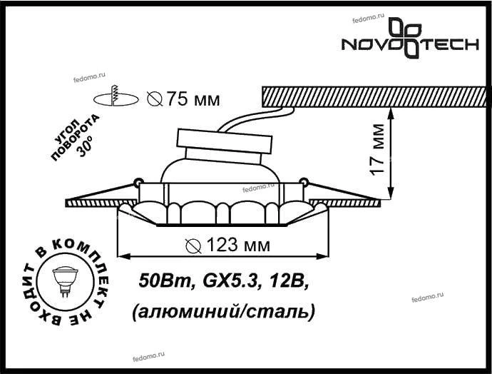 Точечный светильник встроенный 370282 из серии Ligna от компании Novotech удачно впишется в интерьер кафе, кухни, оформленных в стиле модерн. Светильник имеет 1 плафон и 1 лампочку с цоколем GX5.3 с мощностью 50W, напряжением 12V. Модель с направленным светом поддерживает подключение диммера. Светильник устанавливается на распорную пружину. Основной цвет и материал арматуры - золотистый металл. Лампочки в комплект не входят. Габариты модели: диаметр - 123 мм. Лучшая цена и условия доставки на Novotech 370282 в интернет-магазине Fedomo.ru.