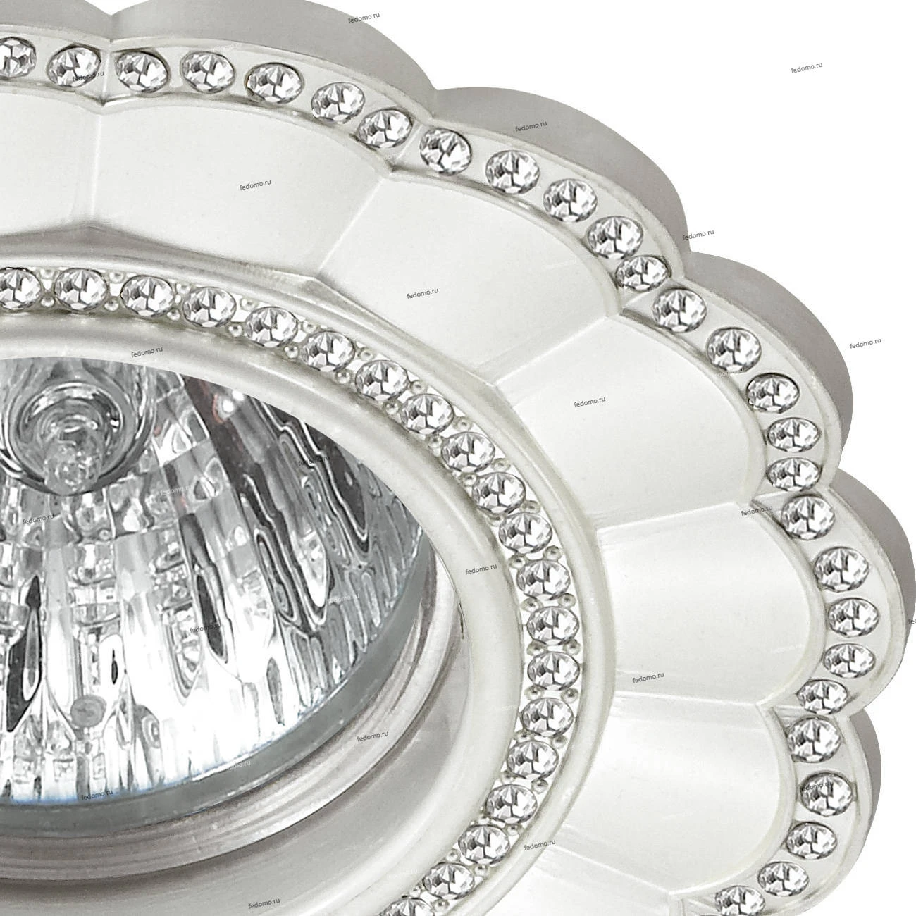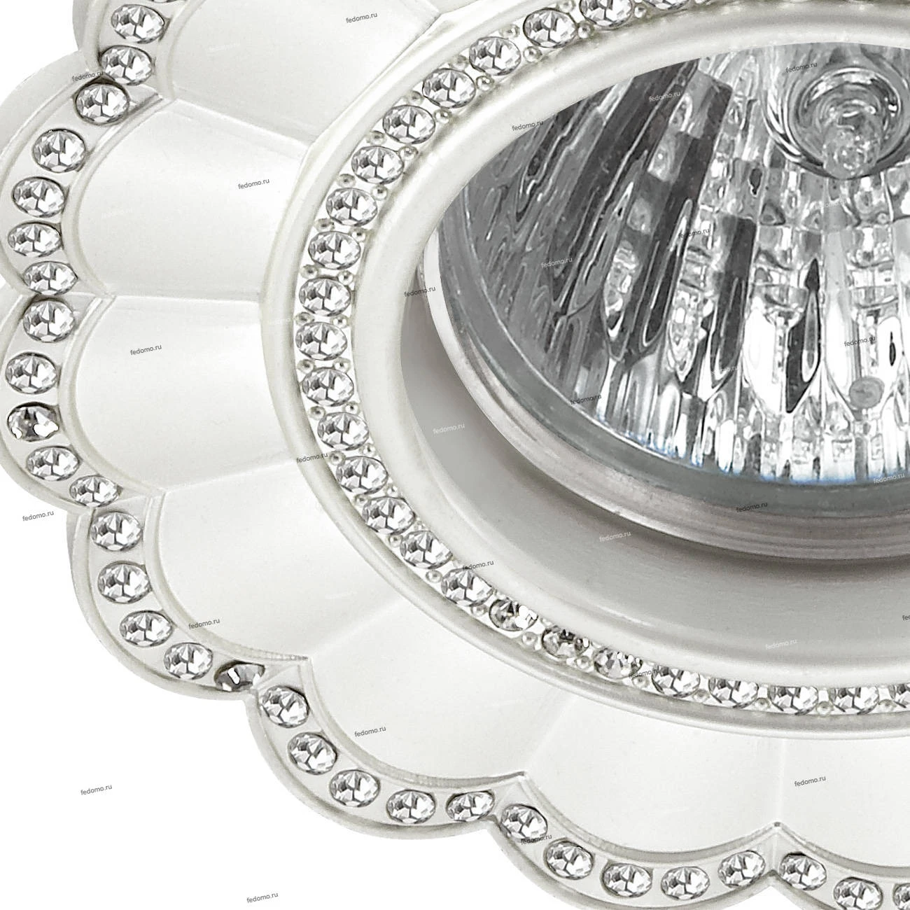 Материалы исполнения сплав цинка/хрусталь. Цвет арматуры белый. Плафон в цвете: белый. Классический встраиваемый светильник, выполнен в античном стиле. Он отличается простотой и ясностью композиции, а благодаря разнообразной цветовой гамме, он станут прекрасным украшением любого интерьера. Наименование 370345 NT17 269 перламутровый Встраиваемый декоративный светильник GX5.3 50W 12V CANDI.