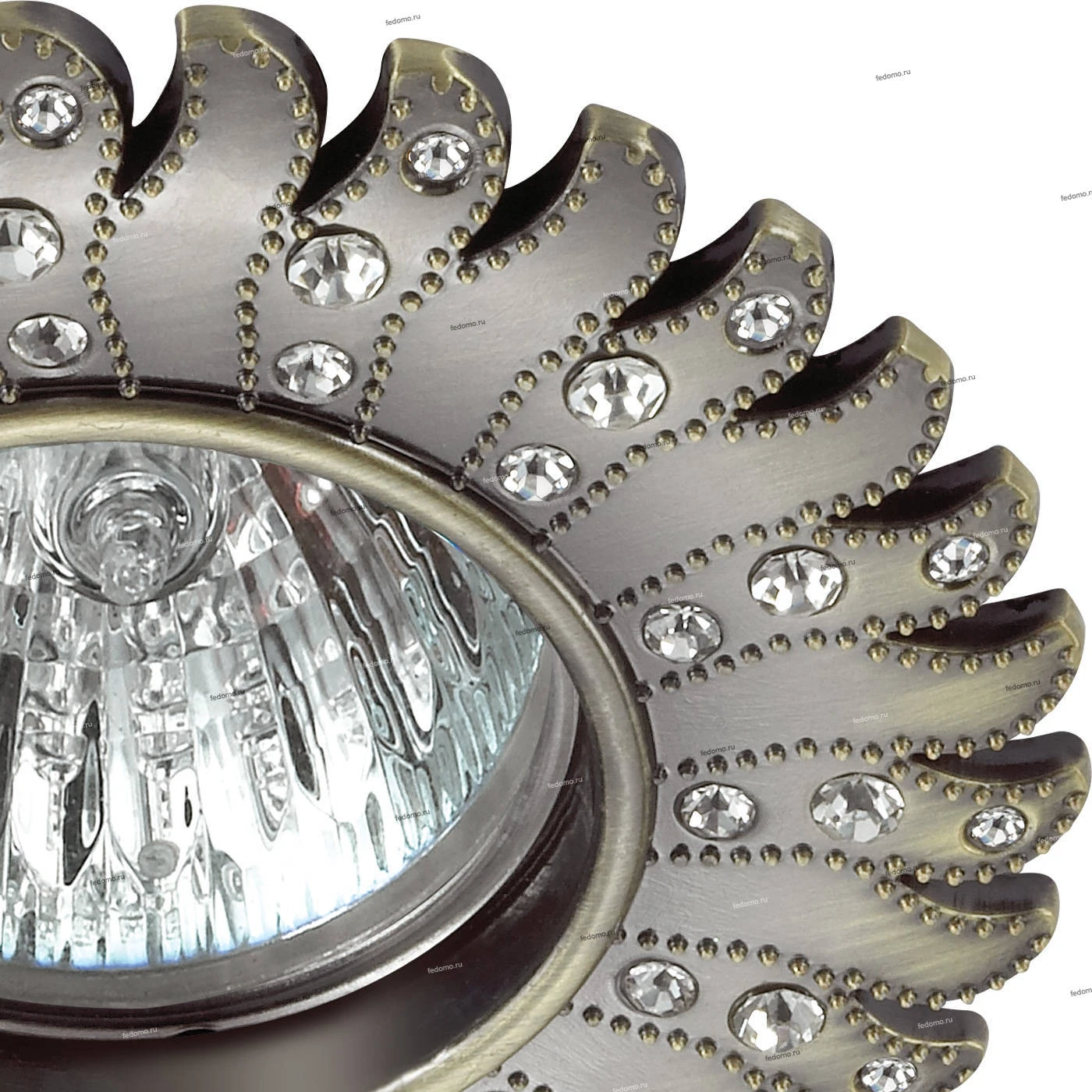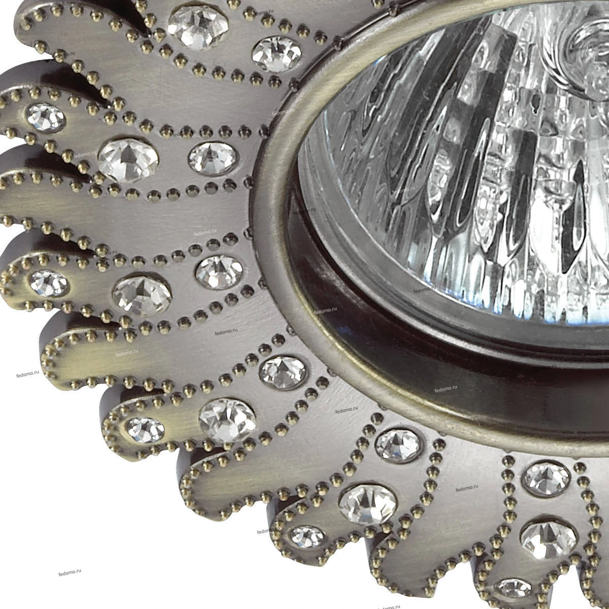 Материалы исполнения сплав цинка/хрусталь. Цвет арматуры бронза. Плафон в цвете: бронзовый. Классический встраиваемый светильник, выполнен в античном стиле. Он отличается простотой и ясностью композиции, а благодаря разнообразной цветовой гамме, он станут прекрасным украшением любого интерьера. Наименование 370356 NT17 265 бронза Встраиваемый декоративный светильник GX5.3 50W 12V CANDI.