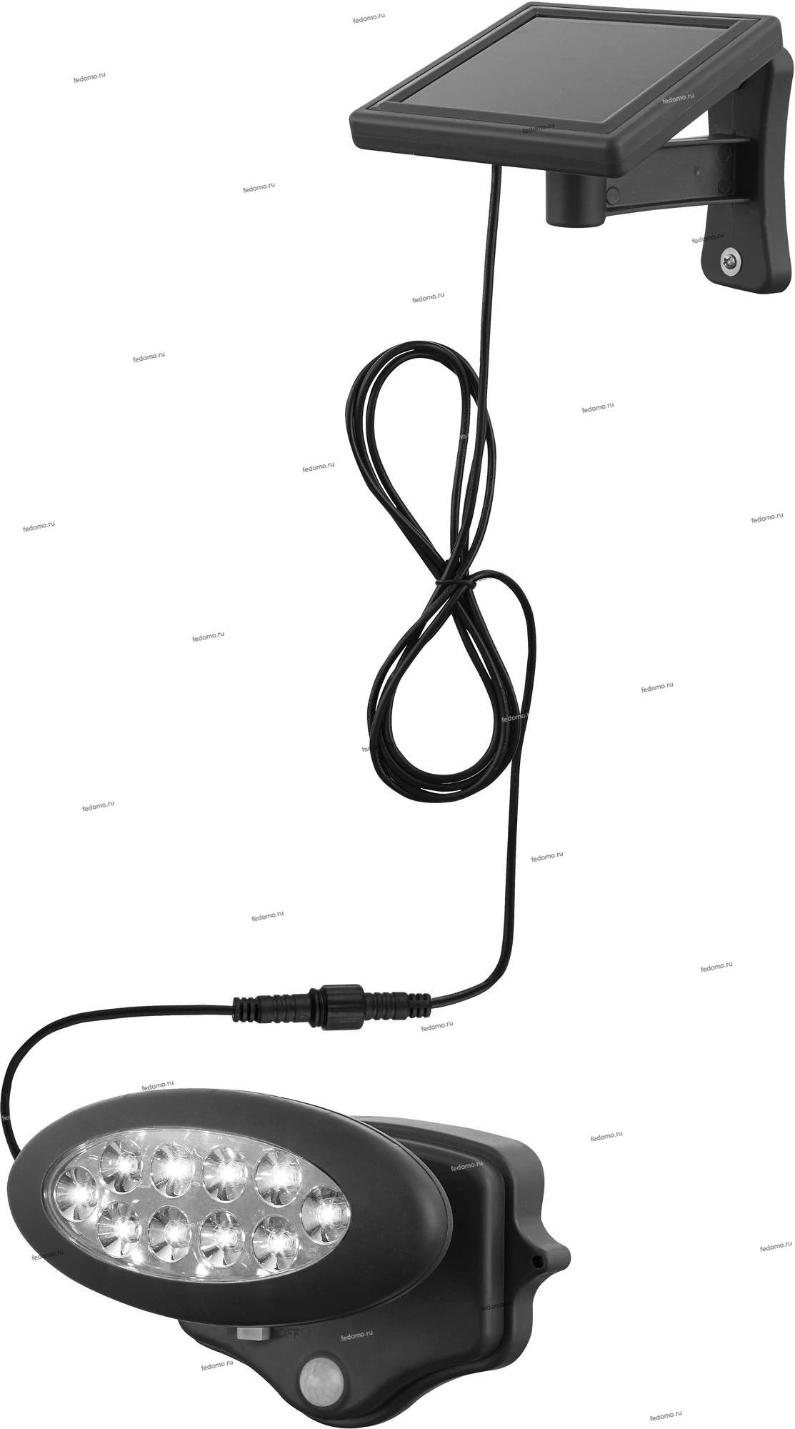 Солнечные батареи (150x200 мм) с проводом 3 м, аккумулятор Li-on (время работы без подзарядки 6 часов). Датчик движения: 110 °, диапазон: 4-10 м, 90 сек.