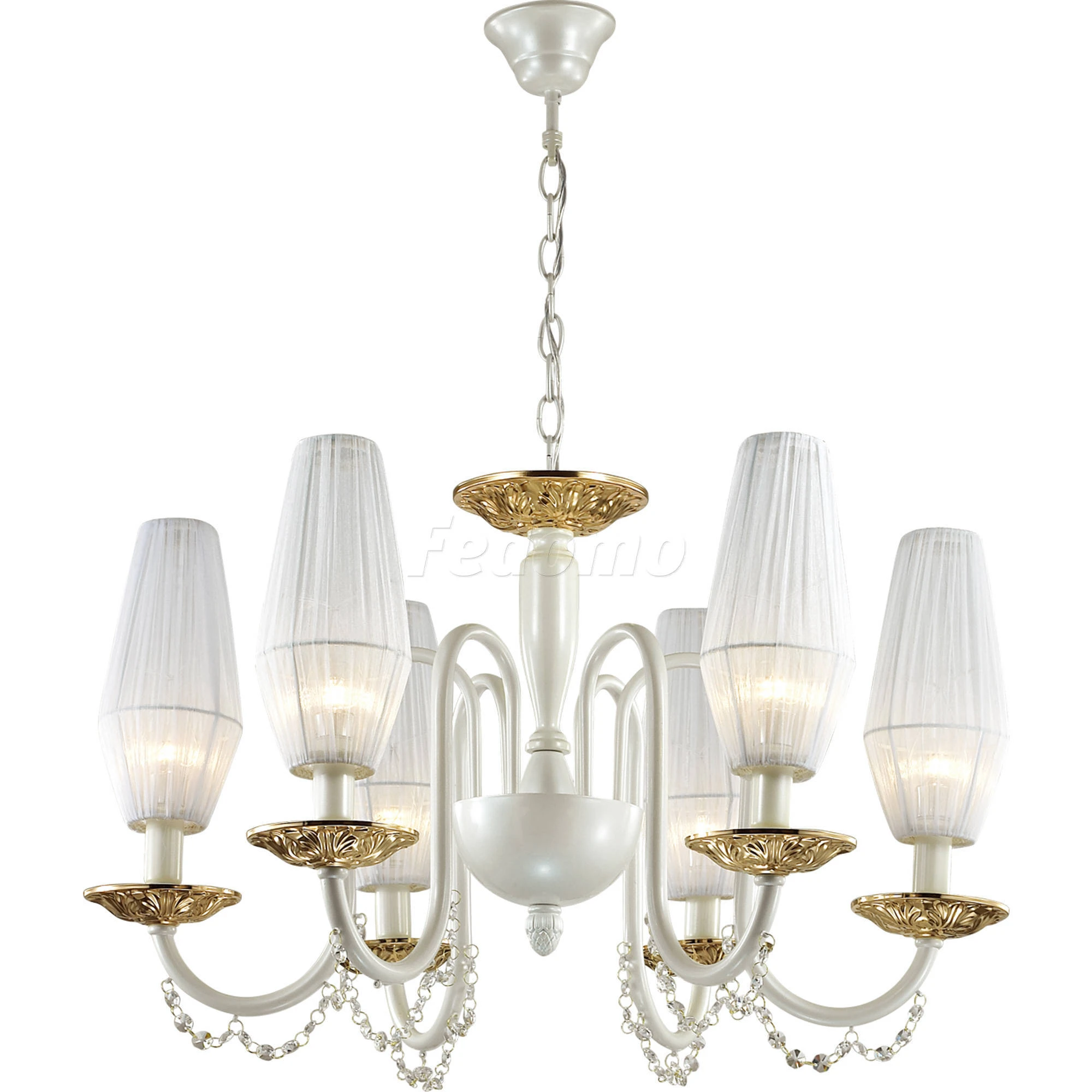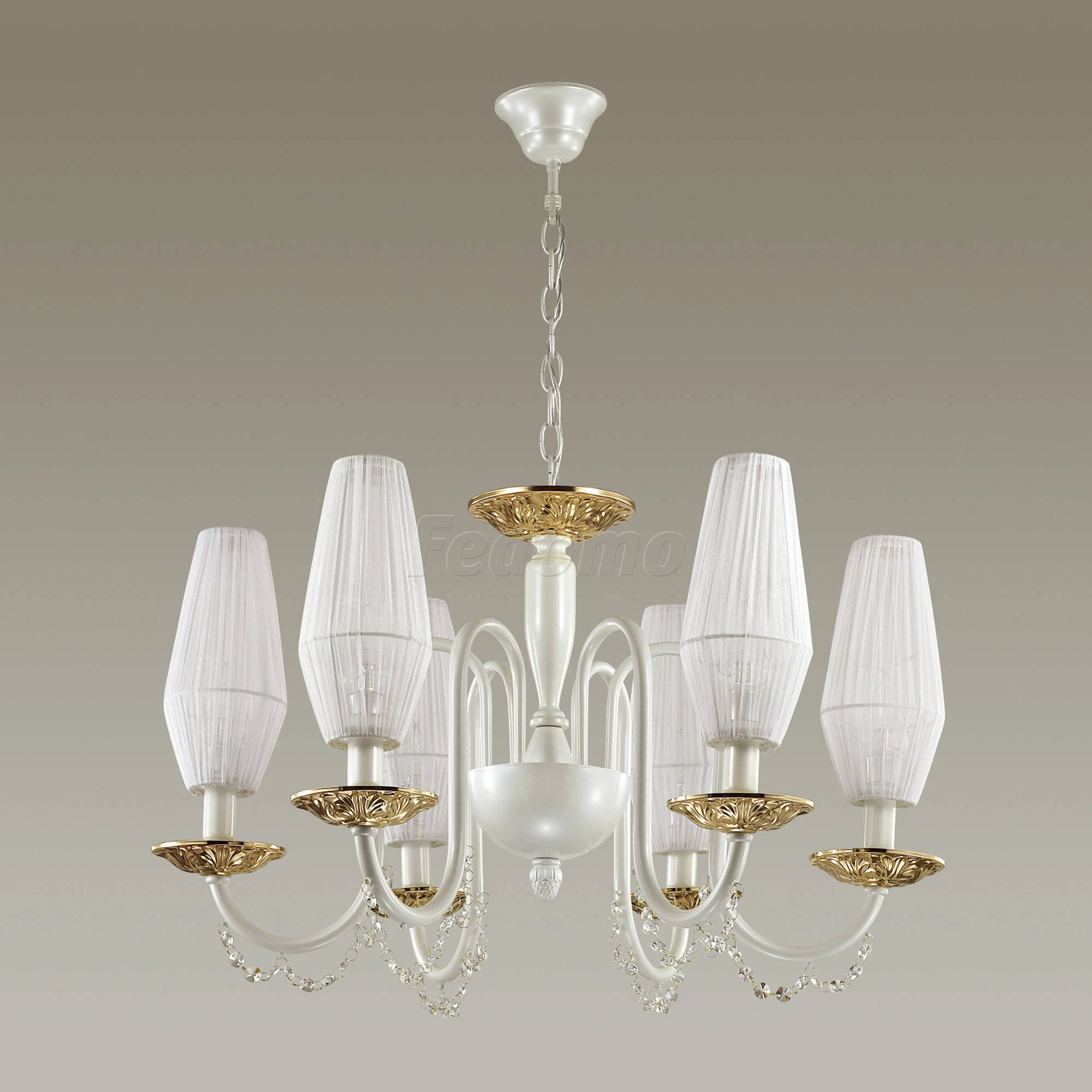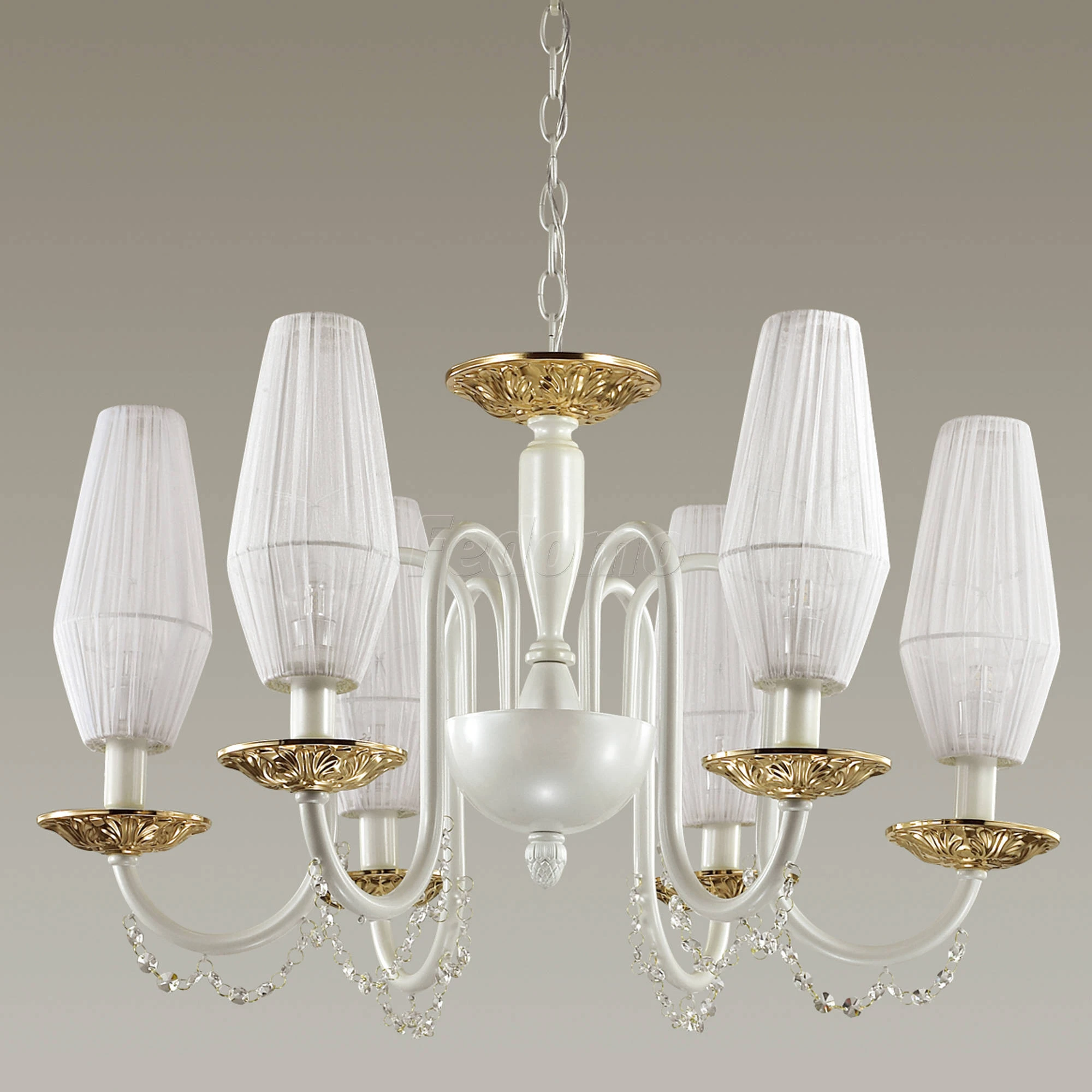 Материалы исполнения арматура, декор: металл, хрусталь; абажур: ткань. Цвет арматуры белый. Плафон в цвете: белый. Декор подвеска, материал декора хрусталь, цвет прозрачный. Люстра 3919/6 серии Felicia выполнена в классическом стиле. Основание светильника окрашено в изысканный перламутровый цвет. Люстру украшают утонченные белоснежные абажуры, изящный металлический декор в золотом цвете, а также хрусталь высшего качества в цвете шампань. Все это придает светильнику роскошный, но в то же время очень нежный и утонченный образ. Цоколь E14. Мощность 6*40W. Нет ламп в комплекте. Наименование 3919/6 ODL18 366 перламутр/зол/ткань/хрусталь Люстра IP20E14 6*40W 220V FELICIA.