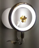 Материалы исполнения арматура, декор: металл, стеклянные подвески; плафон: алюминий, акрил. Цвет арматуры хром. Плафон в цвете: разноцветный. Особенность: для использования со скрытой проводкой. Декор декоративная арматура, подвеска, материал декора металл, стекло, цвет золото. Яркое и эффектное бра 4036/6WL серии Fiuggi выполнено в стиле модерн. Бра состоит из небольшого кольца, расположенного на металлическом основании. С внешней стороны плафон обрамлен широким кольцом золотого цвета, внутри яркая светодиодная подсветка. Основание плафона обвито тонкой изящной веткой, украшенной изысканным хрусталем и золотистым цветком. Эти элементы придают строгому и современному дизайну нотку нежности, свежести и очарования. Цоколь LED. Мощность 6W. Наименование 4036/6WL ODL18 060 белый/хром/золото Бра IP20 LED 6W 12V FIUGGI.
