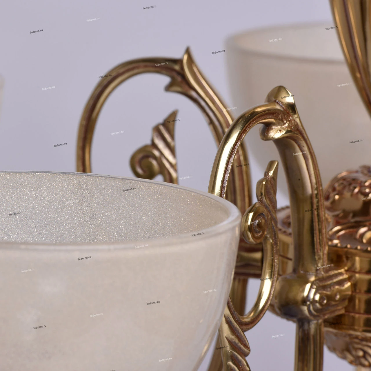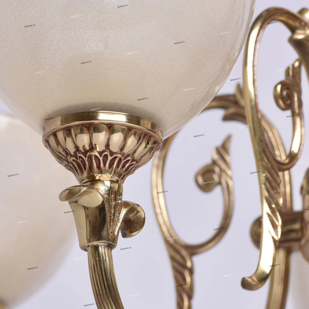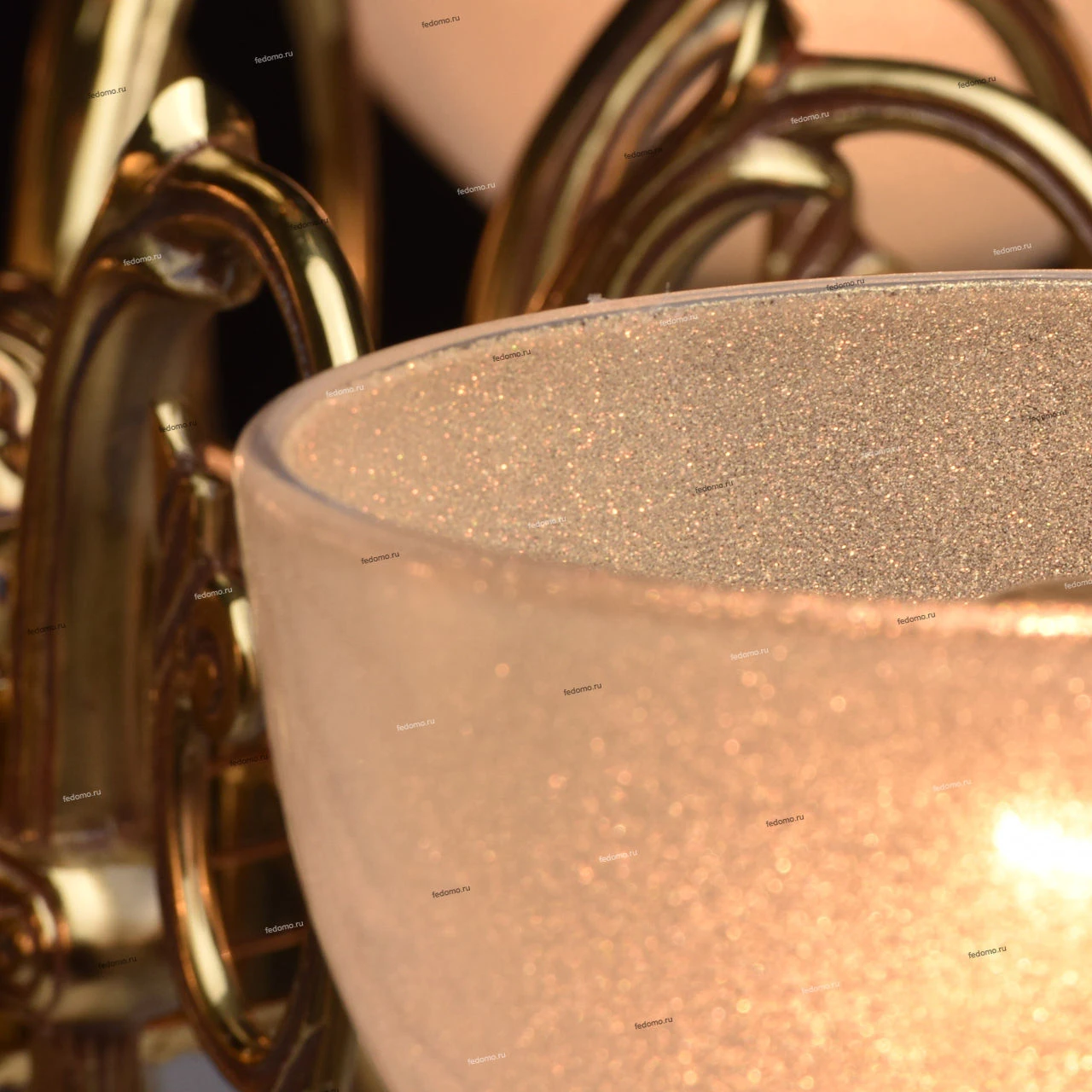 Арматура светильника выполнена из латуни. Светильник декорирован элементами художественного литья из бронзы. Плафоны светильника выполнены из стекла слегка окрашенного в массе в золотистый цвет и декорированы хрустальной крошкой изнутри.