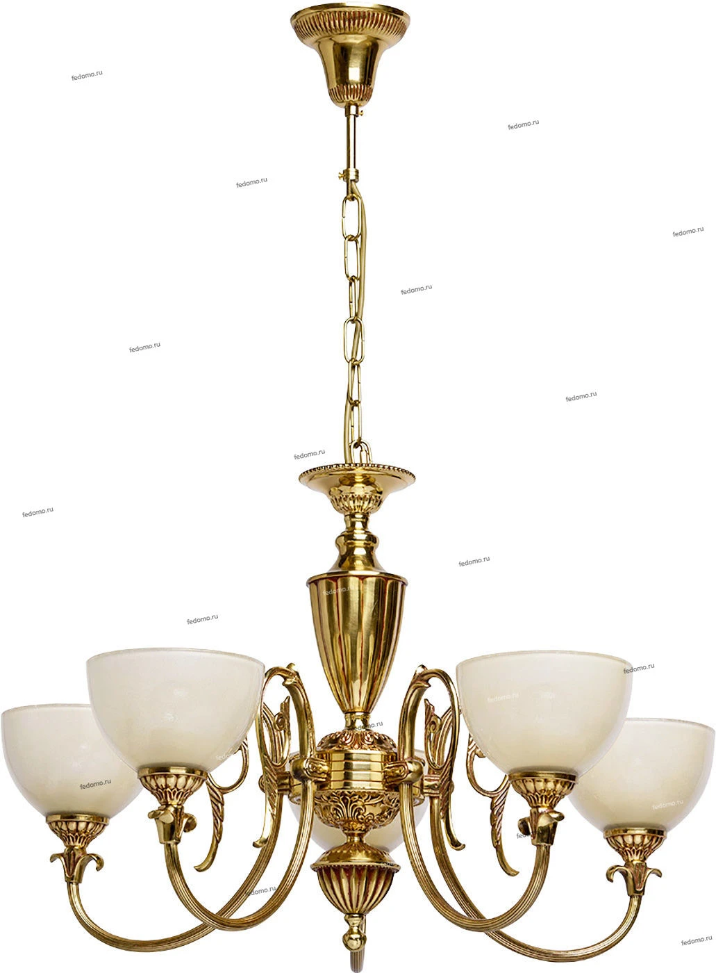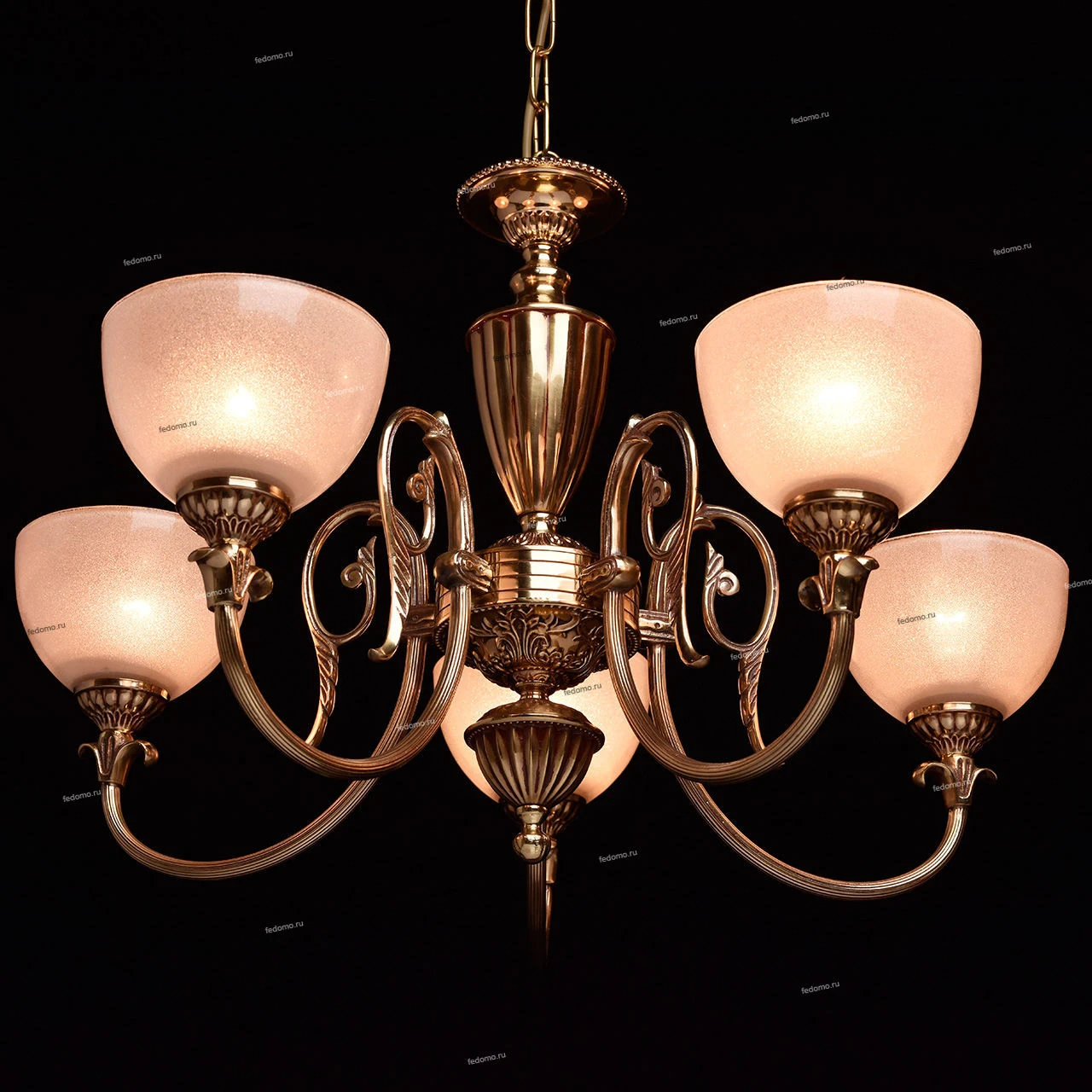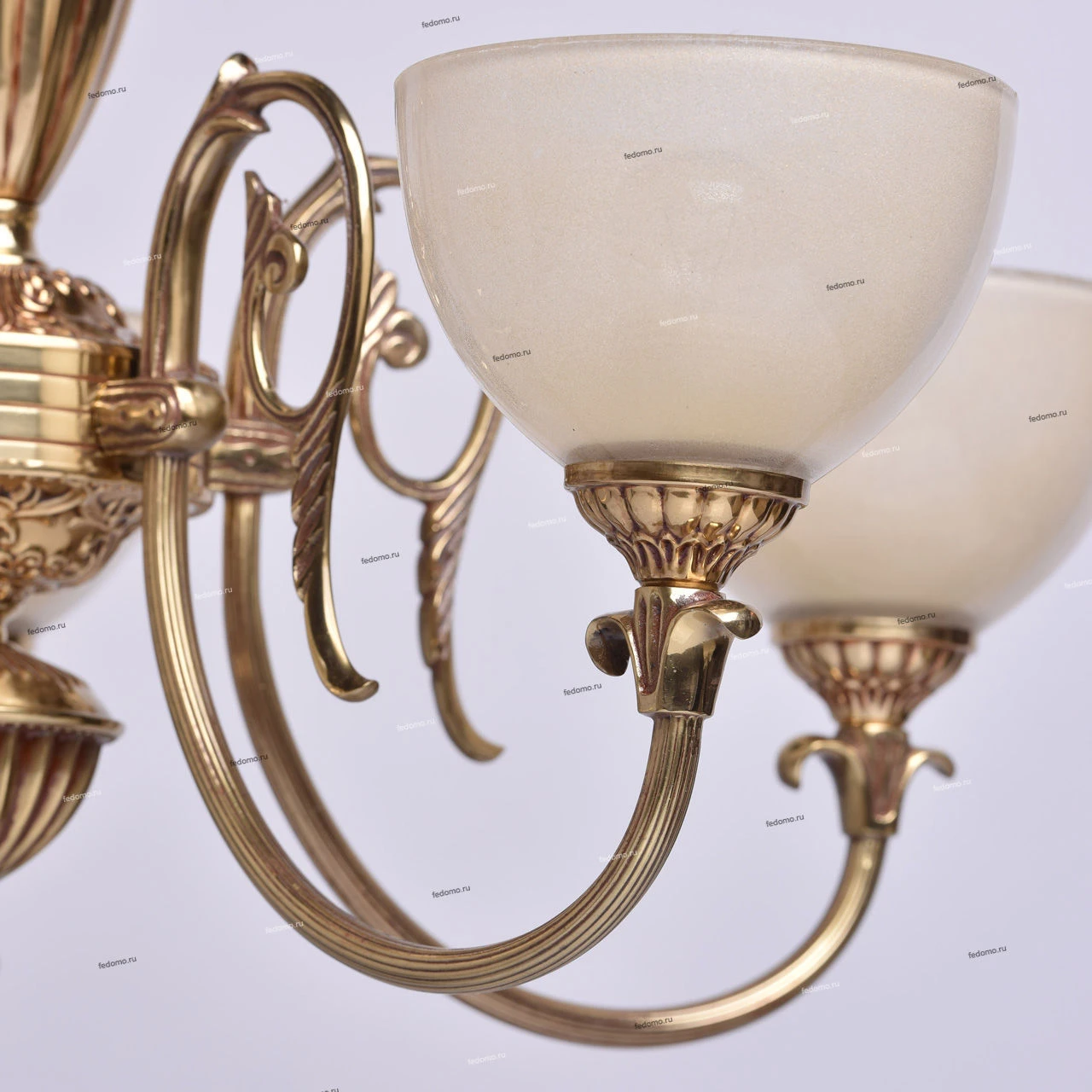 Арматура светильника выполнена из латуни. Светильник декорирован элементами художественного литья из бронзы. Плафоны светильника выполнены из стекла слегка окрашенного в массе в золотистый цвет и декорированы хрустальной крошкой изнутри.