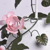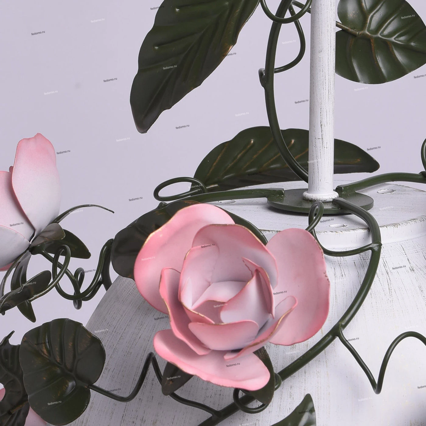 Арматура светильника выполнена из сплава металла и обработана по технологии двойного окрашивания. Первый основной слой цвета золота покрыт сверху на плафонах белым цветом, на листьях - зеленым с последующей зачисткой декоративного слоя. Цветы градуированн