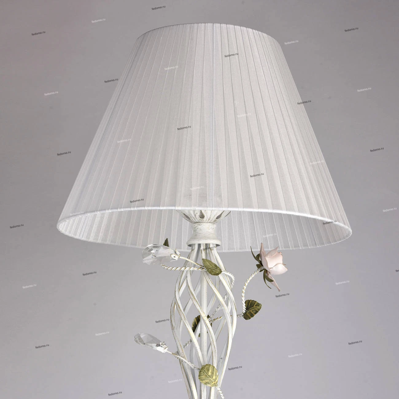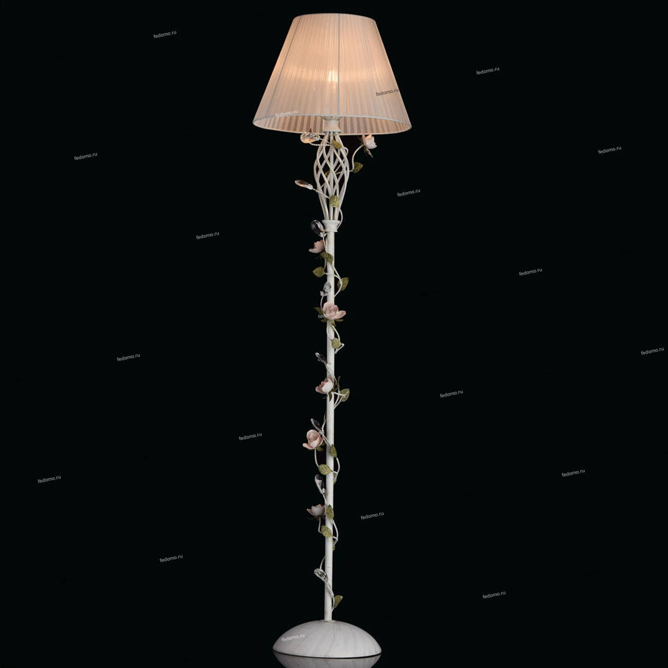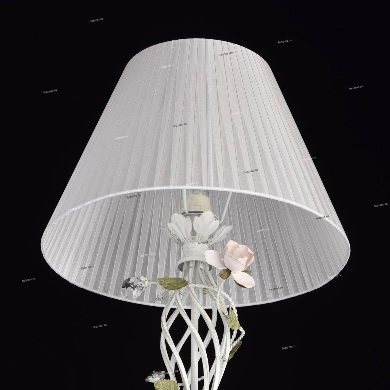 Металлическое основание белого цвета с эффектом золотой патины. Абажур - текстиль из белой органзы. Декор - цветы из металла розового и зеленого цвета.