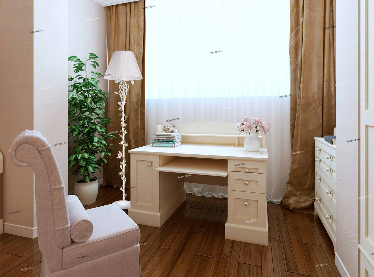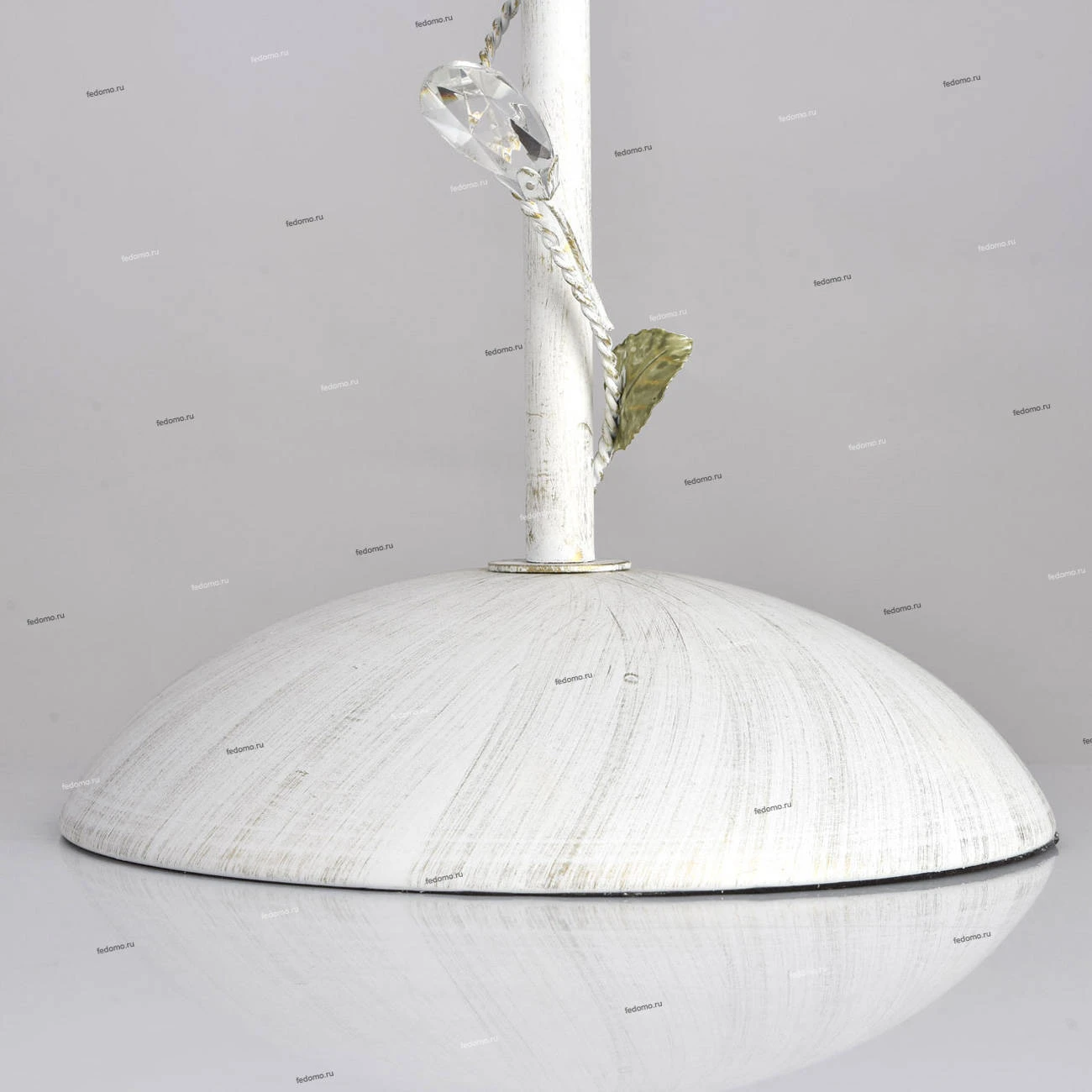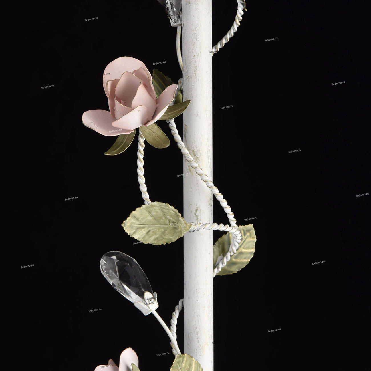 Металлическое основание белого цвета с эффектом золотой патины. Абажур - текстиль из белой органзы. Декор - цветы из металла розового и зеленого цвета.