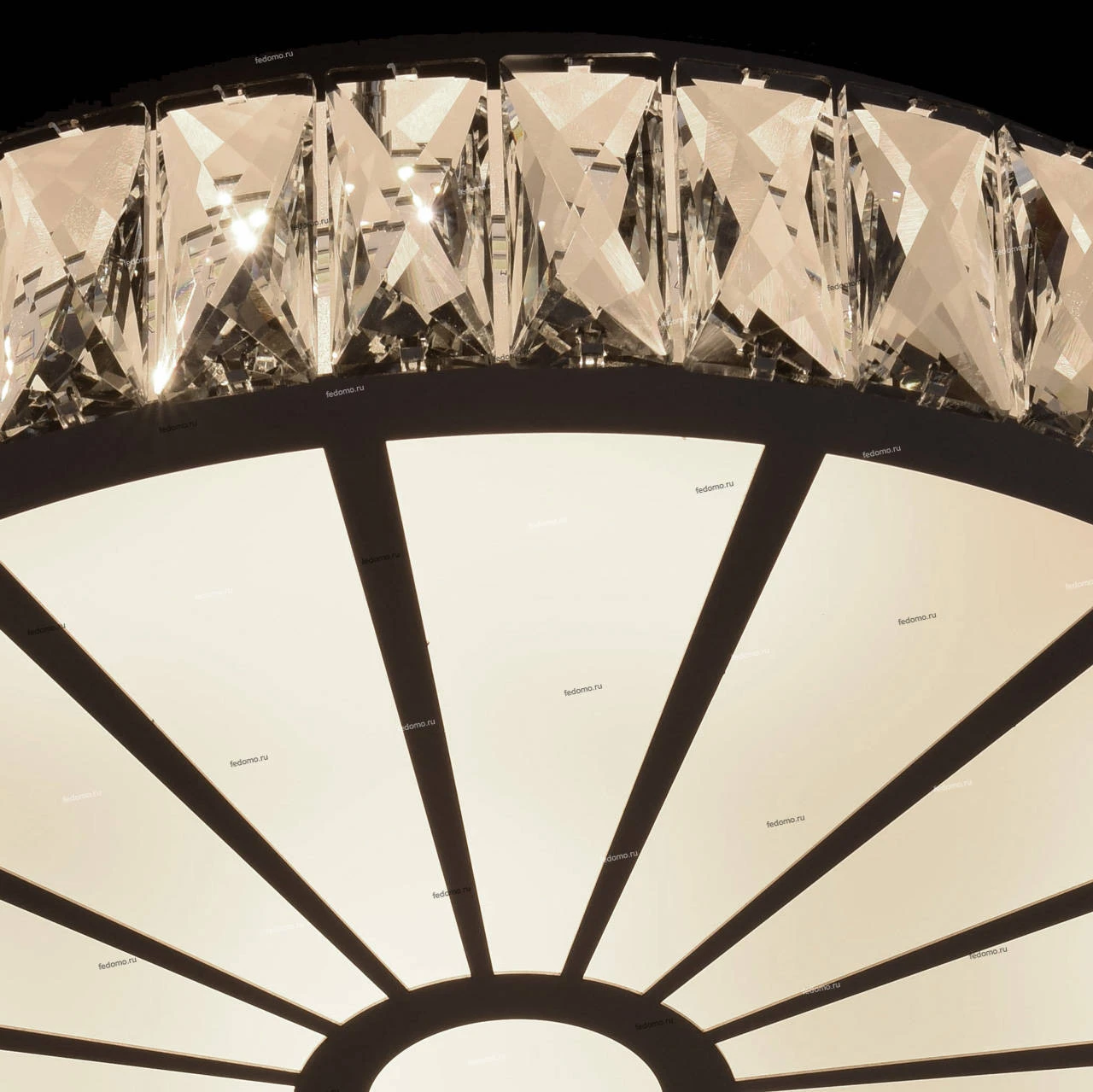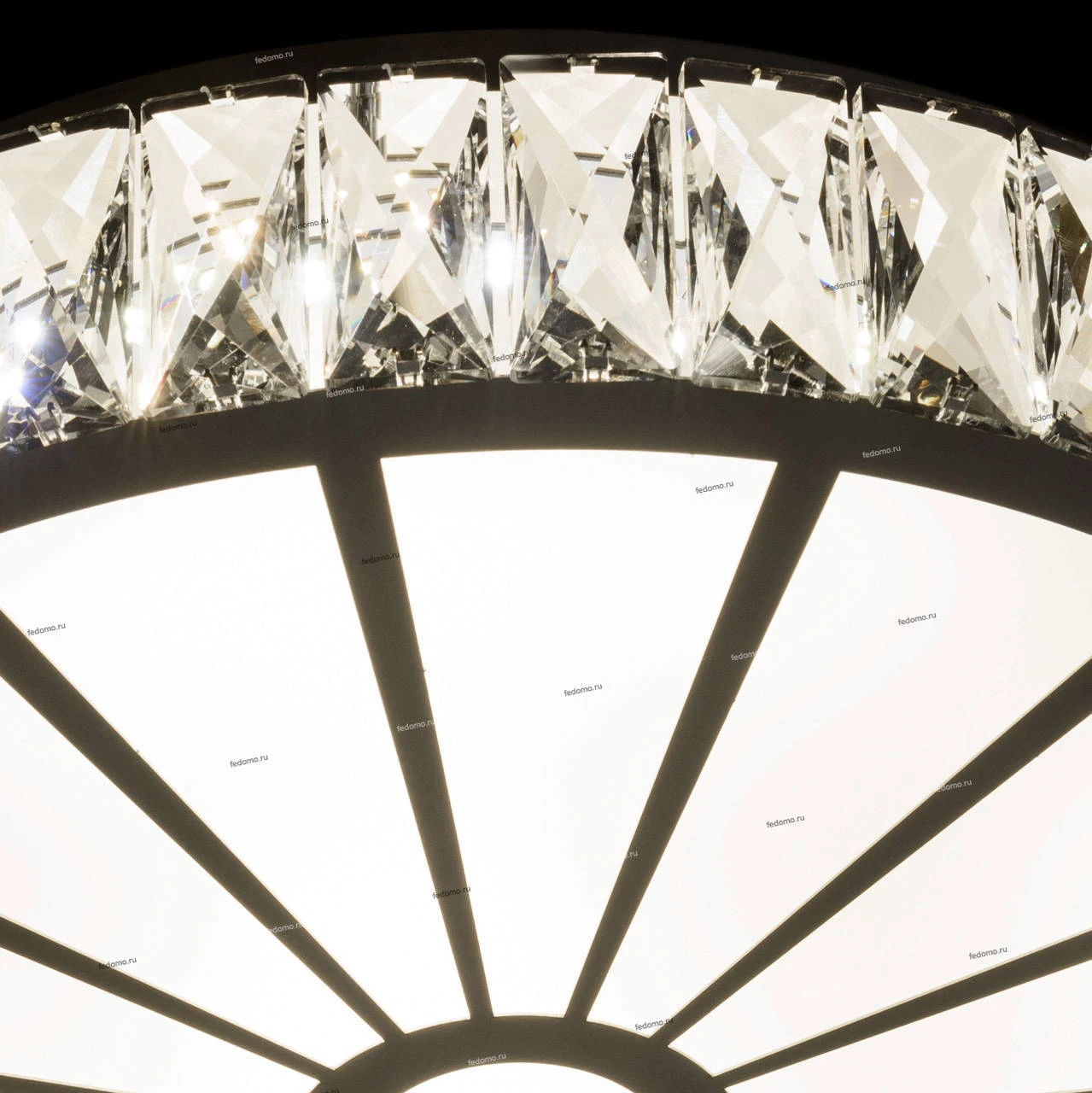 Основание светильника выполнен из сплава металла и окрашен в цвет серебра. Корпус выполнено из отполированной нержавеющей стали и декорировано элементами из хрусталя высотой 75 мм со множественными центрами схождения граней. Плафон светильника выполнен