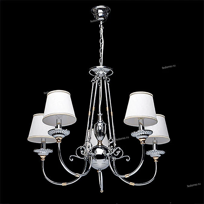 Металлическое основание цвета хрома, текстильные абажуры, декоративные элементы из металла золотого цвета