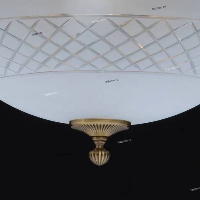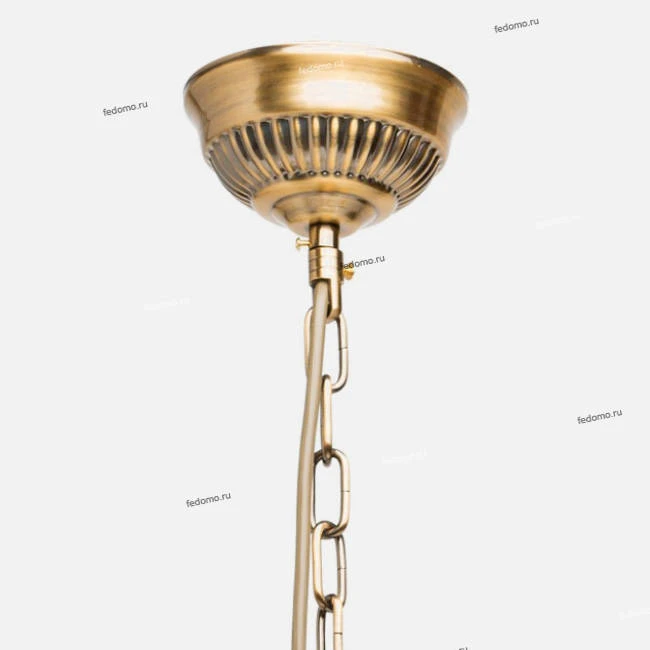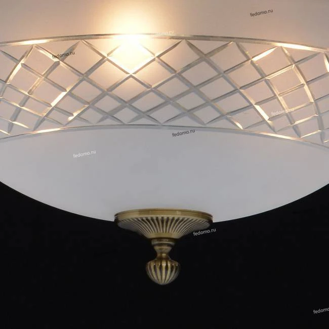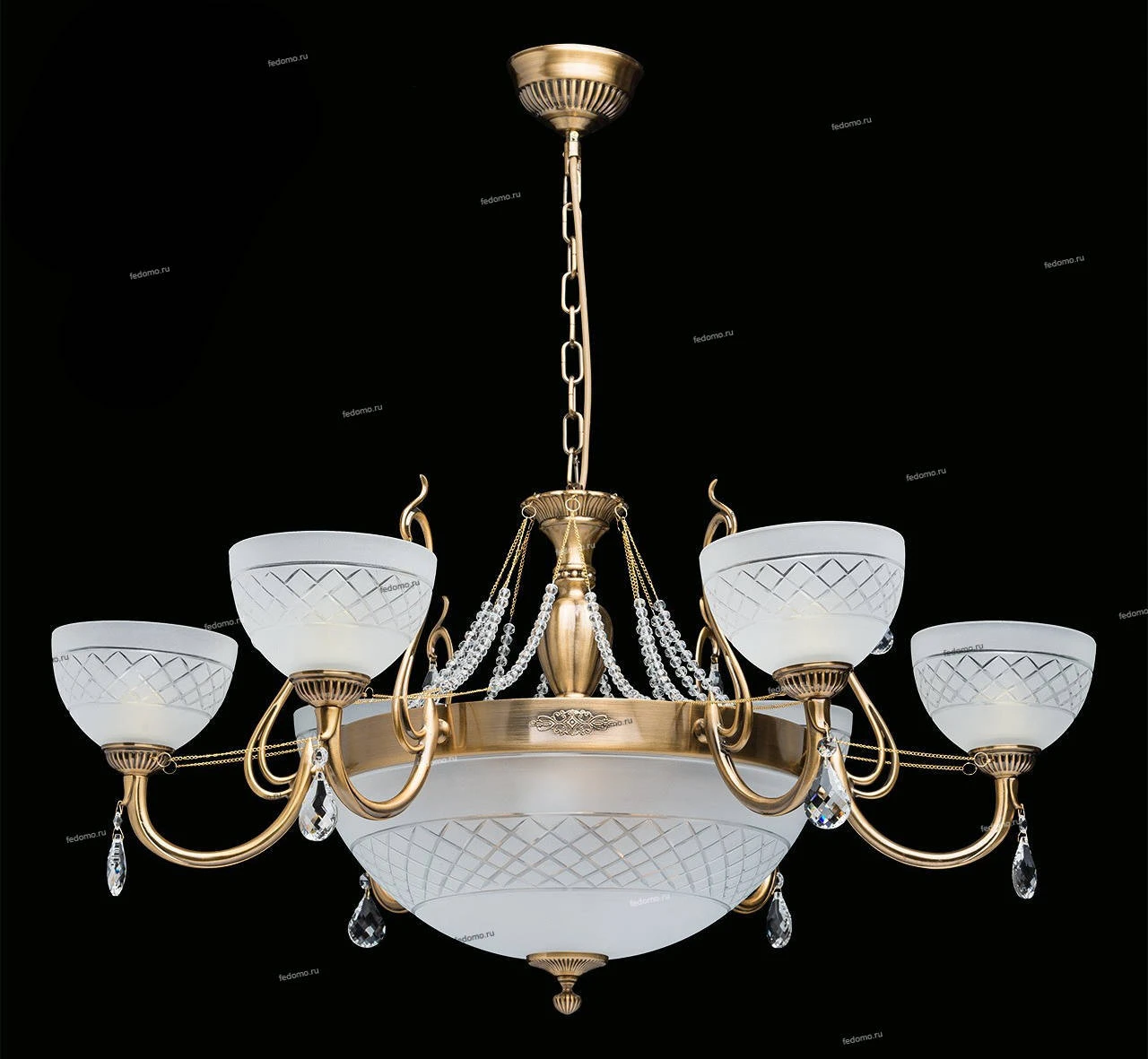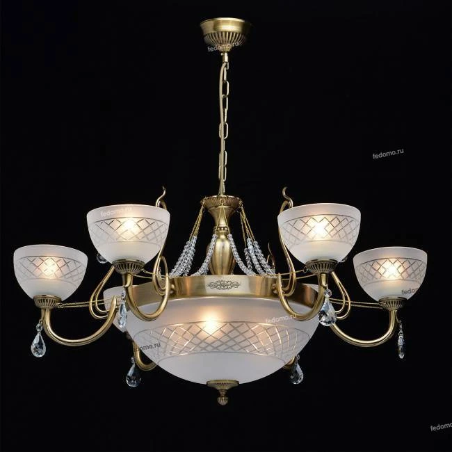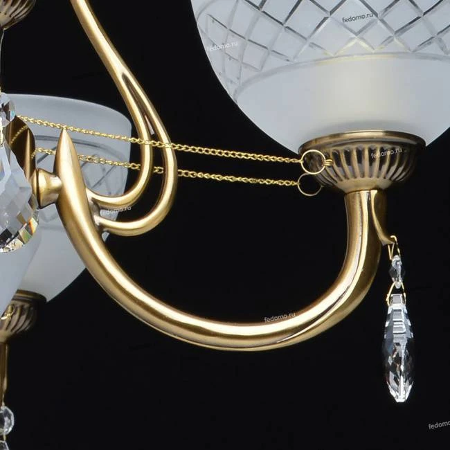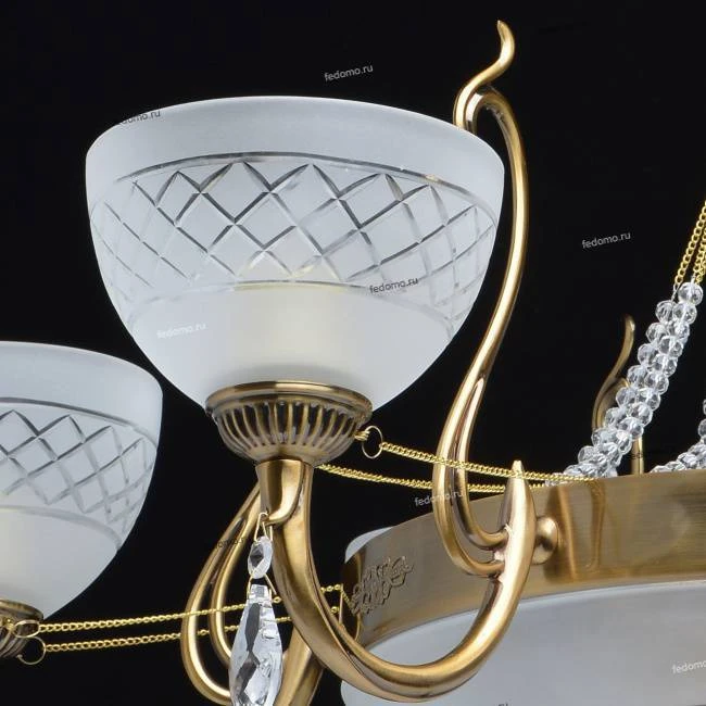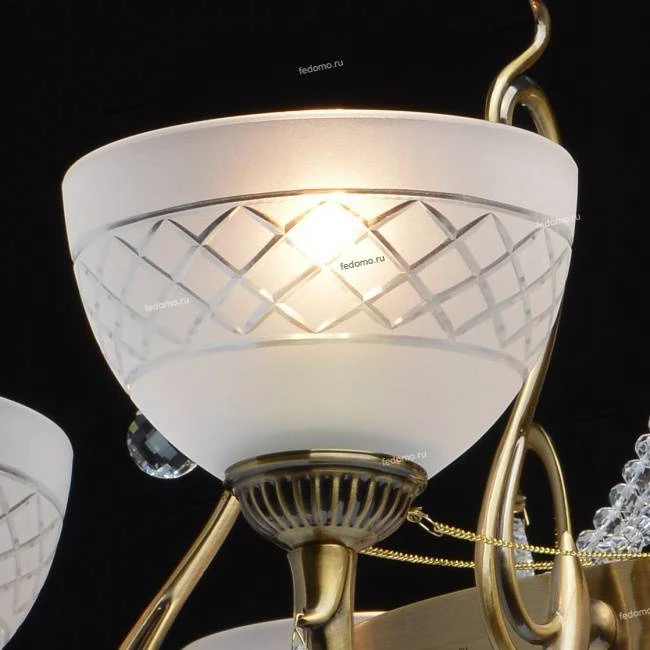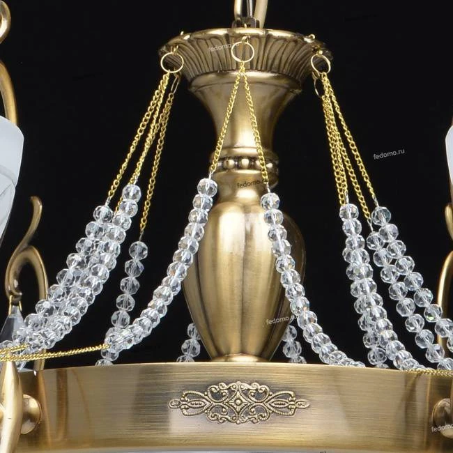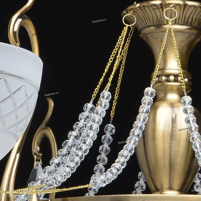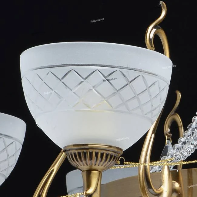 Металлическое основание цвета бронзы, плафоны из матового стекла с резным узором, декоративные элементы из хрусталя.