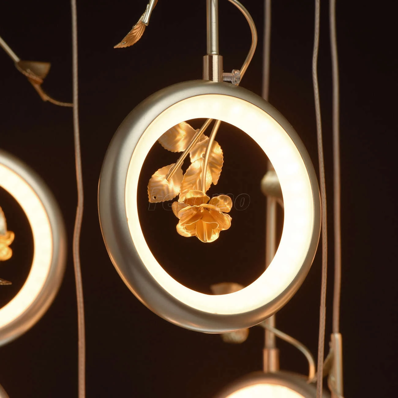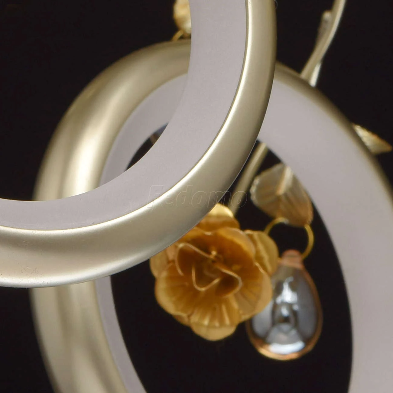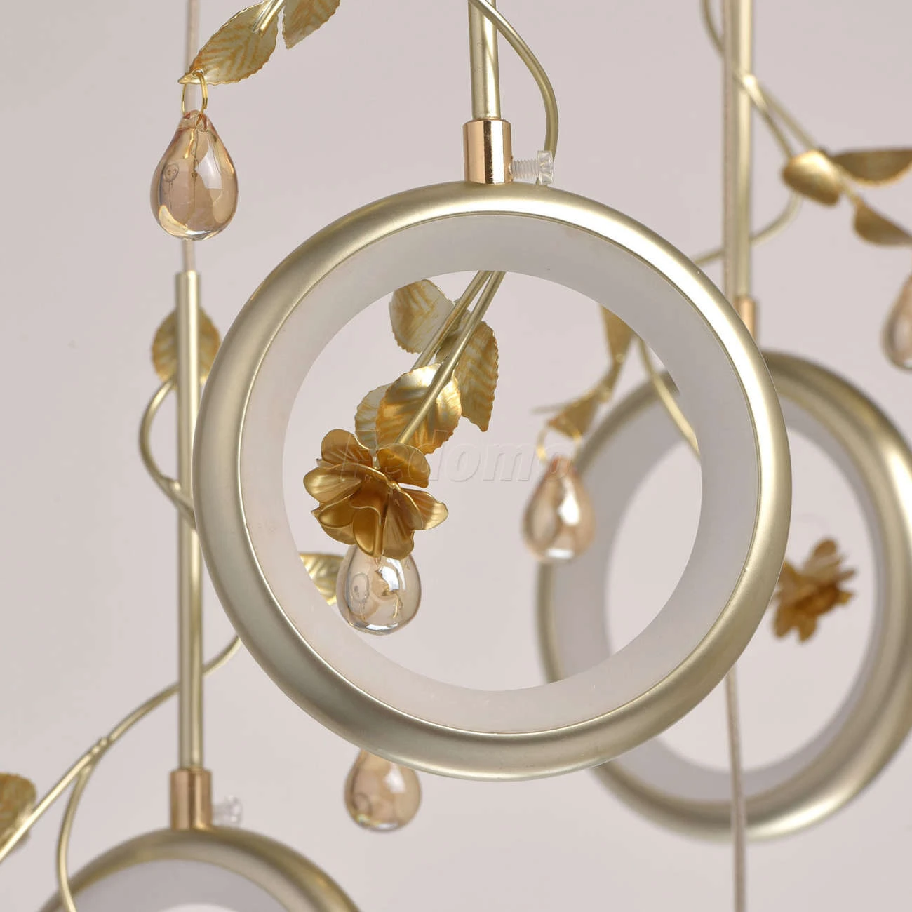 Футуристический дизайн люстры из коллекции «Ивонна» по достоинству оценят любители современных тенденций в интерьере. Белое металлическое основание дополнено подвесами, каждый из которых завершает плафон в форме кольца цвета перламутрового золота. Вся ком