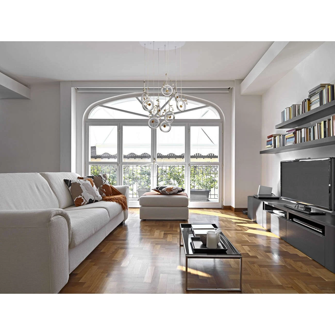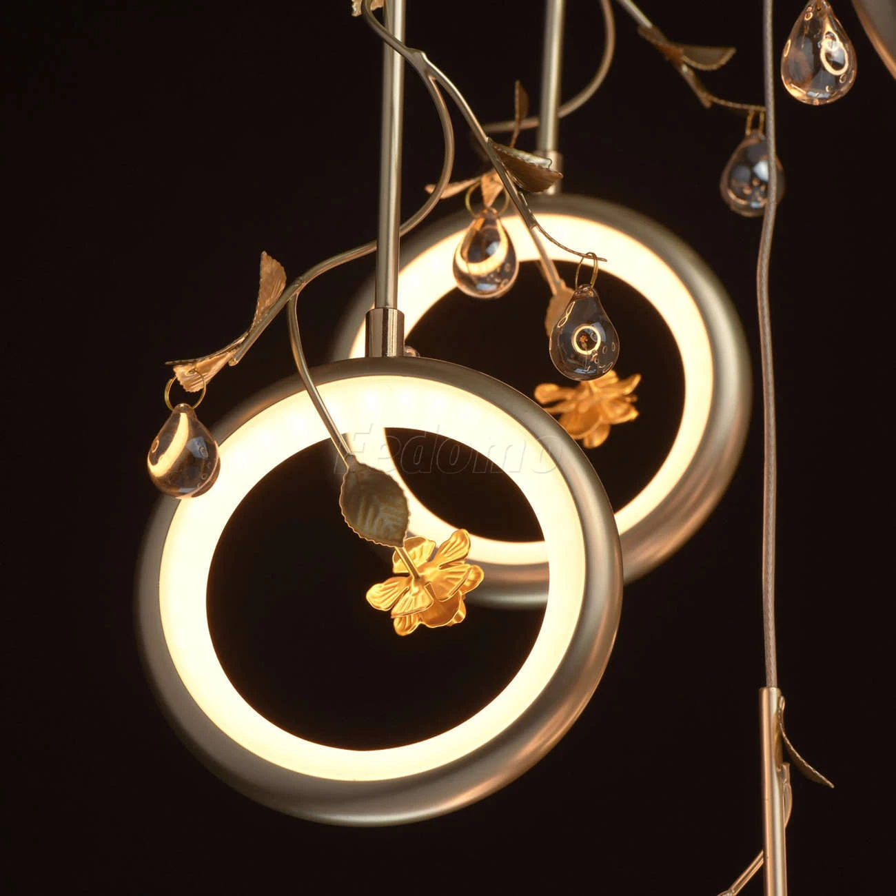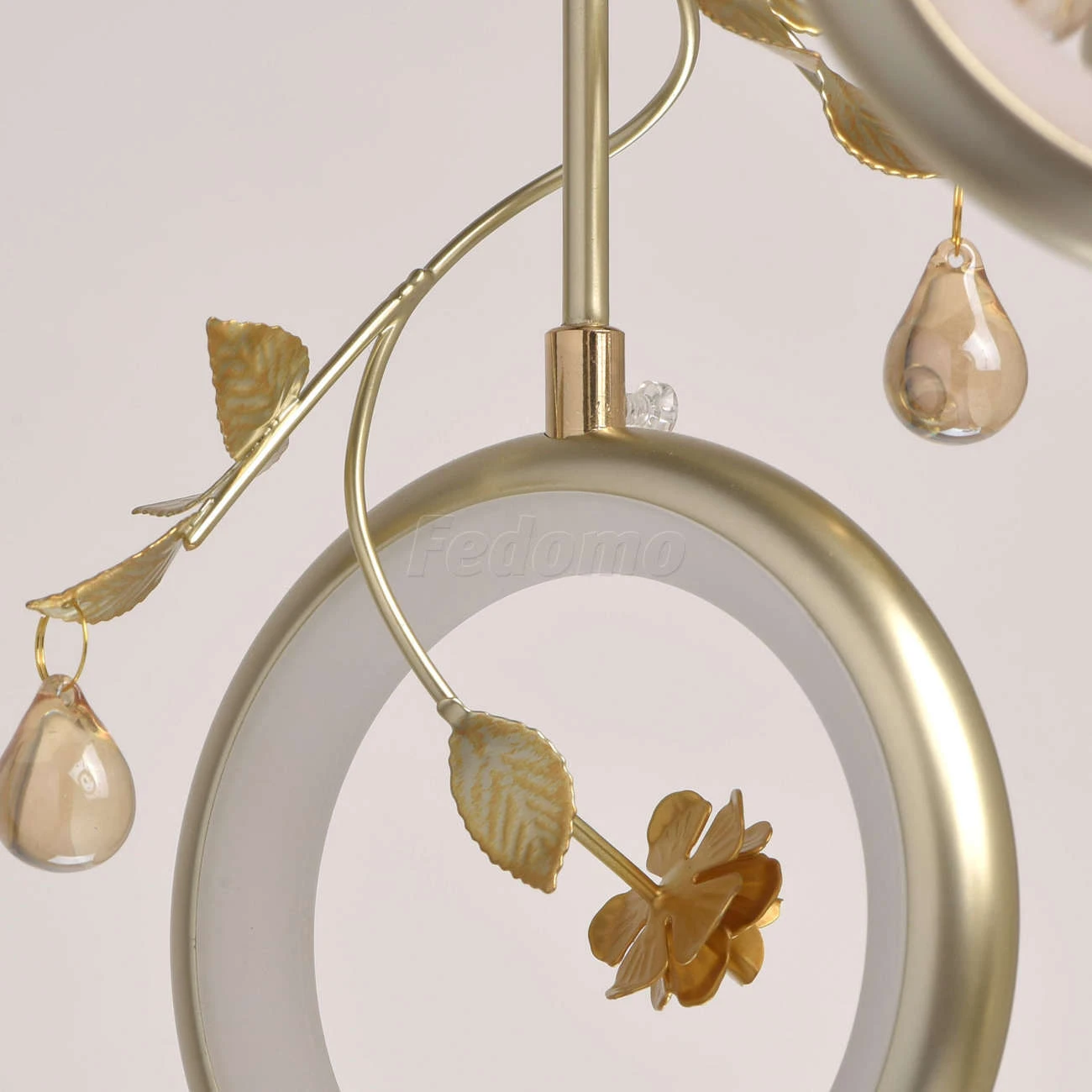 Футуристический дизайн люстры из коллекции «Ивонна» по достоинству оценят любители современных тенденций в интерьере. Белое металлическое основание дополнено подвесами, каждый из которых завершает плафон в форме кольца цвета перламутрового золота. Вся ком