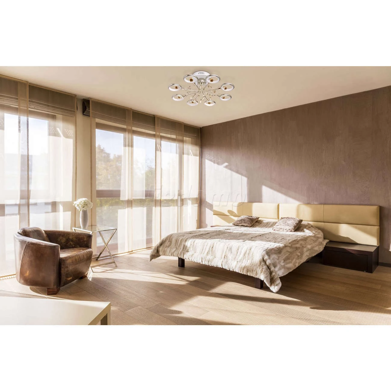 Футуристический дизайн люстры из коллекции «Ивонна» по достоинству оценят любители современных тенденций в интерьере. Белое металлическое основание дополнено рожками цвета перламутрового золота, каждый из которых завершает плафон в форме кольца того же от
