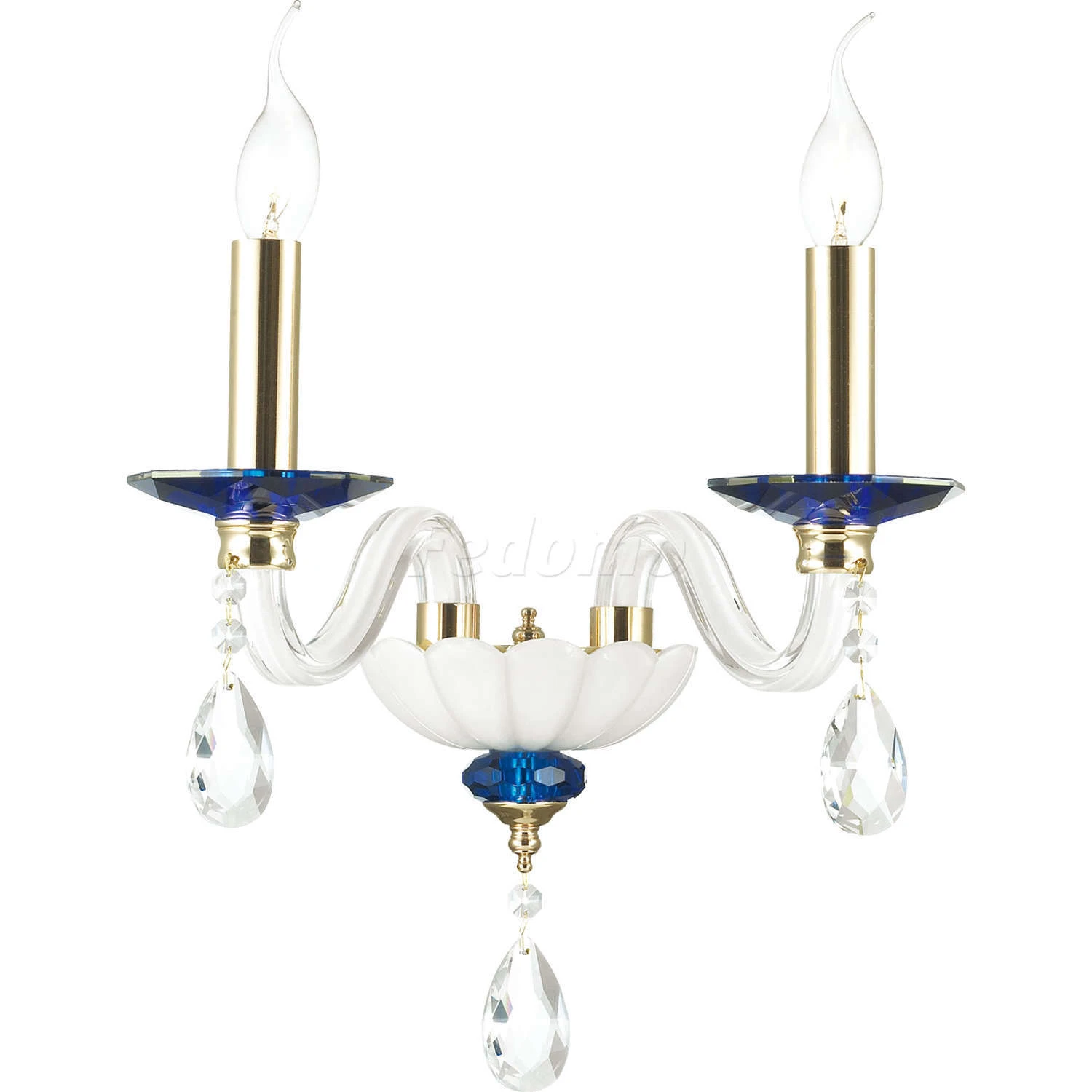 Материалы исполнения арматура, декор: металл, стекло, хрусталь. Цвет арматуры золото. Декор декоративная арматура, подвеска, материал декора хрусталь, цвет синий. Элегантная серия Elefi выполнена в стиле современной классики. Основные стеклянные элементы выполнены из белого стекла, дополнены синими подставками и украшены прозрачными подвесками из хрусталя. Металлическая арматура окрашена в золотой цвет, который подчеркивает классический стиль люстры и выигрышно контрастирует с бело-синей гаммой. Светильник Elefi прекрасно впишется в классические и современные интерьеры и подчеркнет индивидуальность. Наименование 4600/2W ODL19 268 золото/белый/синий/хрусталь Бра E14 2*40W ELEFI.