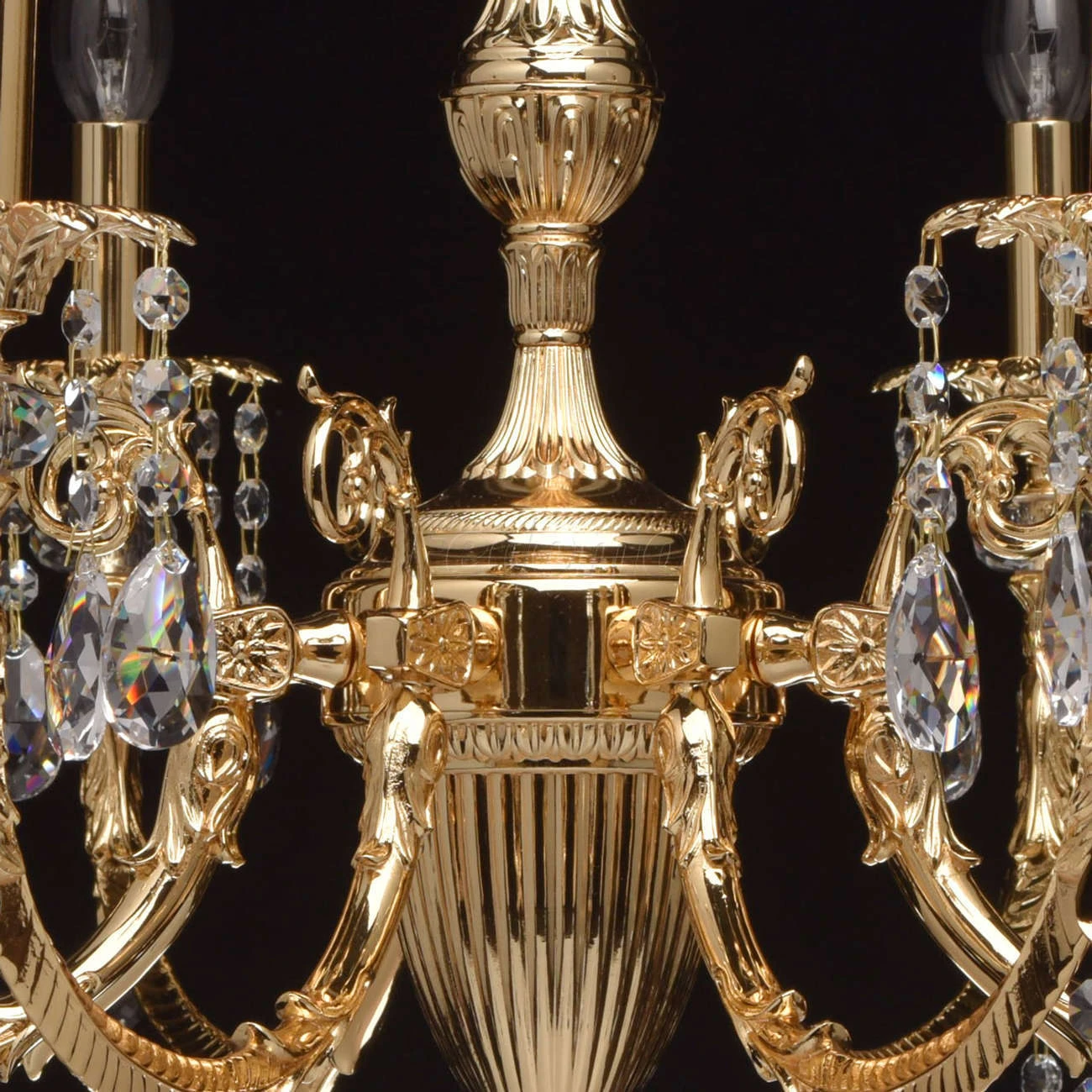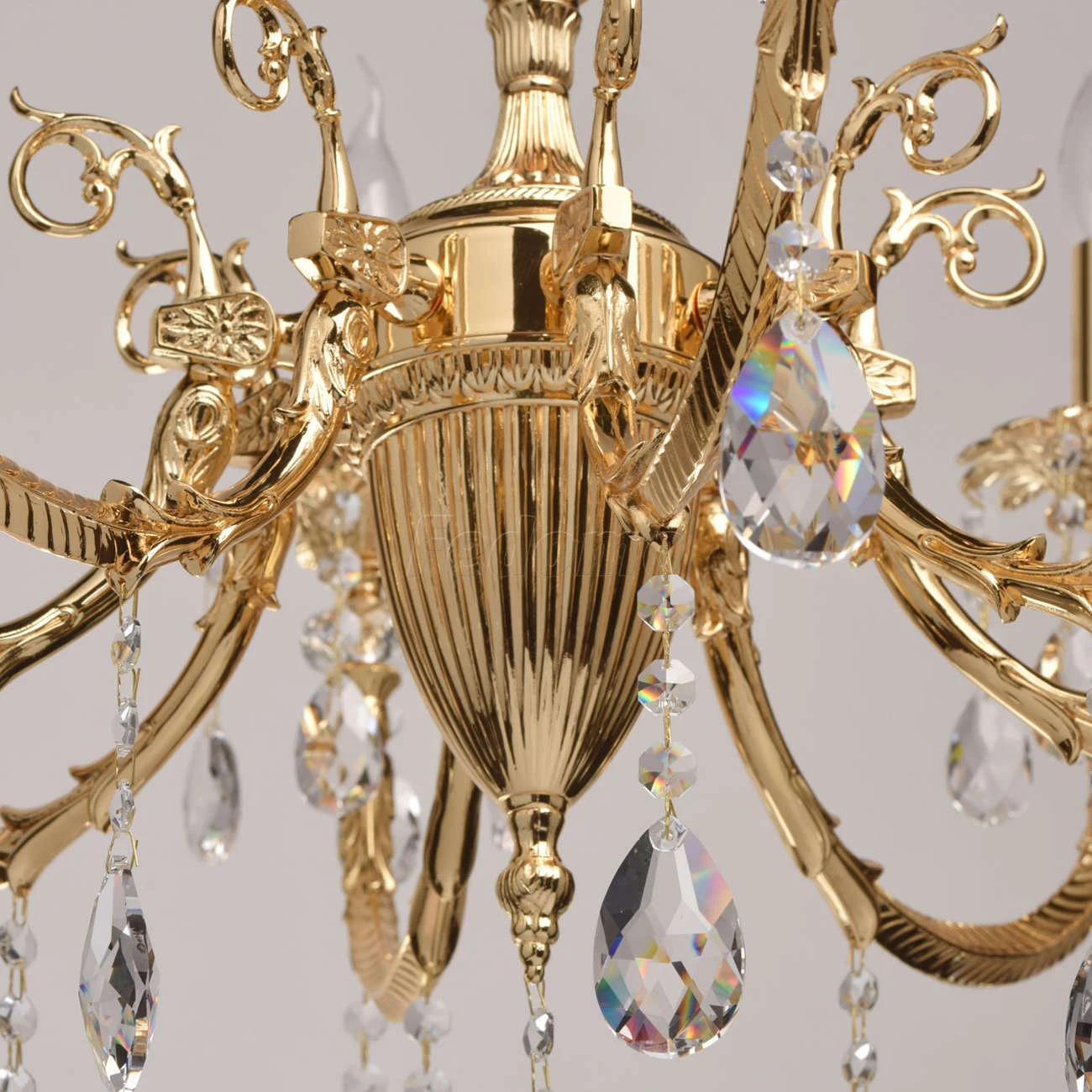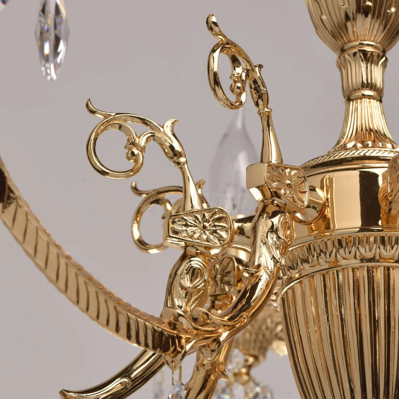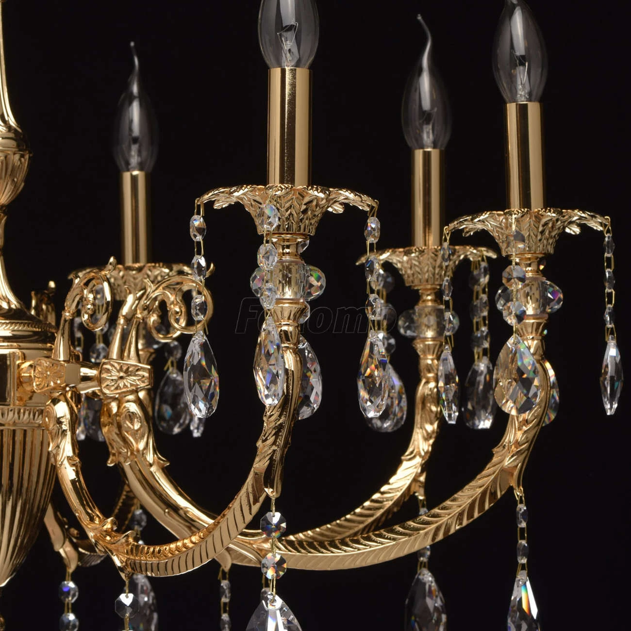 Люстра из коллекции «Габриэль» - воплощение роскоши и изысканной красоты. Утонченное металлическое основание, выполненное из благородной латуни, гальванизировано в цвет золота оригинального оттенка. Грациозные витые рожки подчеркнуты изящными розетками, б
