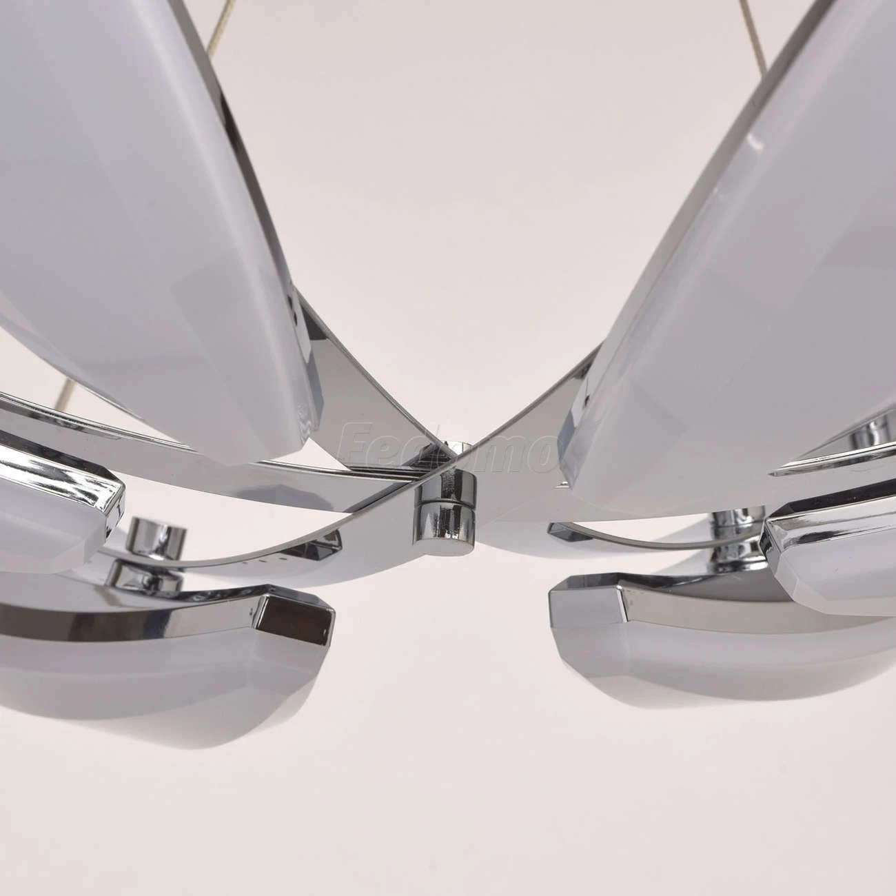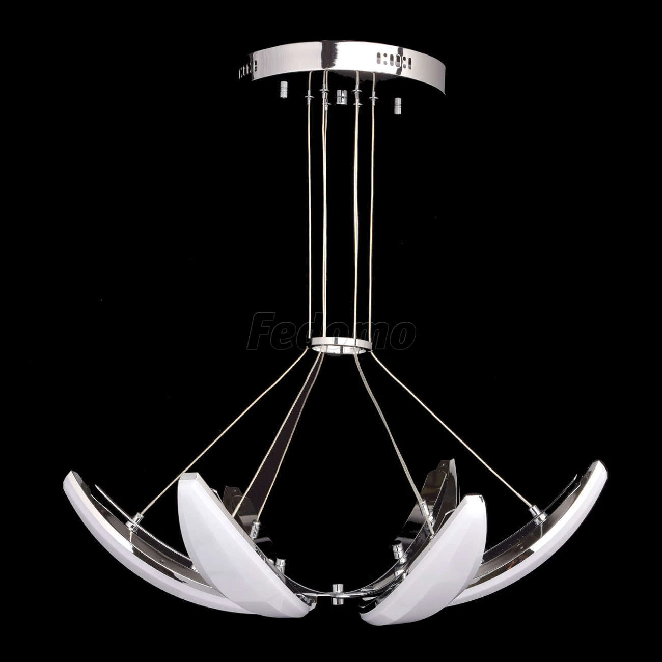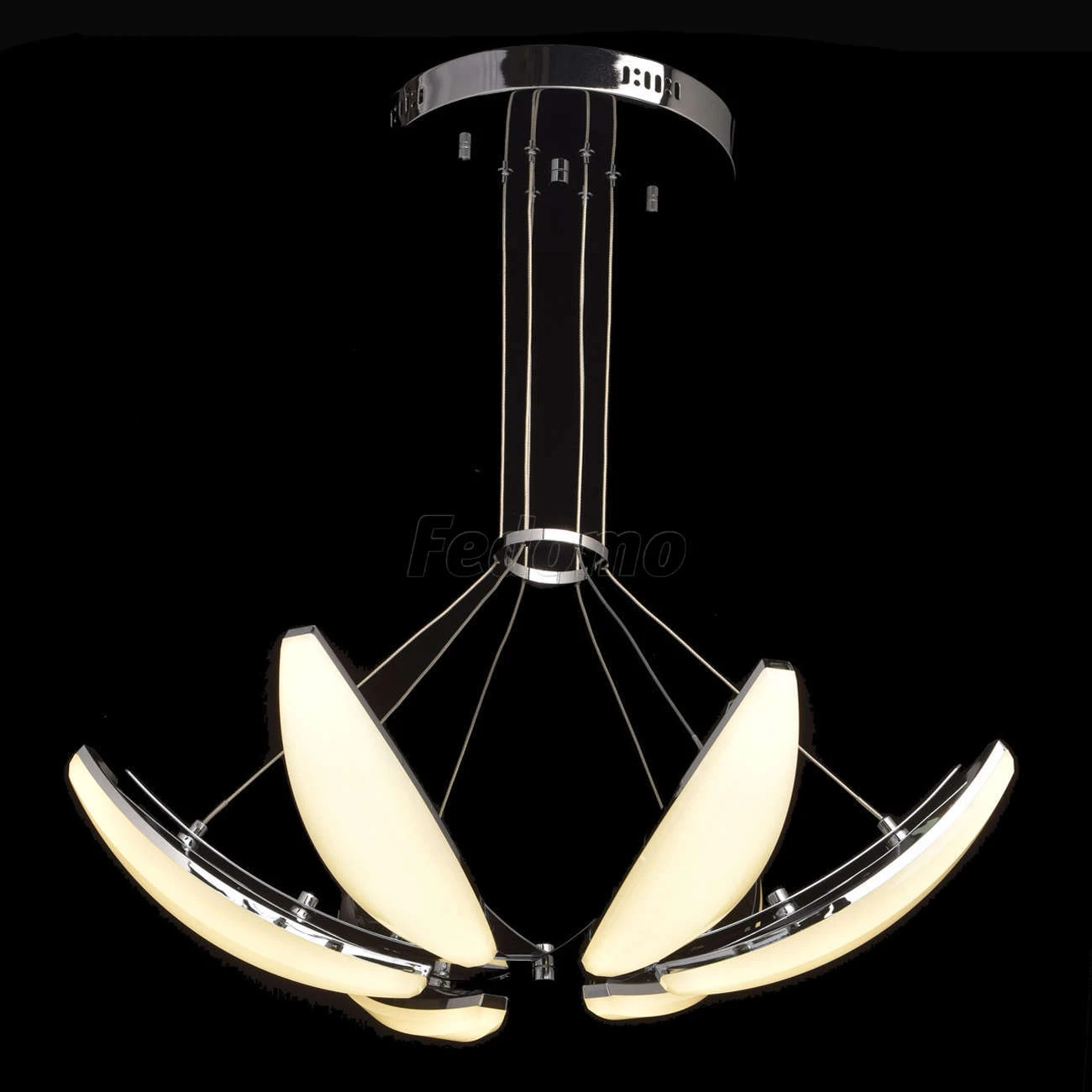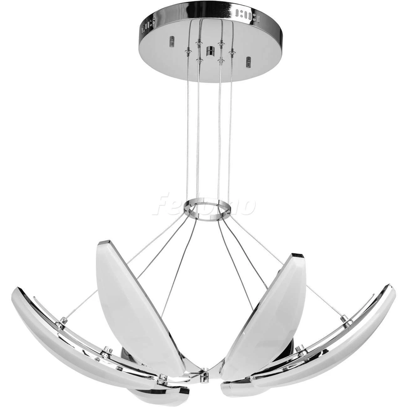 Люстра из коллекции «Фленсбург» - еще один пример, доказывающий: в современном интерьере возможно всё! Несколько футуристичный дизайн представлен хромированным металлическим основанием и оригинальными подвесными плафонами-лепестками. Они выполнены из мета