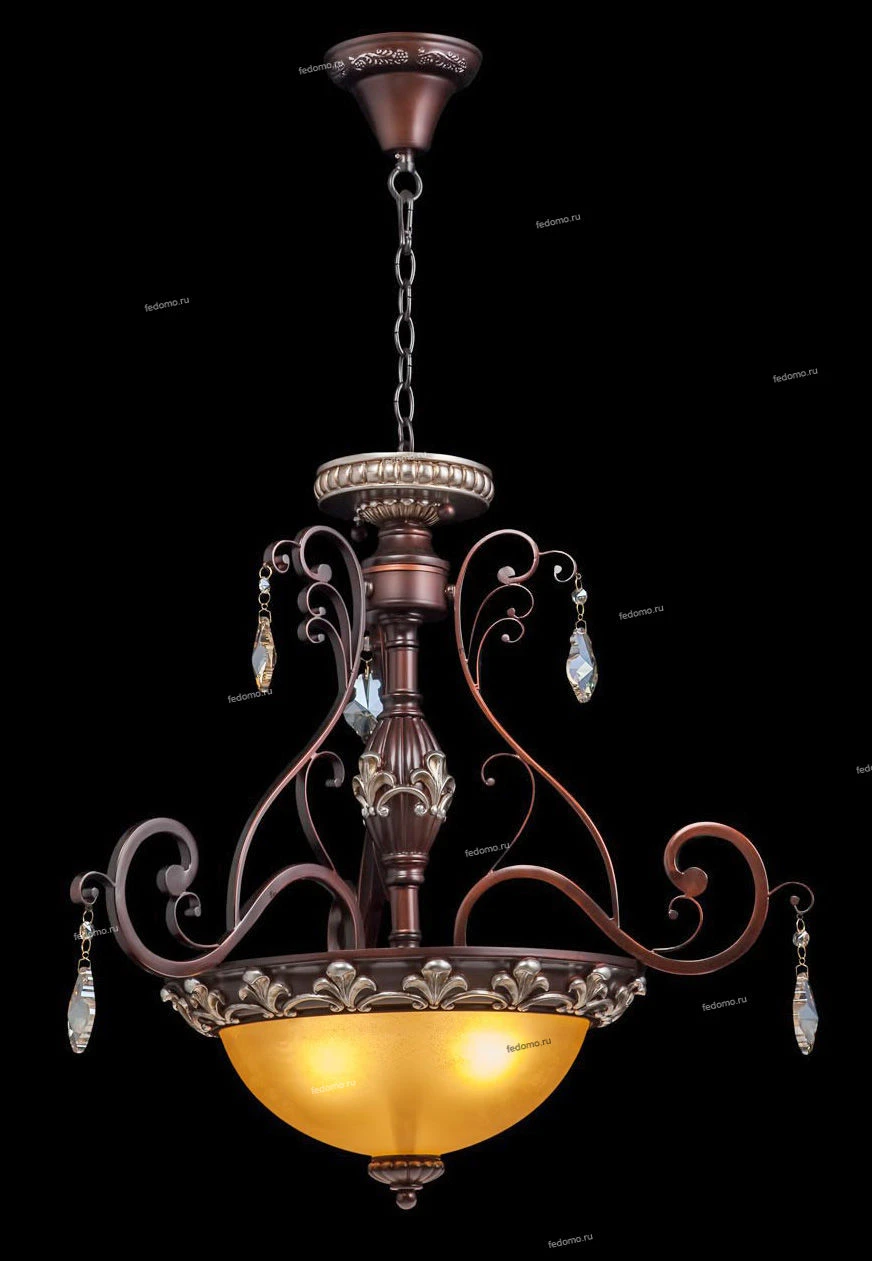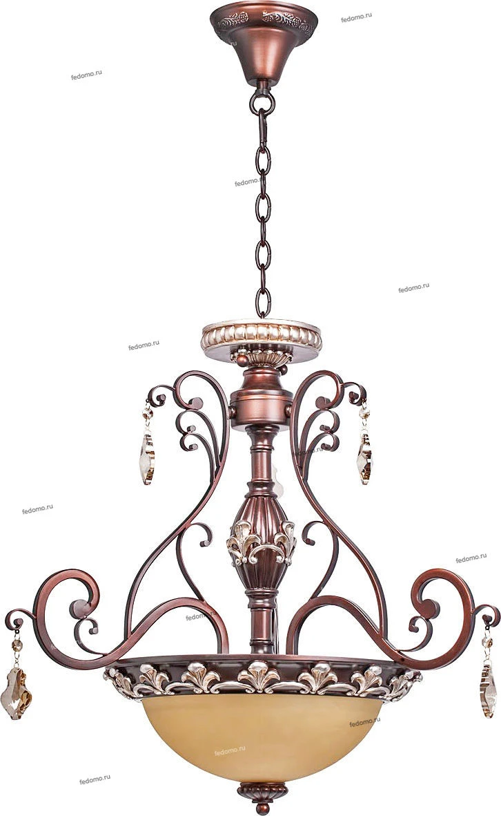 Кованое металлическое основание, декоративные элементы из искусственного каучука цвета темного кофе, плафон из матового стекла, декоративные элементы из хрусталя цвета топаза.
