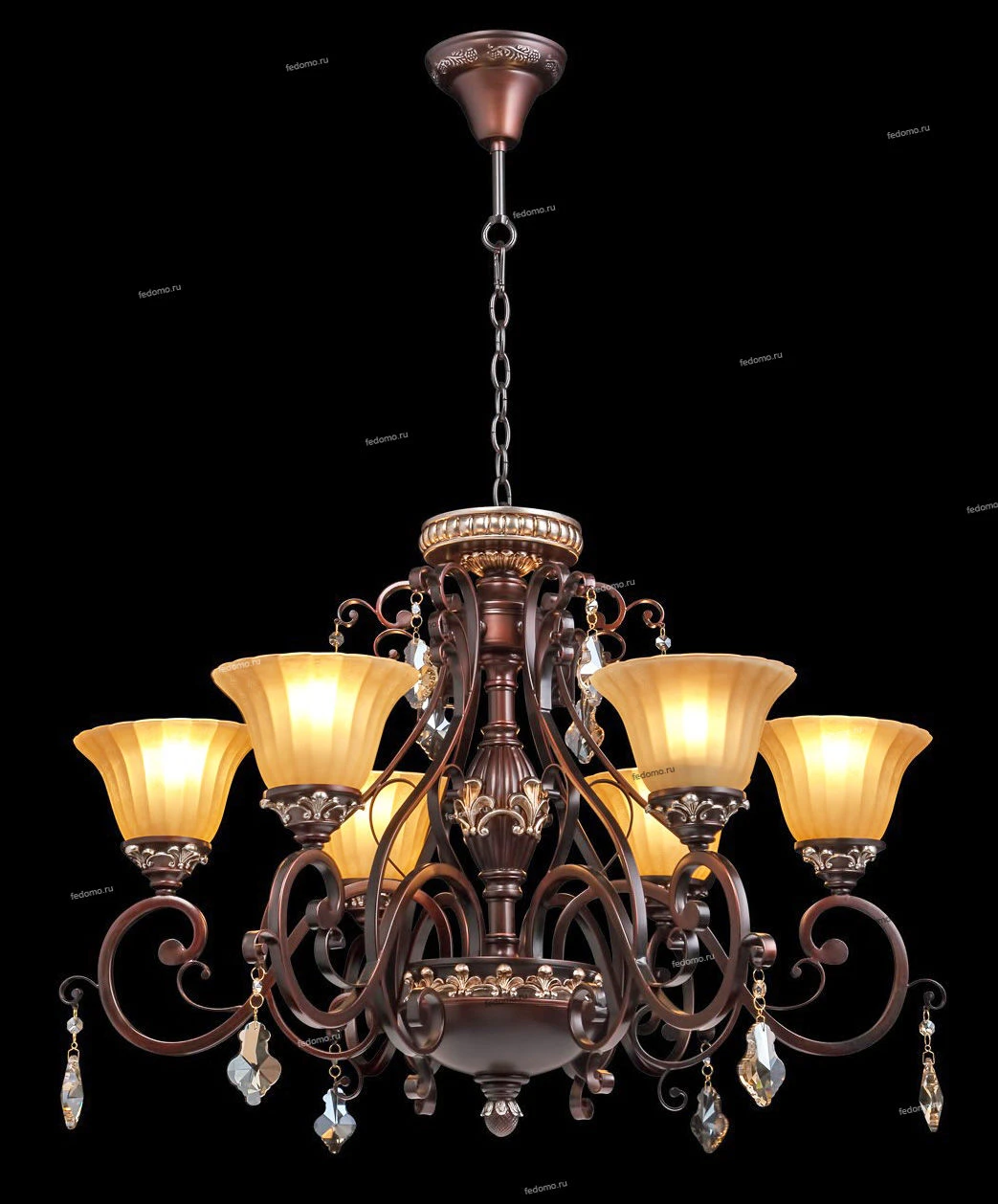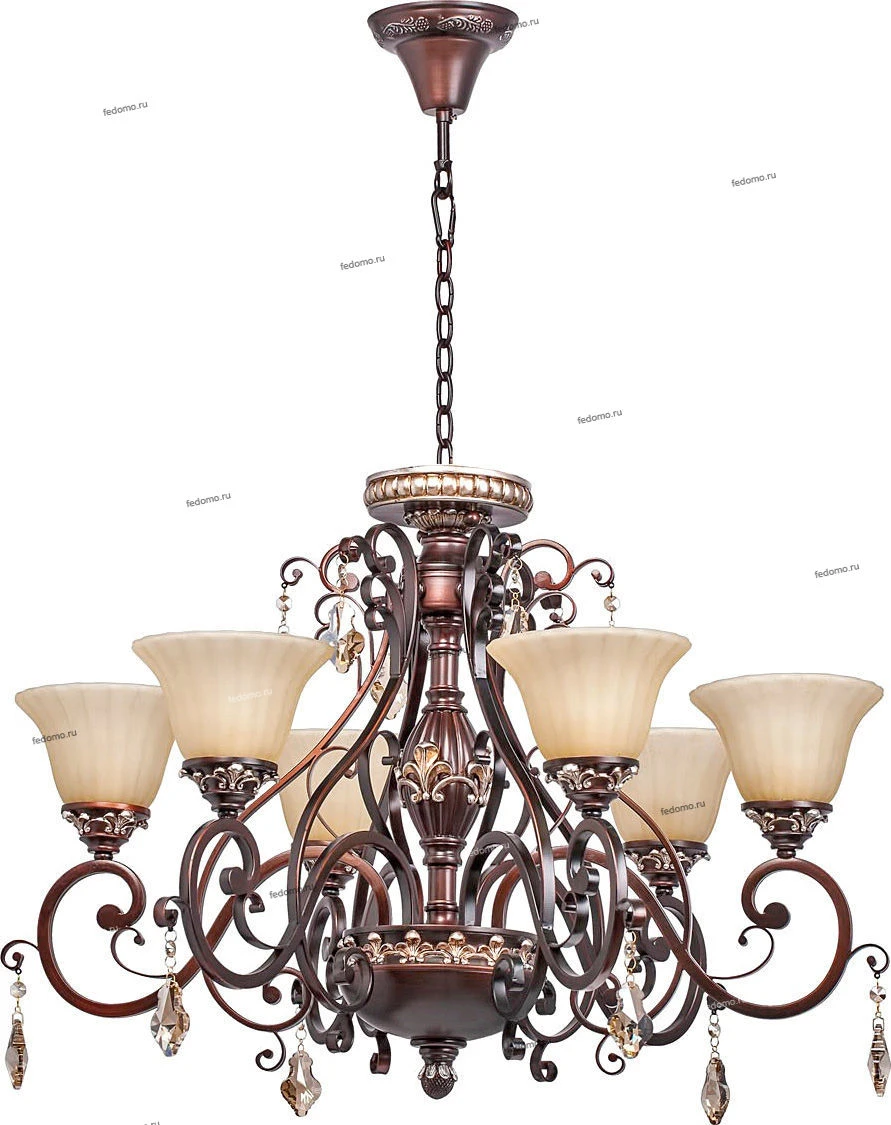 Кованое металлическое основание, декоративные элементы из искусственного каучука цвета темного кофе, плафоны из матового стекла, декоративные элементы из хрусталя цвета топаза.