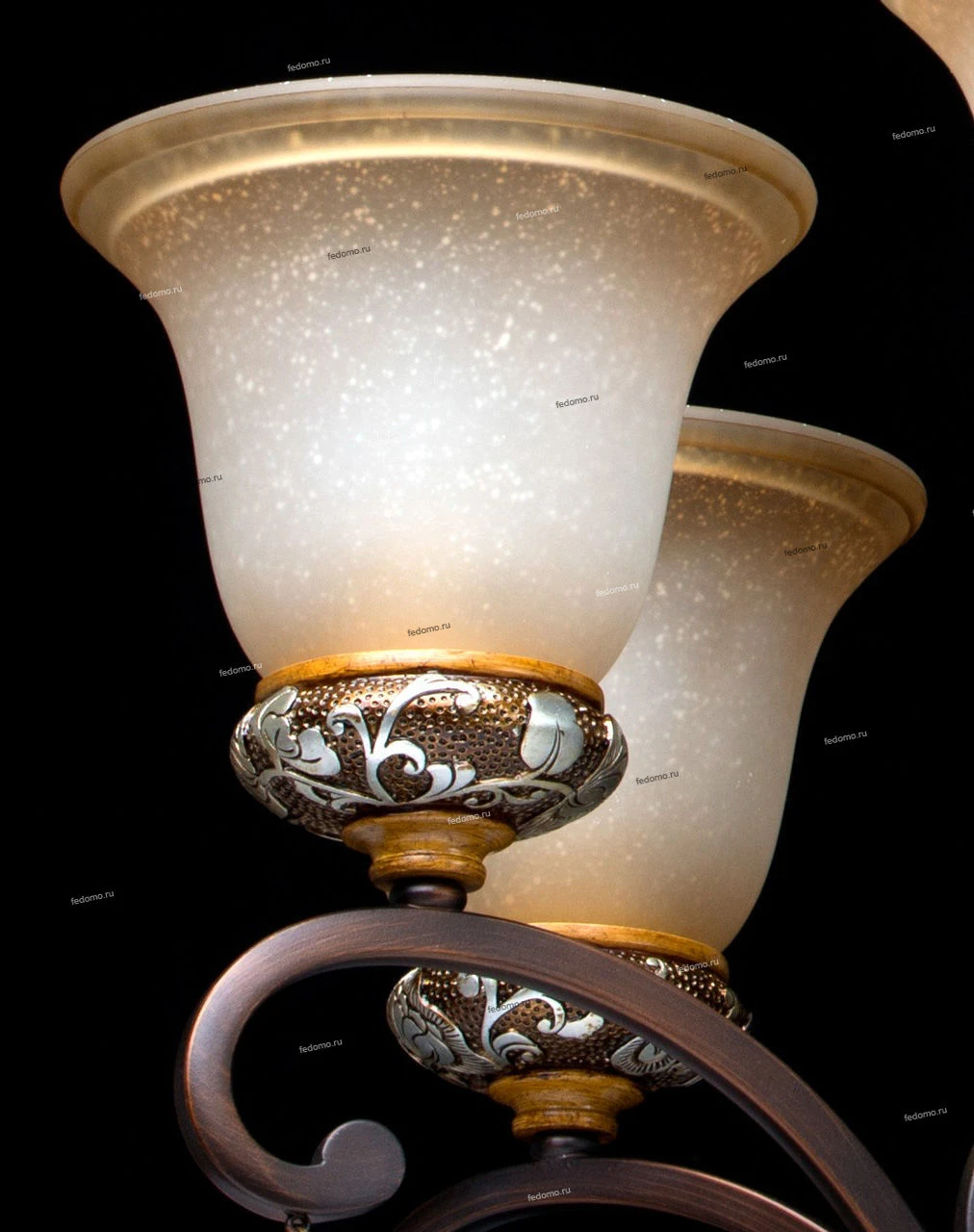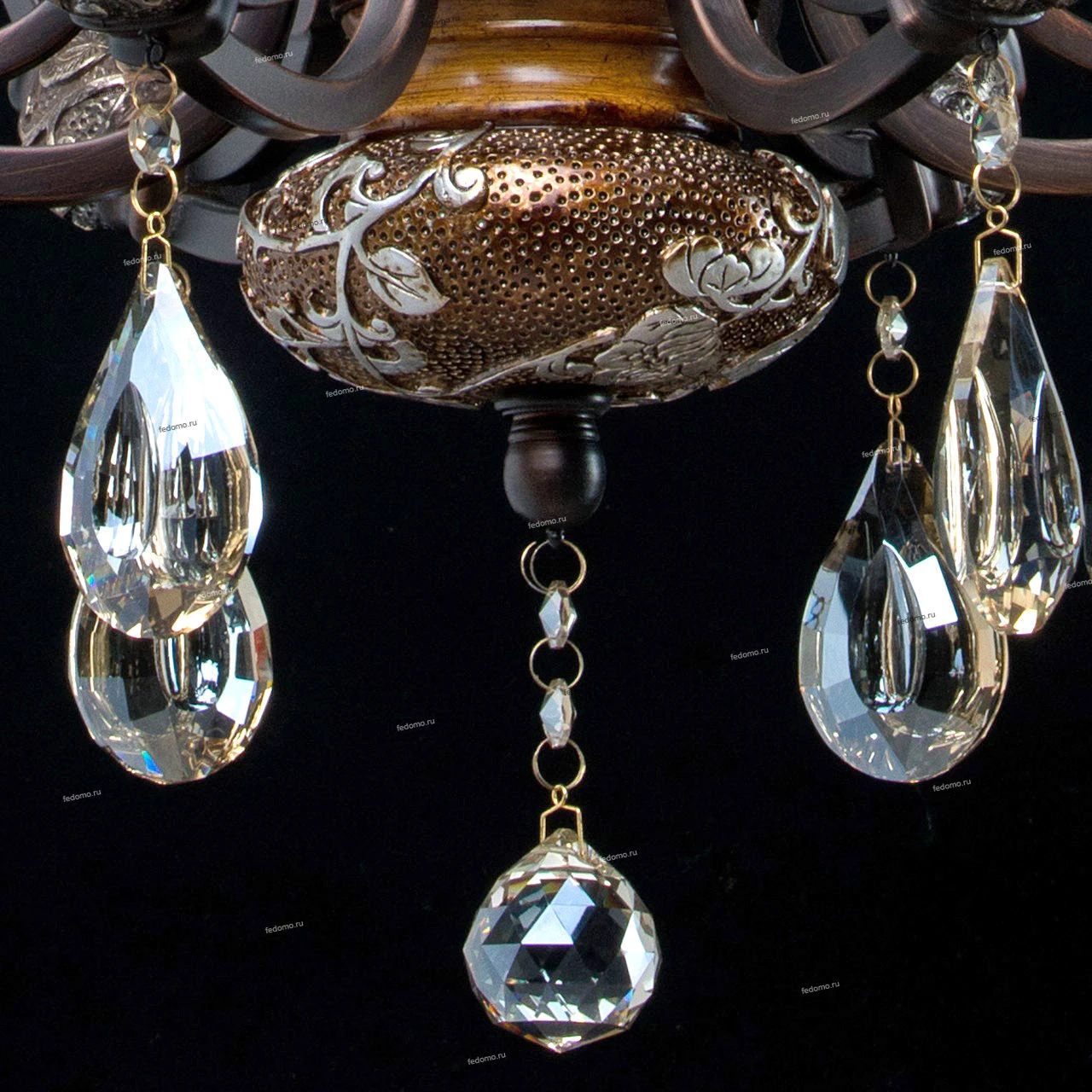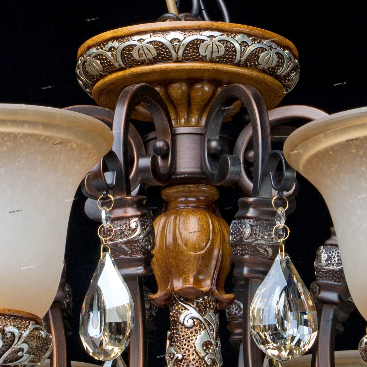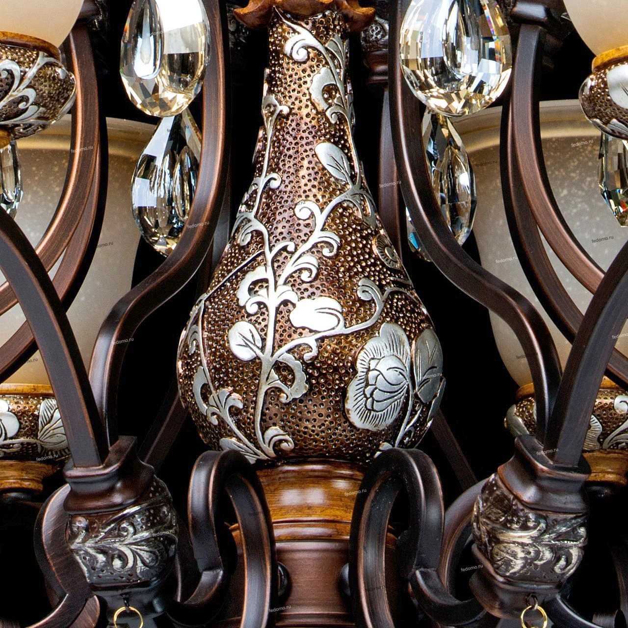 Кованое металлическое основание, декоративные элементы из искусственного каучука, плафоны из матового стекла, декоративные элементы из хрусталя цвета топаза.