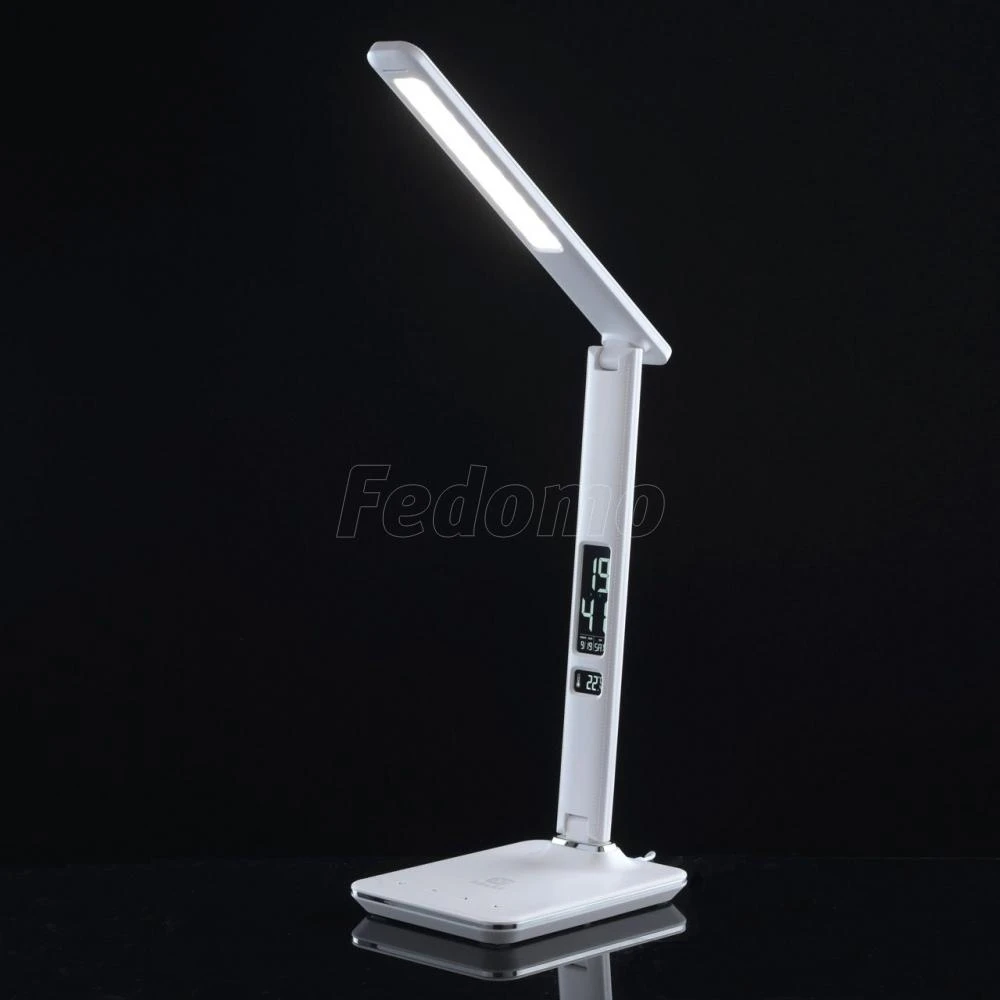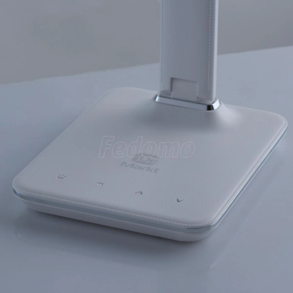Офисная настольная лампа для школьников 631035001 из серии Ракурс от компании DeMarkt будет удачно смотреться на столе в гостиной, спальне, кабинете, офисе, оформленных в стиле хай-тек, техно. Светодиодная офисная лампа с направленным светом имеет 1 рассеиватель и лампочку с мощностью 7W и напряжением 220V. Модель складываемая, с часами и будильником, зарядкой от USB, термометром, с диммером устанавливается на основание. Основной материал и цвет арматуры - белый акрил, кожа, материал рассеивателя - акрил. Светодиодная офисная лампа оборудована сенсорным выключателем. Габариты изделия: длина - 140 мм, ширина - 185 мм, высота - 530 мм. В комплекте есть лампочки. Лучшая цена и условия доставки на DeMarkt 631035001 в интернет-магазине Fedomo.ru.