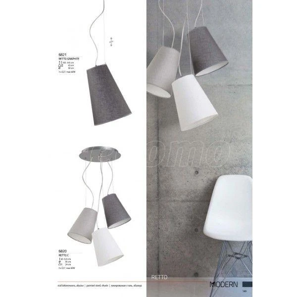 Каскадный подвесной светильник 6820 из серии Nowodvorski Retto от компании Nowodvorski подойдет для освещения гостиной, кафе, кухни, офиса, оформленных в стиле современный. Основной цвет изделия - матовый серый, материал абажура - ткань. Рассчитан на 3 лампочки с цоколем E27 и освещает площадь до 9 кв. м. Модель поддерживает установку диммера. Лучшая цена и условия доставки на Nowodvorski Retto 6820 в интернет-магазине Fedomo.ru.