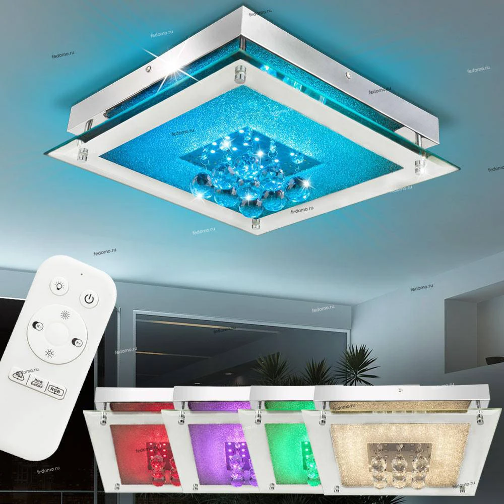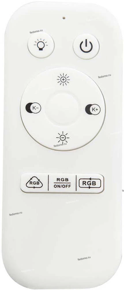 С пульта управления доступны функции: 1. Включение/выключение светодиодной RGB подсветки. 2. Плавное изменение цвета подсветки. 3. Поочерёдное изменение цвета подсветки. 4. Управление основным освещением. 5. Плавная регулировка яркости свечения. 6. Плавное изменения цвета свечения от теплого (3000K) до холодного(6000K). 7. Фиксированные цвета свечения: теплый (3000K), нейтральный (4500K) и холодный(6000K).