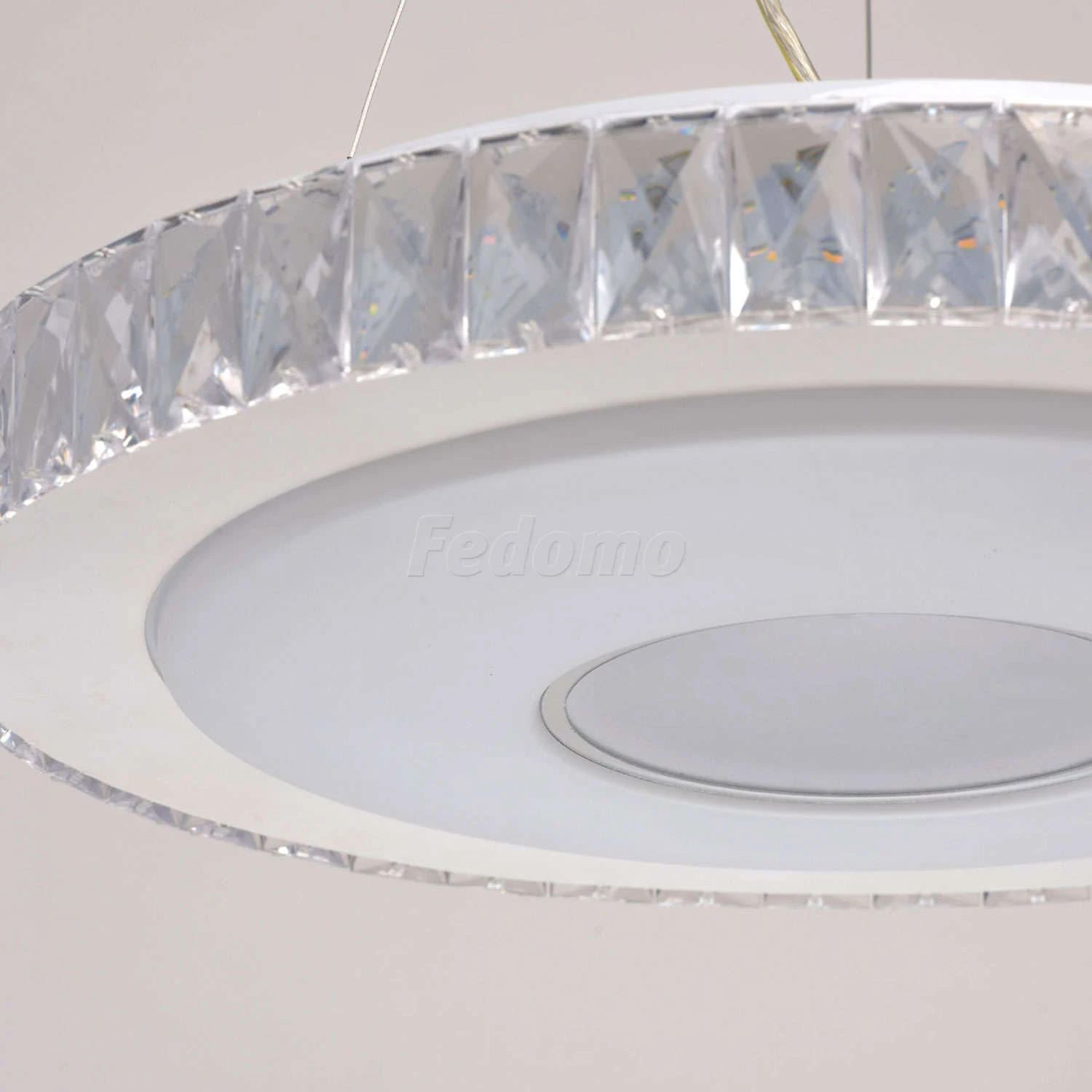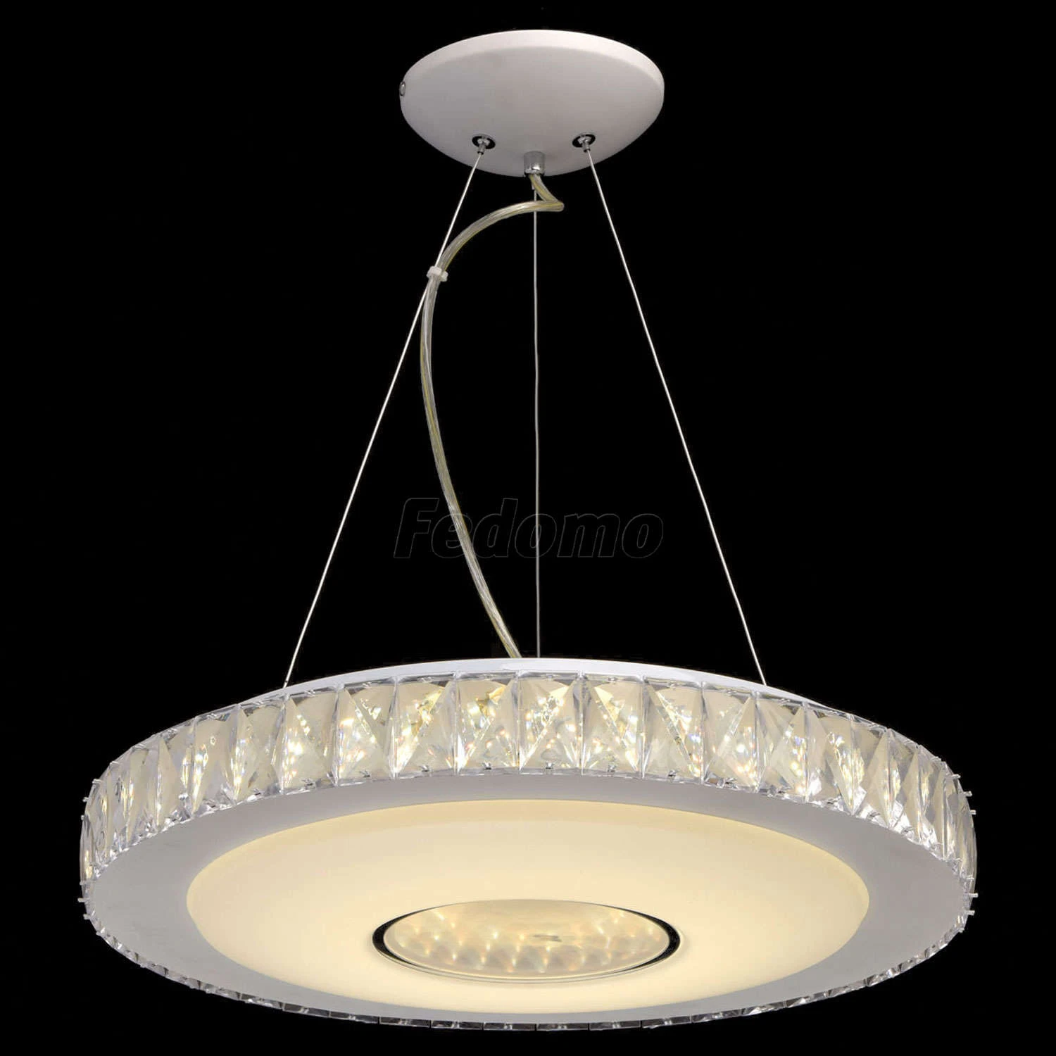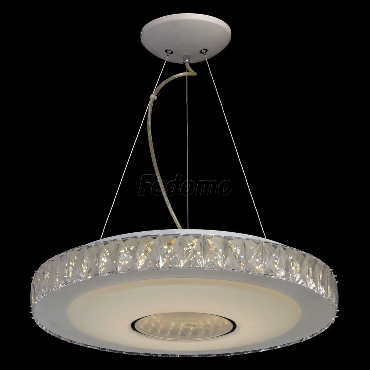 Стильный дизайн и гламурный блеск люстры из коллекции «Фризанте» приковывает взгляды. Белое металлическое основание дополнено широким акриловым плафоном того же оттенка. Он украшен объемным декором из крупного прозрачного хрусталя. Помимо этого, светильни