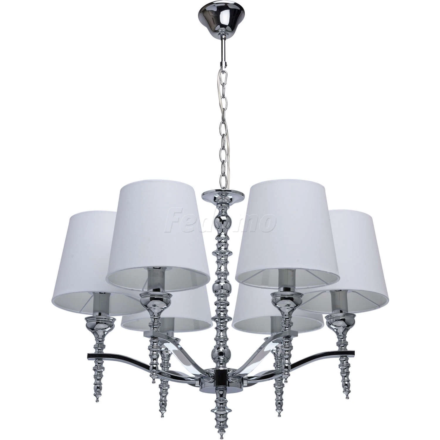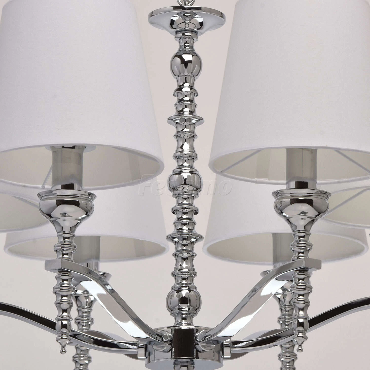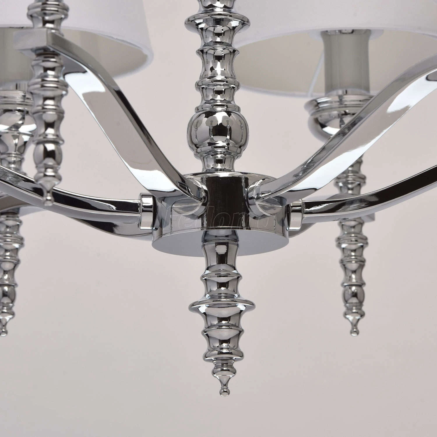 Любителям утонченных и нетривиальных композиций придется по душе люстра из коллекции «Онтарио». Основание выполнено из металла цвета хрома и создает гармоничный дуэт с элегантными тканевыми абажурами белого оттенка. Интересен оригинальный декор в виде кру