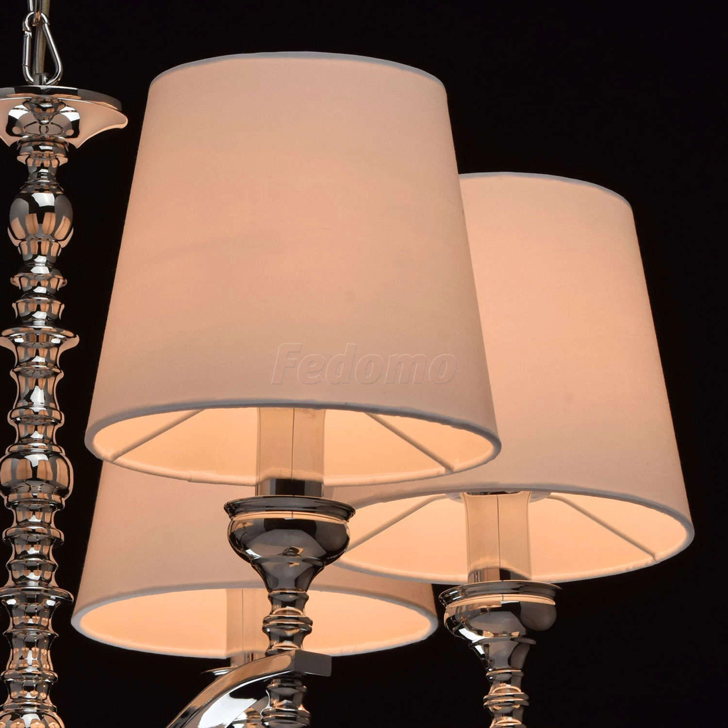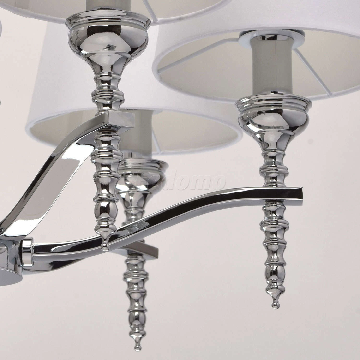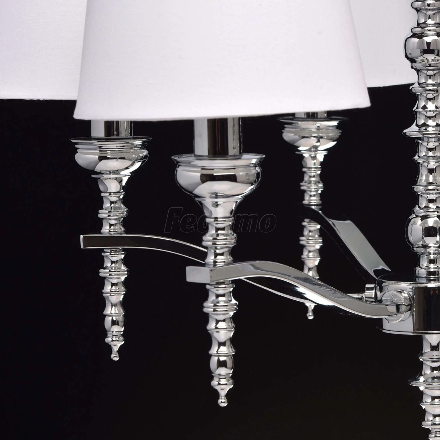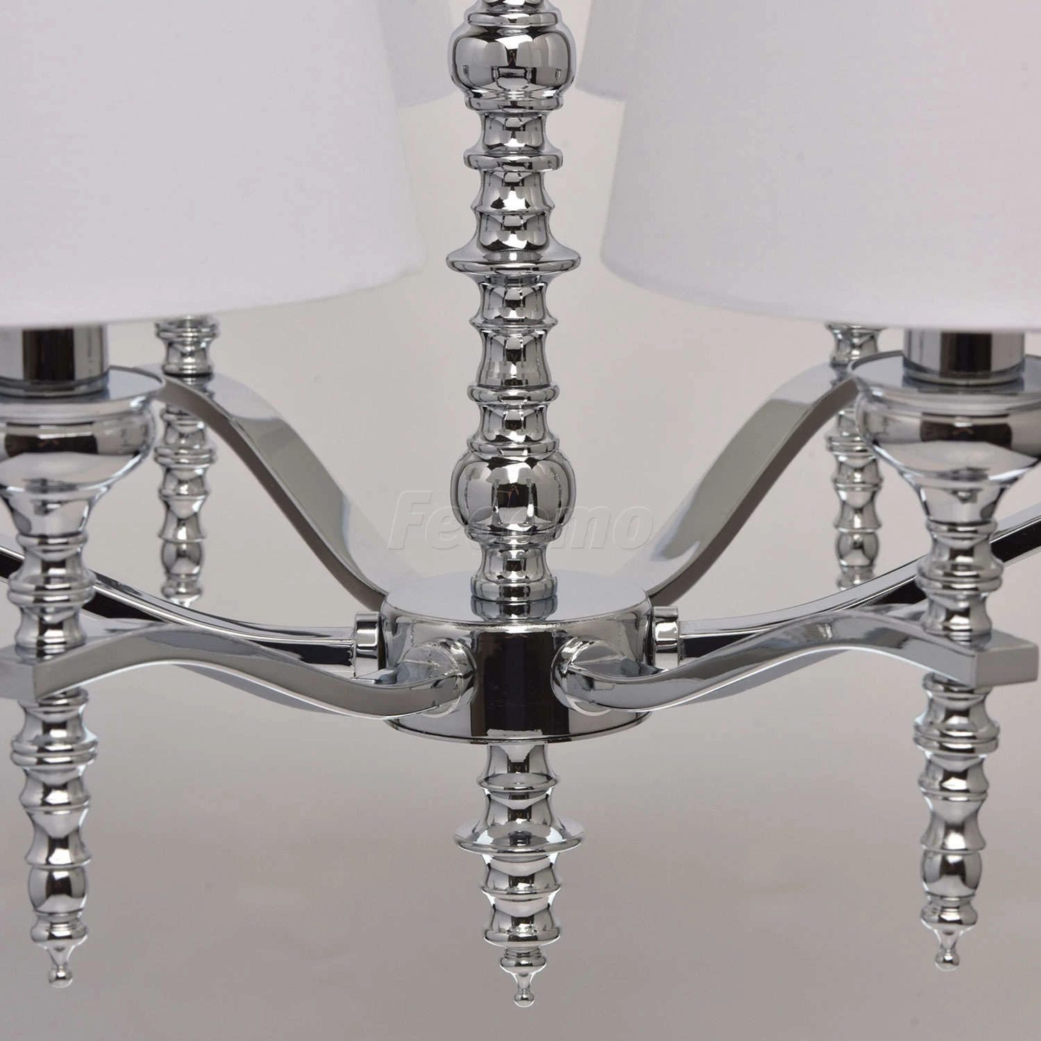Любителям утонченных и нетривиальных композиций придется по душе люстра из коллекции «Онтарио». Основание выполнено из металла цвета хрома и создает гармоничный дуэт с элегантными тканевыми абажурами белого оттенка. Интересен оригинальный декор в виде кру