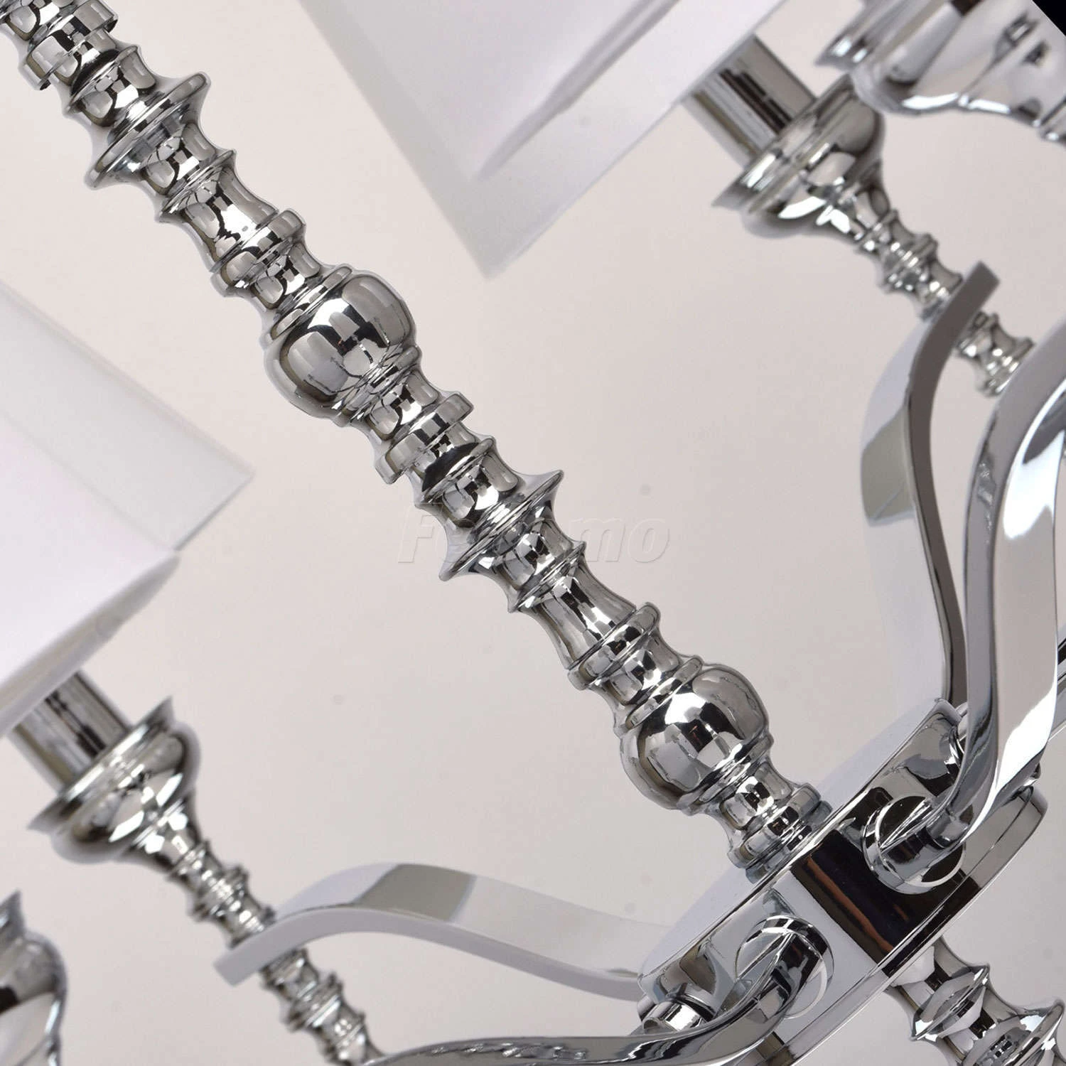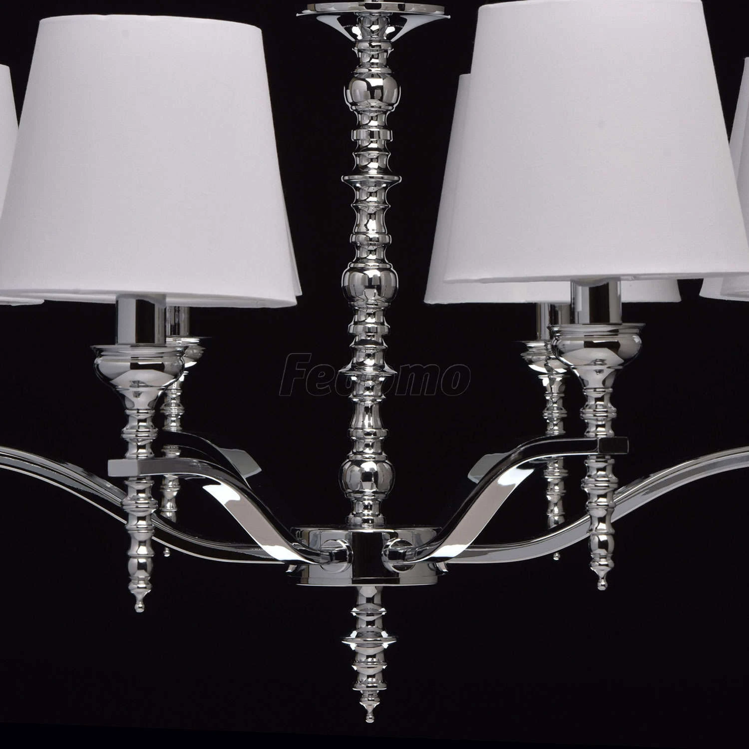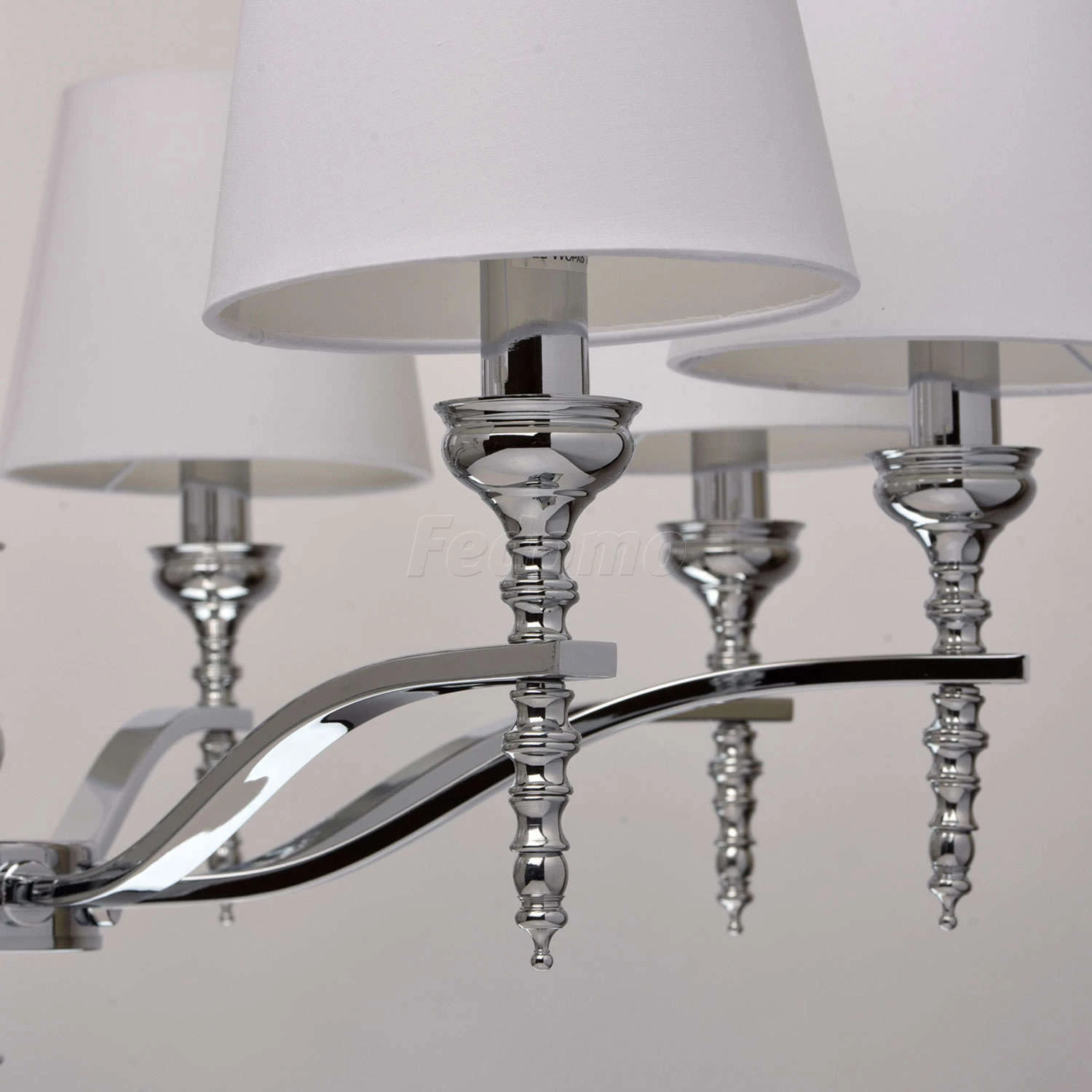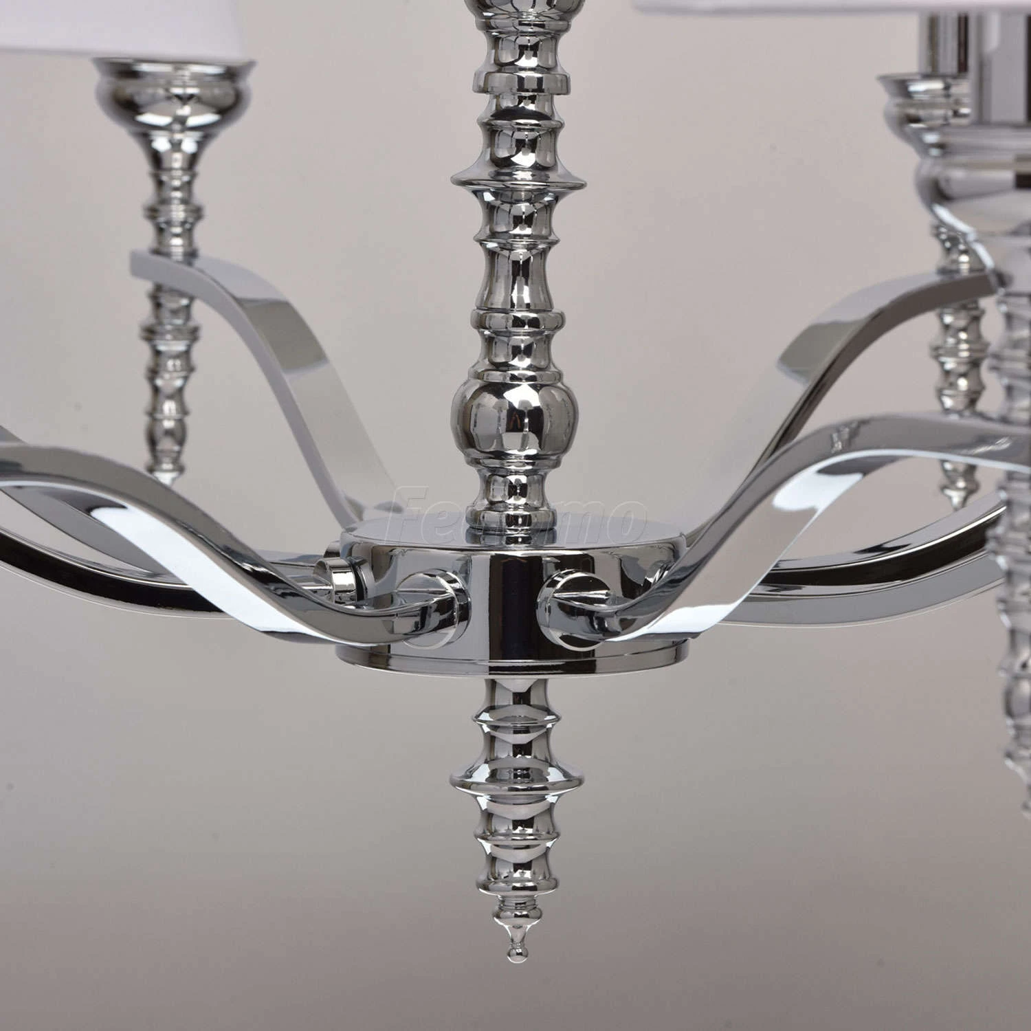 Любителям утонченных и нетривиальных композиций придется по душе люстра из коллекции «Онтарио». Основание выполнено из металла цвета хрома и создает гармоничный дуэт с элегантными тканевыми абажурами белого оттенка. Интересен оригинальный декор в виде кру