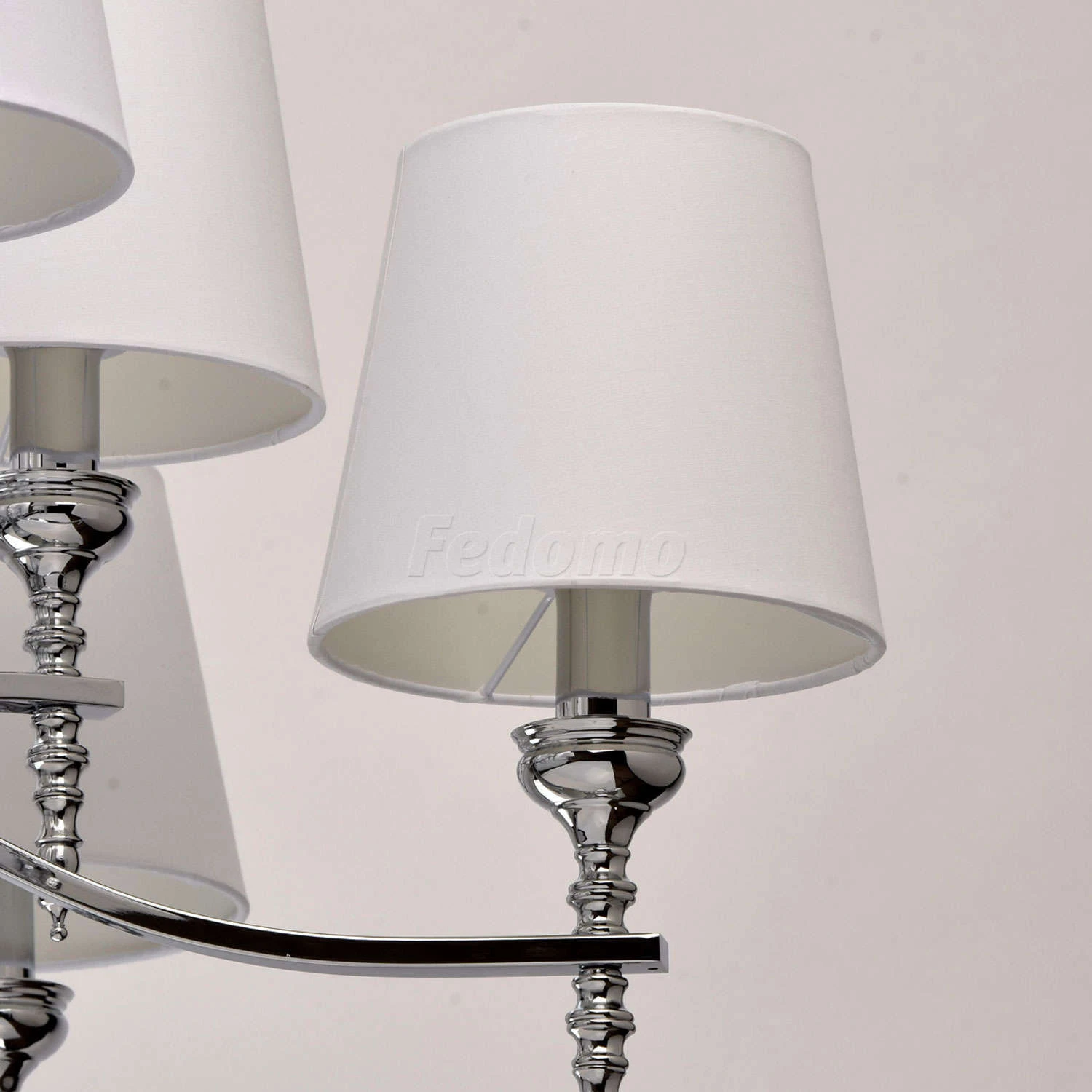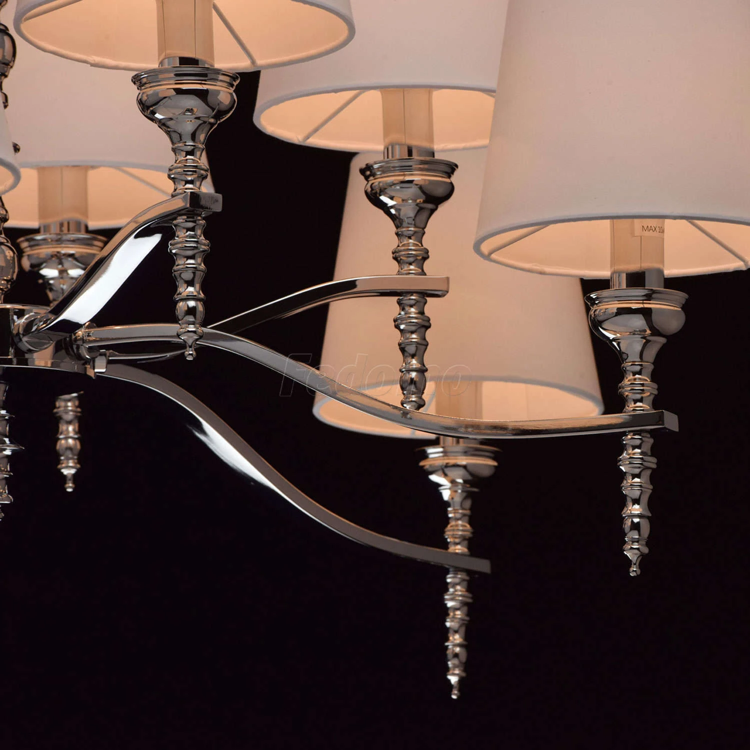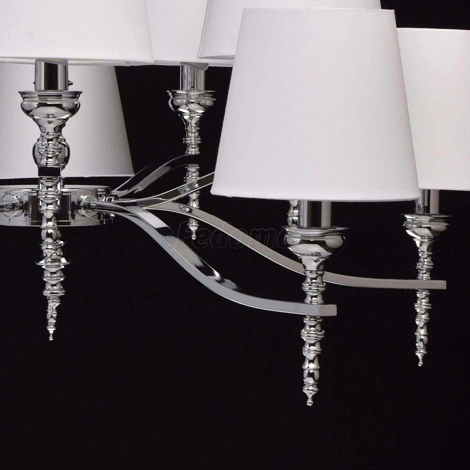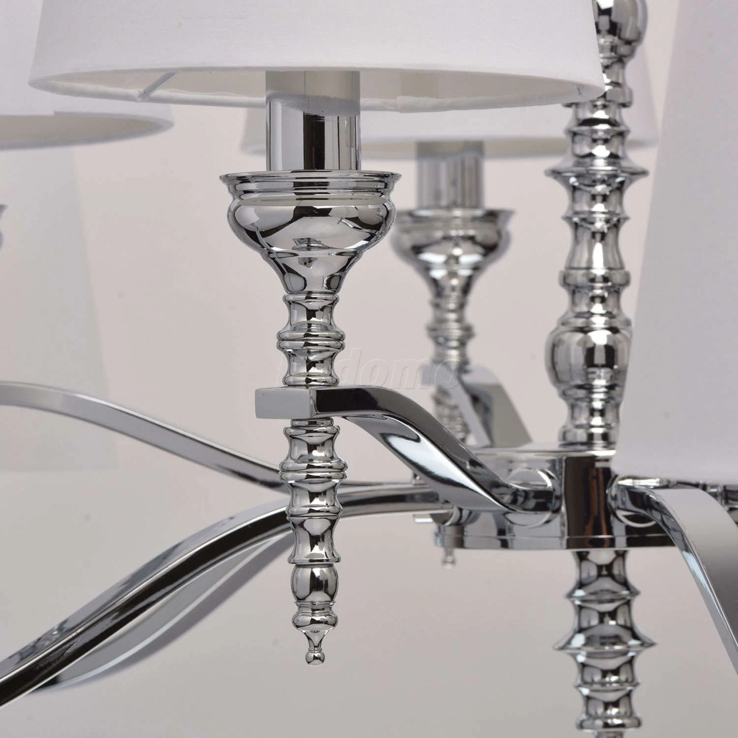 Любителям утонченных и нетривиальных композиций придется по душе люстра из коллекции «Онтарио». Основание выполнено из металла цвета хрома и создает гармоничный дуэт с элегантными тканевыми абажурами белого оттенка. Интересен оригинальный декор в виде кру