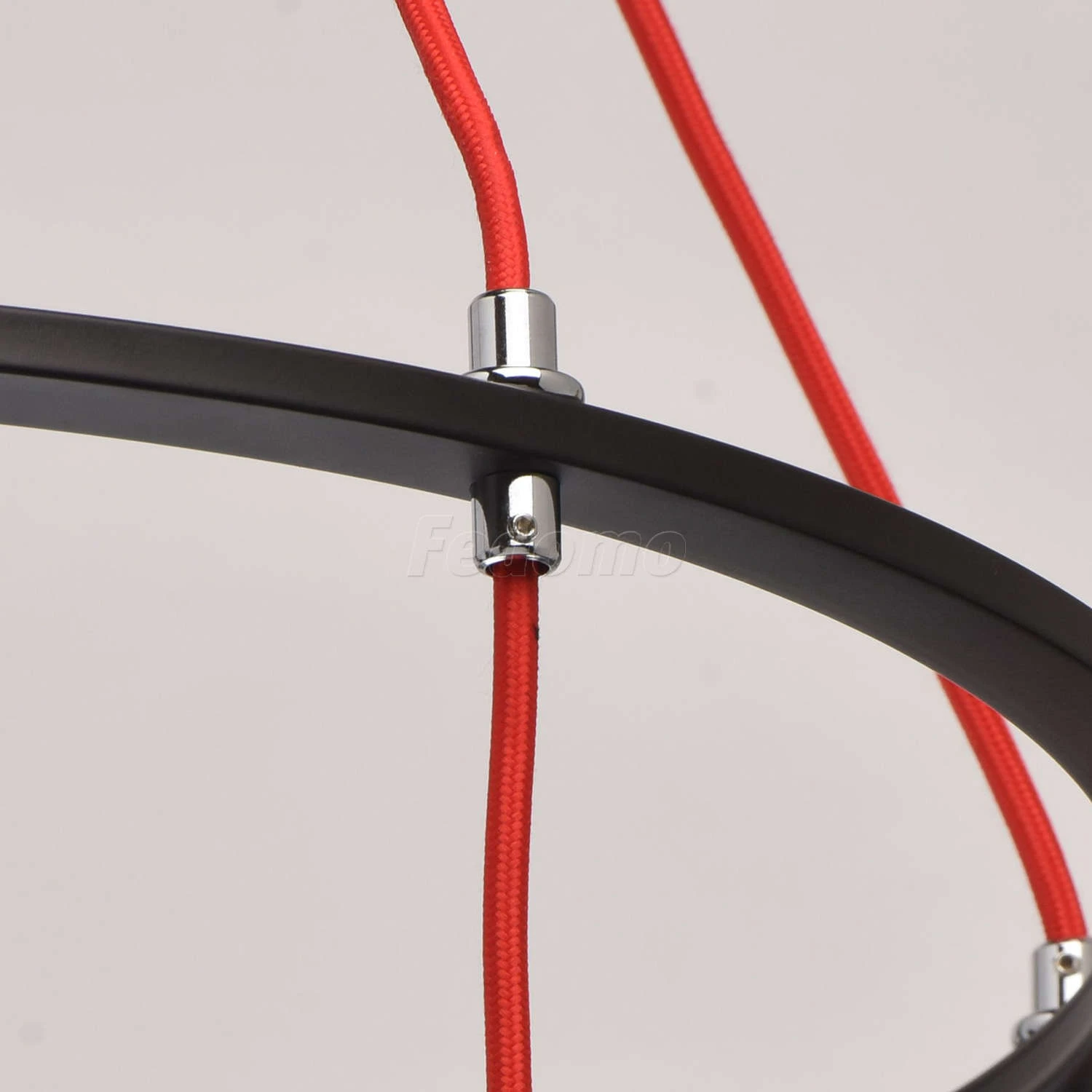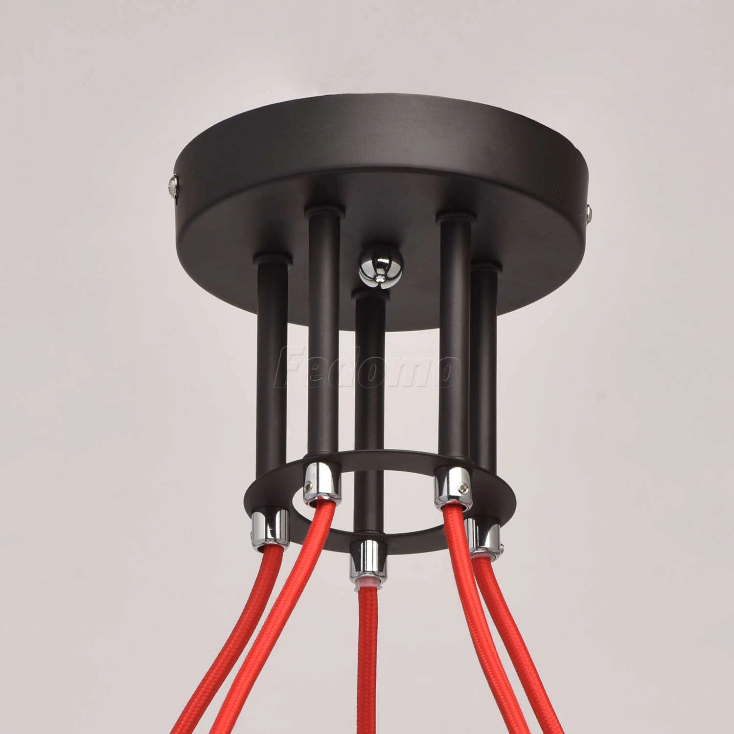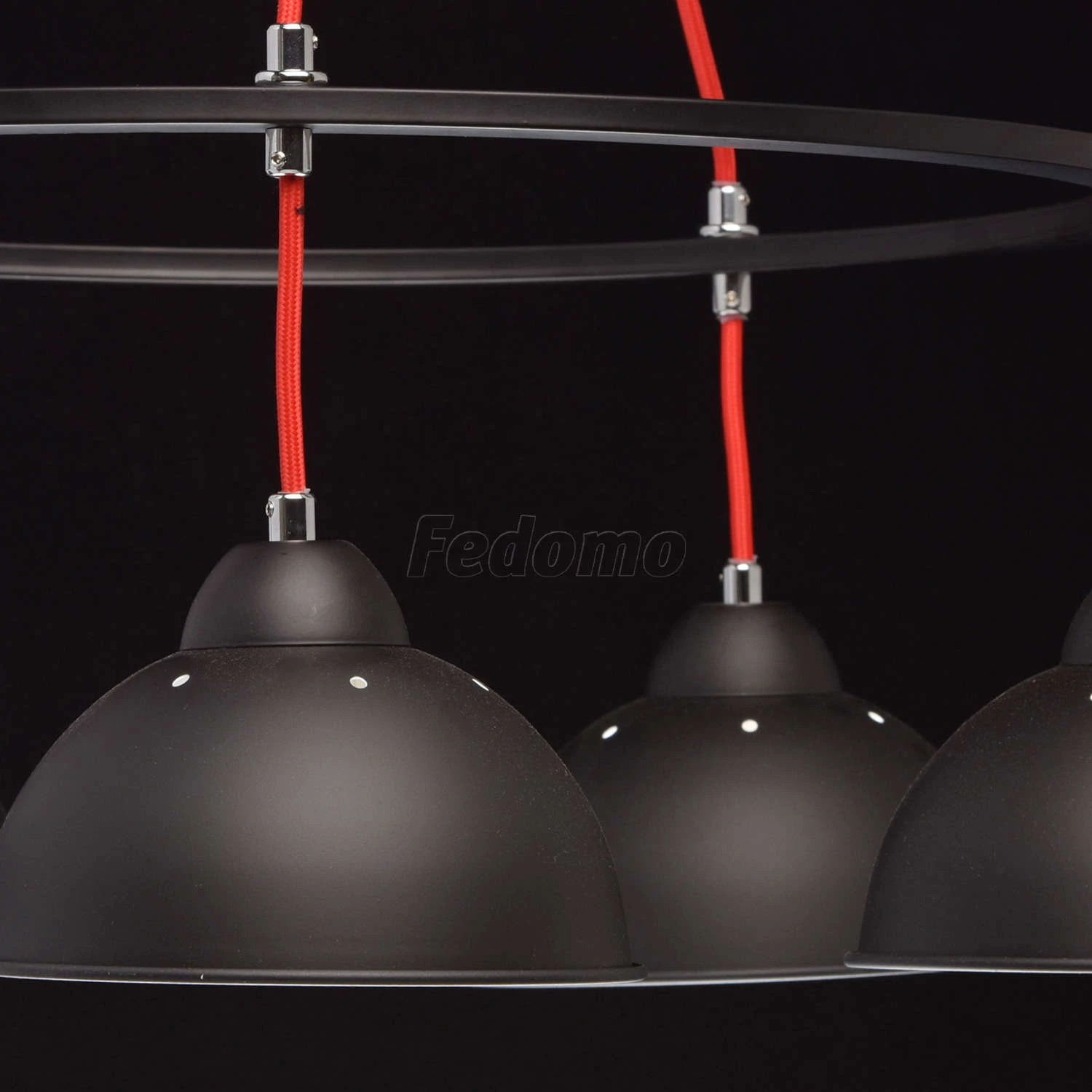 Люстра из коллекции \Формула" привлекает яркими сочетаниями и оригинальным воплощением. Металлическое основание и плафоны выполнены в классиечском чёрном оттенке. Тёмный тон разбавляют контрастные текситльные шнуры красного цвета - получается эффектный, н""