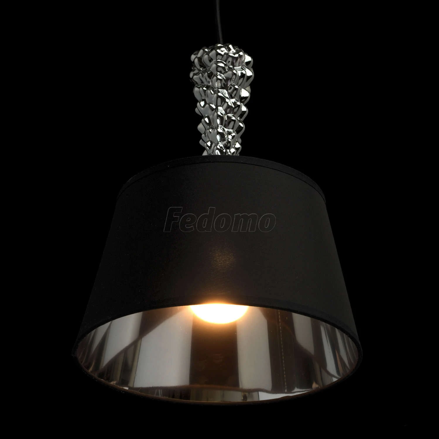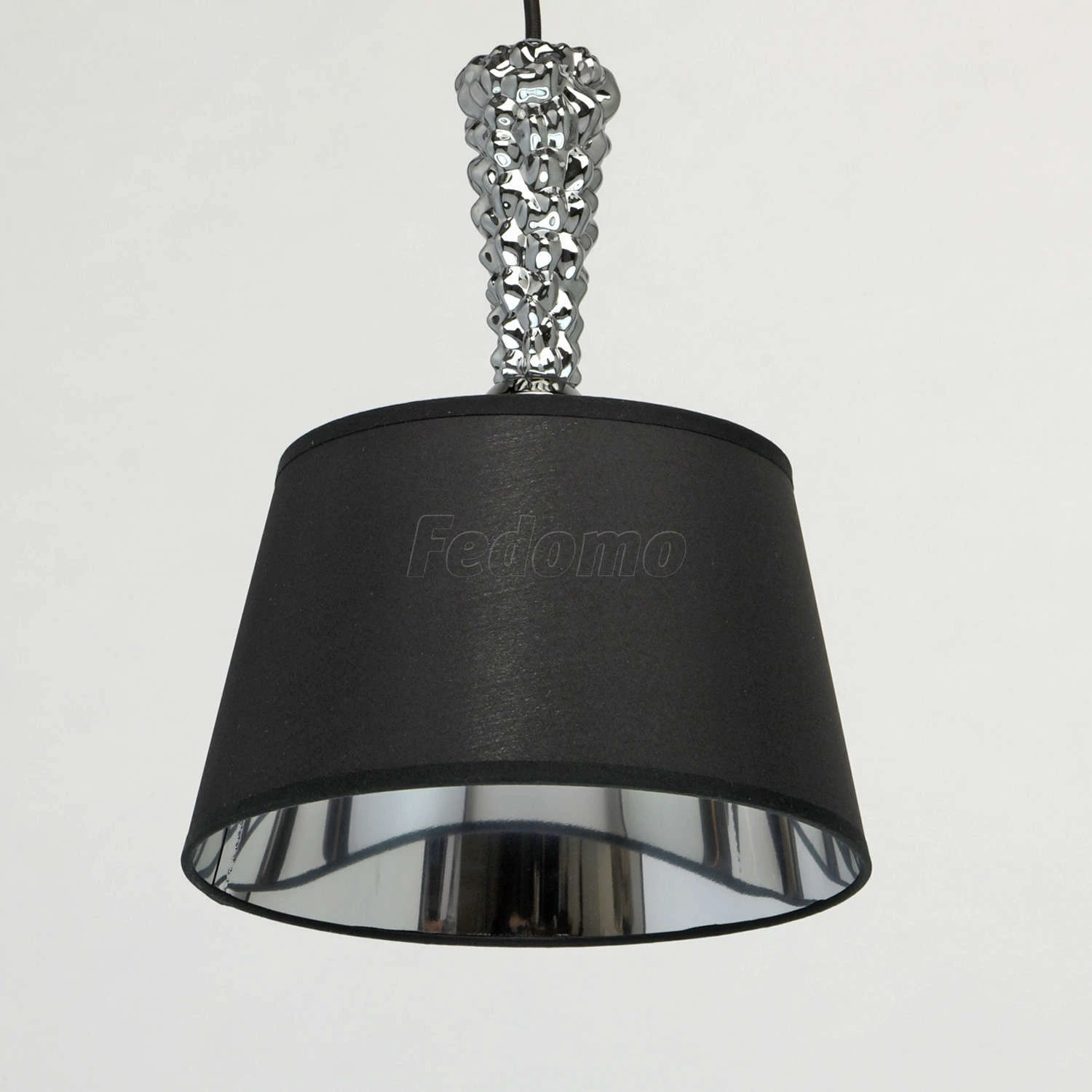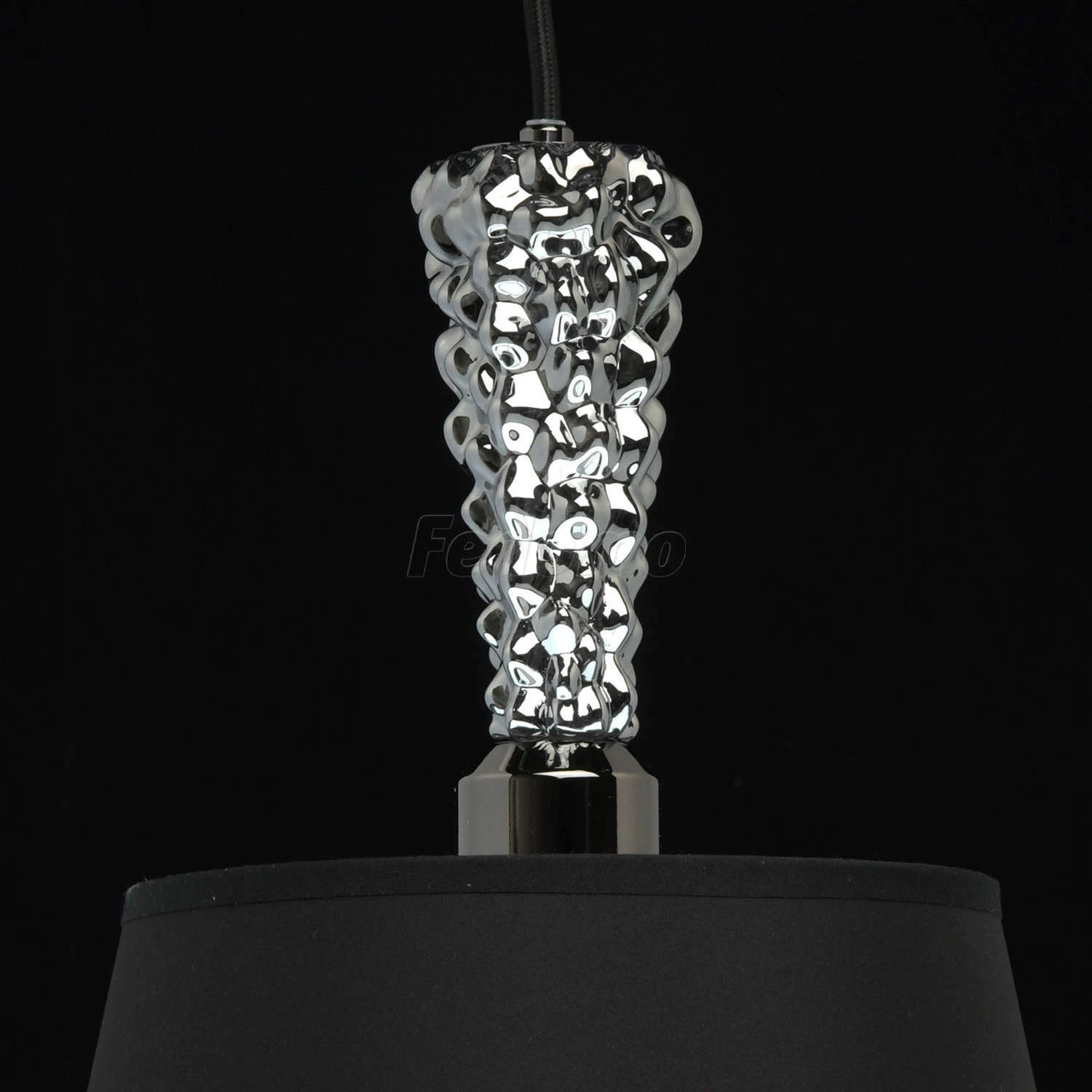 Глубина и загадочность чёрного оттенка придает этой люстре особое очарование. Хромированное металлическое основание идеально сочетается с оригинальным текстильным абажуром: снаружи он выполнен в матовом чёрном цвете, а изнутри подчеркнут вставкой из акрил