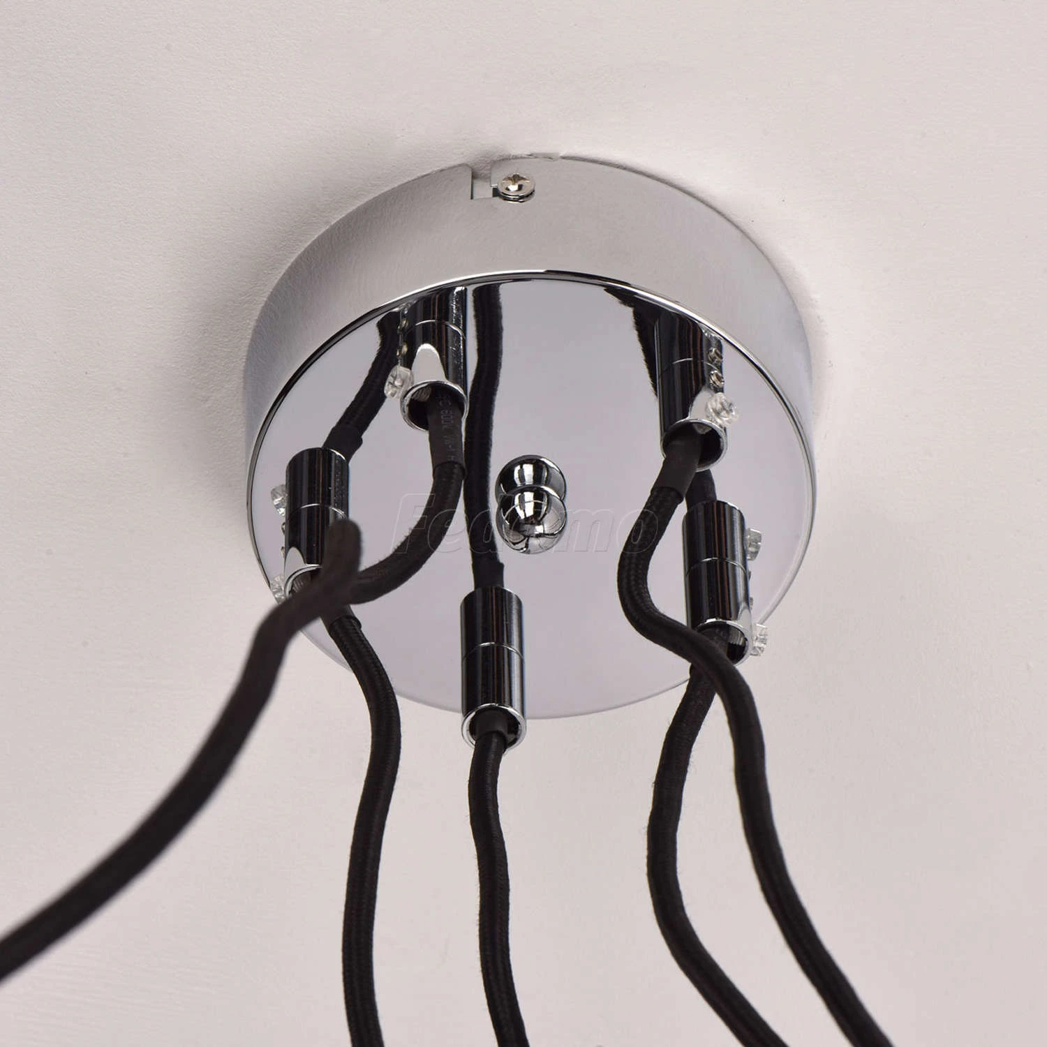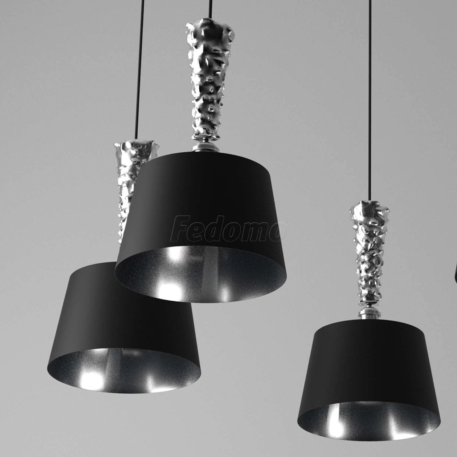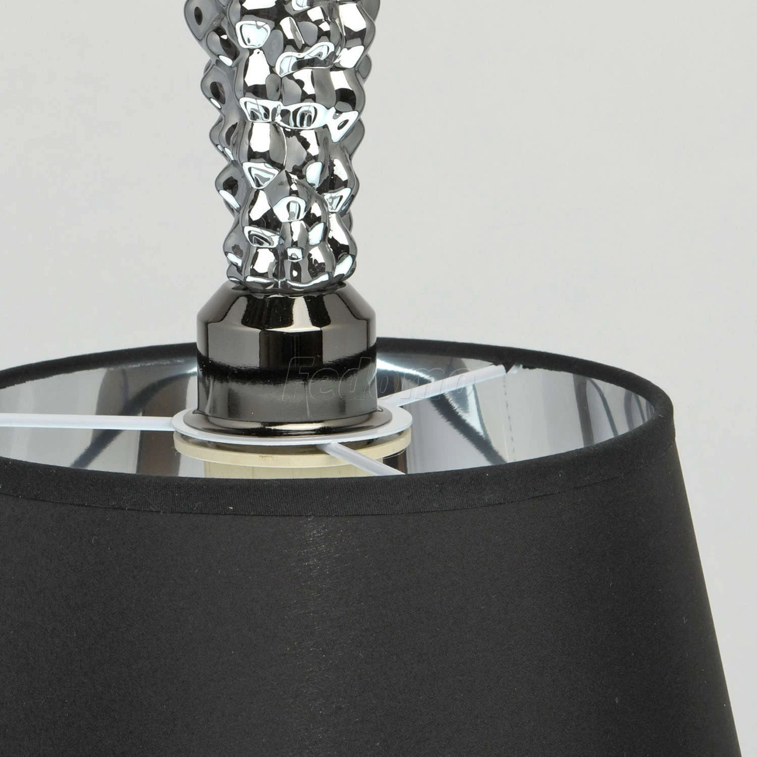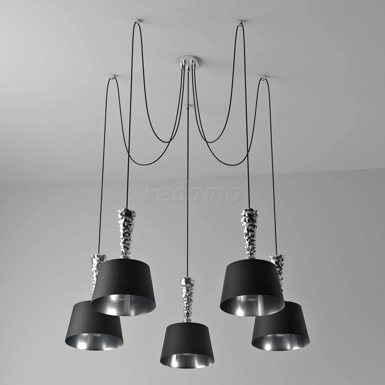 Глубина и загадочность чёрного оттенка придает этой люстре особое очарование. Хромированное металлическое основание идеально сочетается с оригинальным текстильным абажуром: снаружи он выполнен в матовом чёрном цвете, а изнутри подчеркнут вставкой из акрил